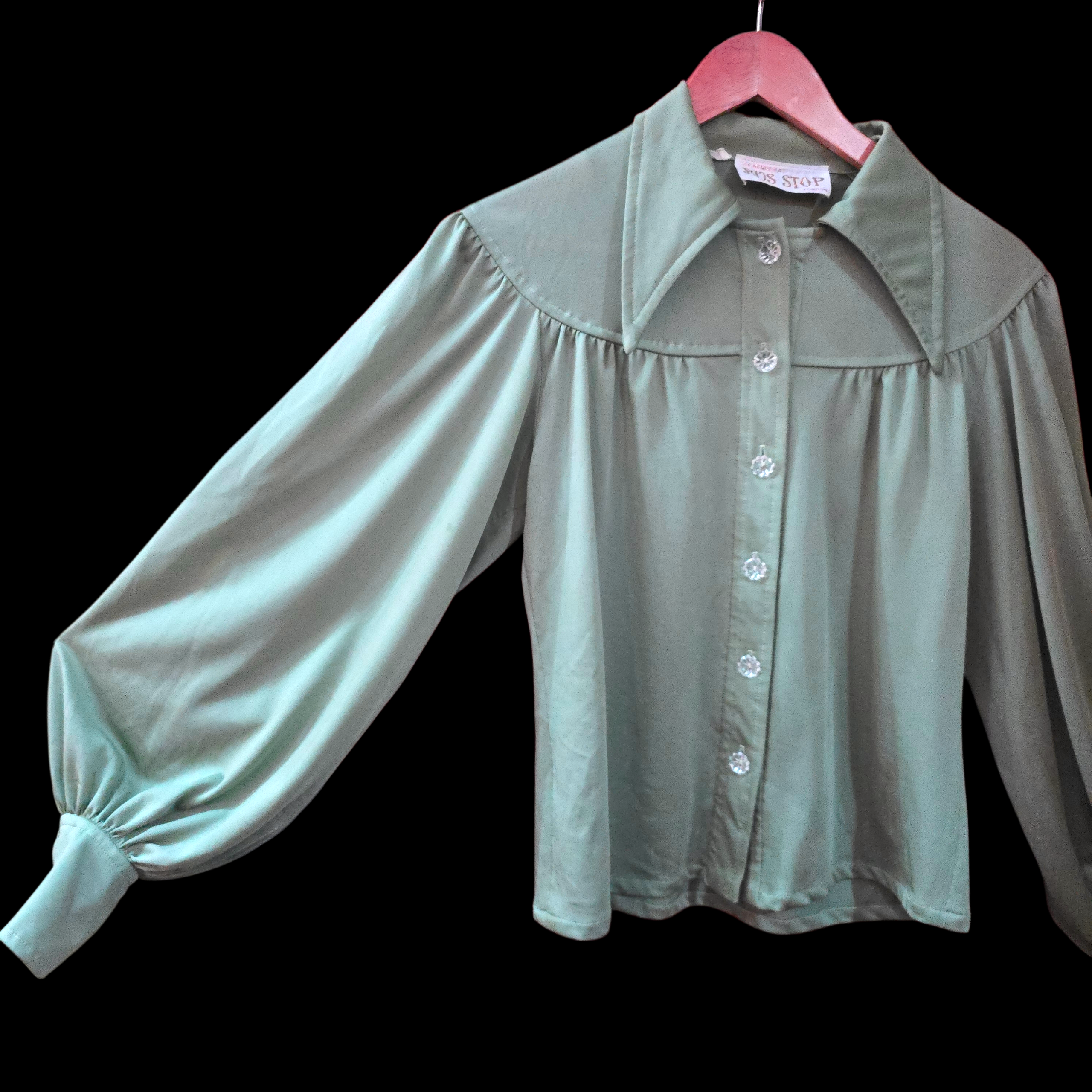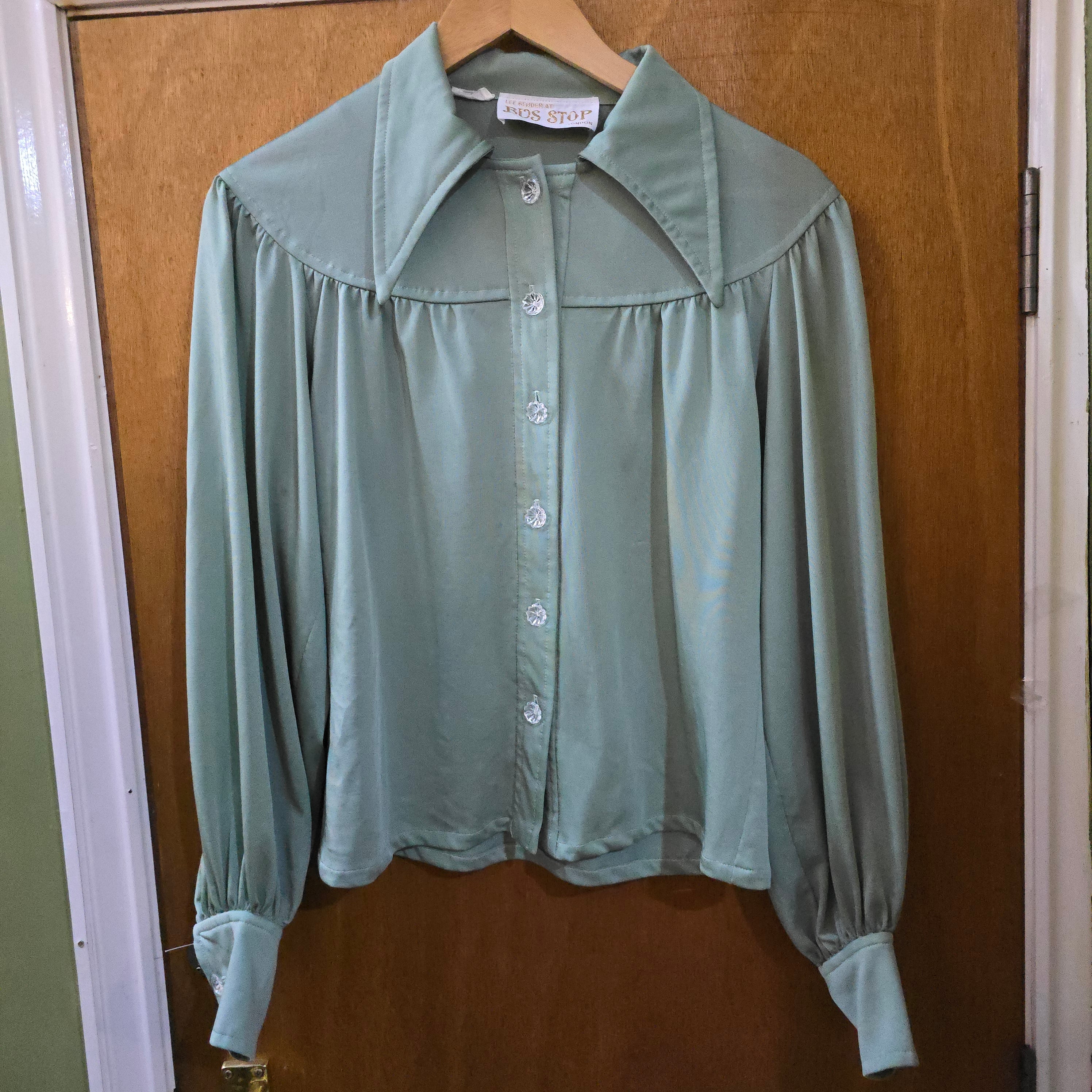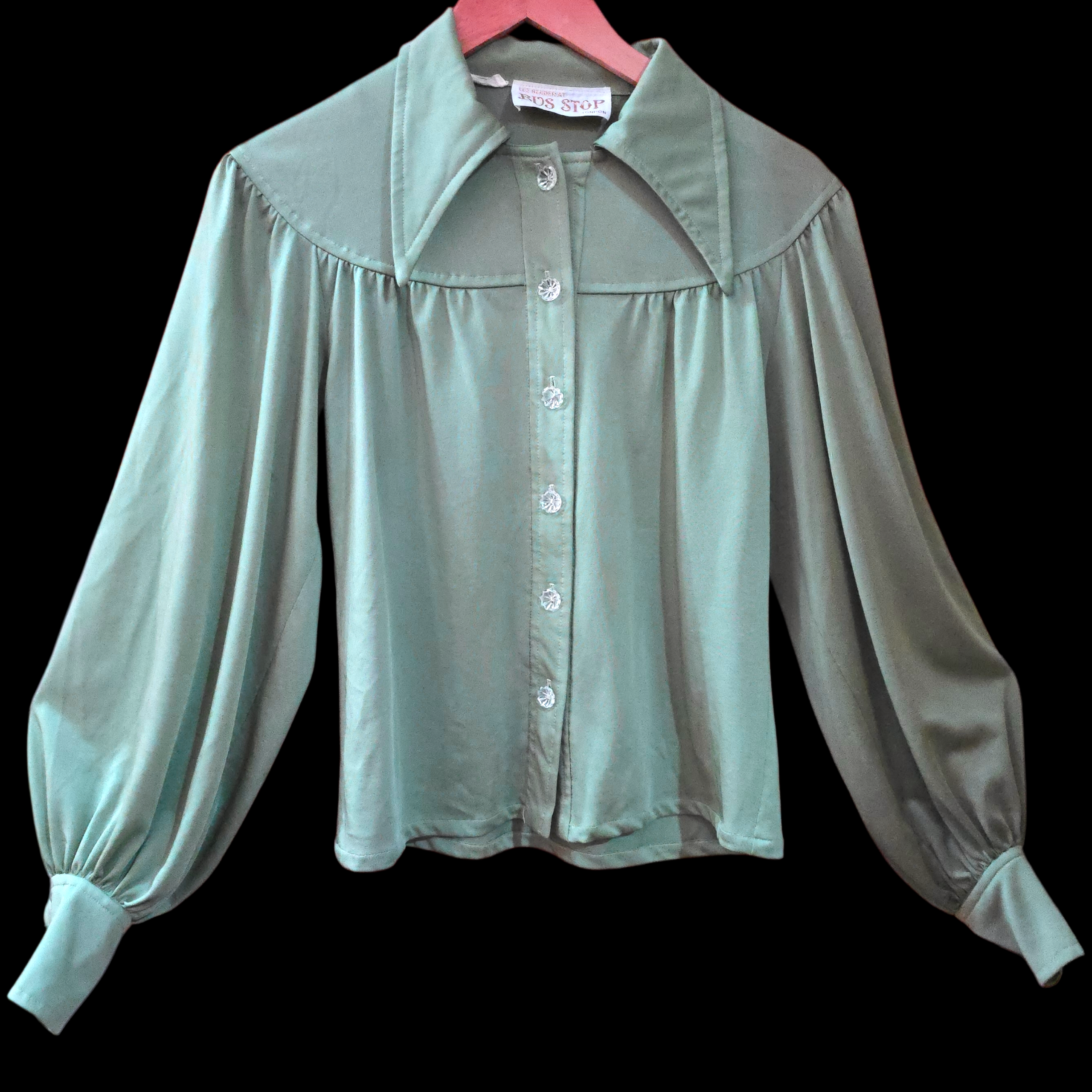Original Lee Bender at Bus Stop 70s does 30s peppermint green blouse - S/MWith statement dagger collars, balloon sleeves and decorative buttons - it really looks like its straight out of the 1930s but as its cut from slinky polyester jersey, it can be washed easily in the machine machine!