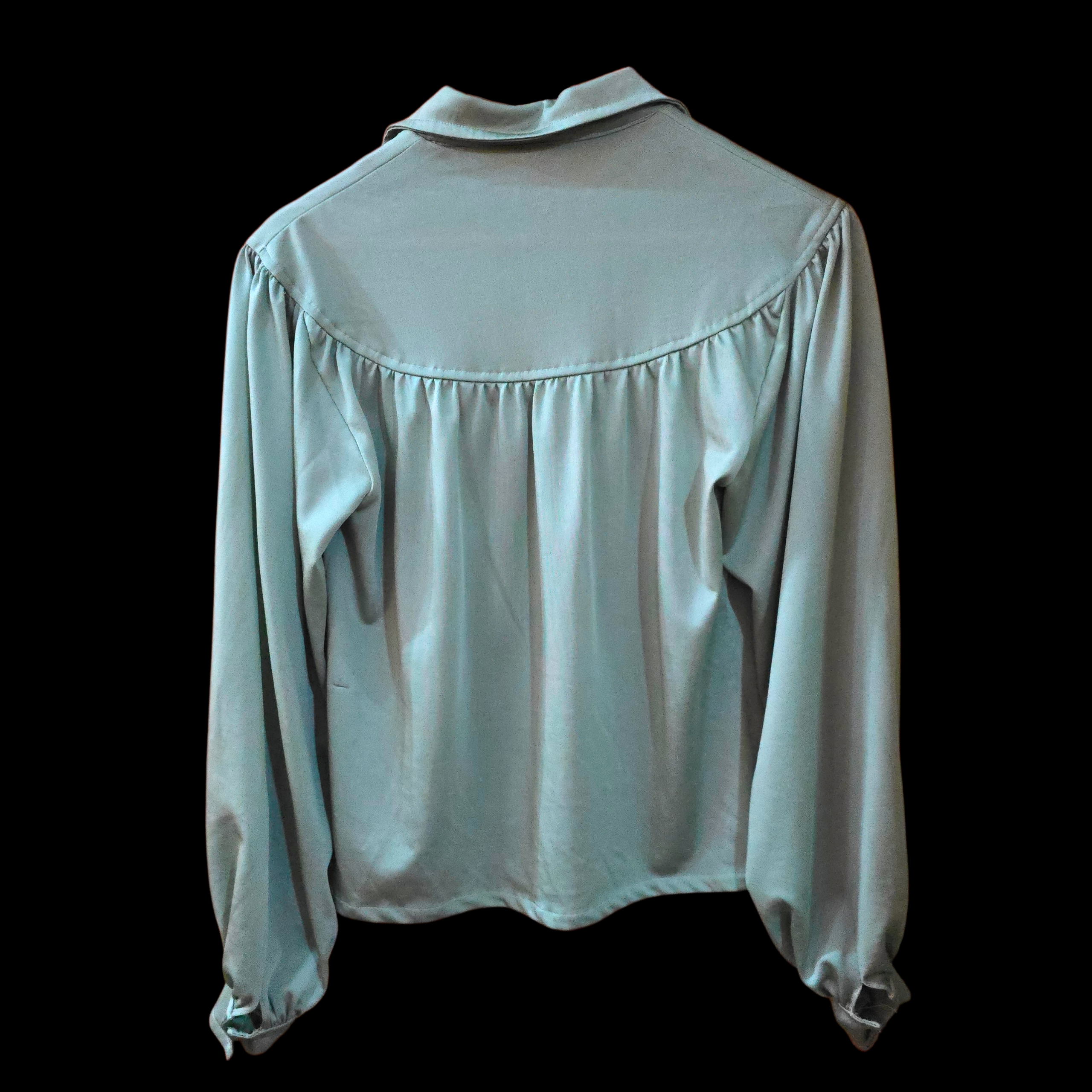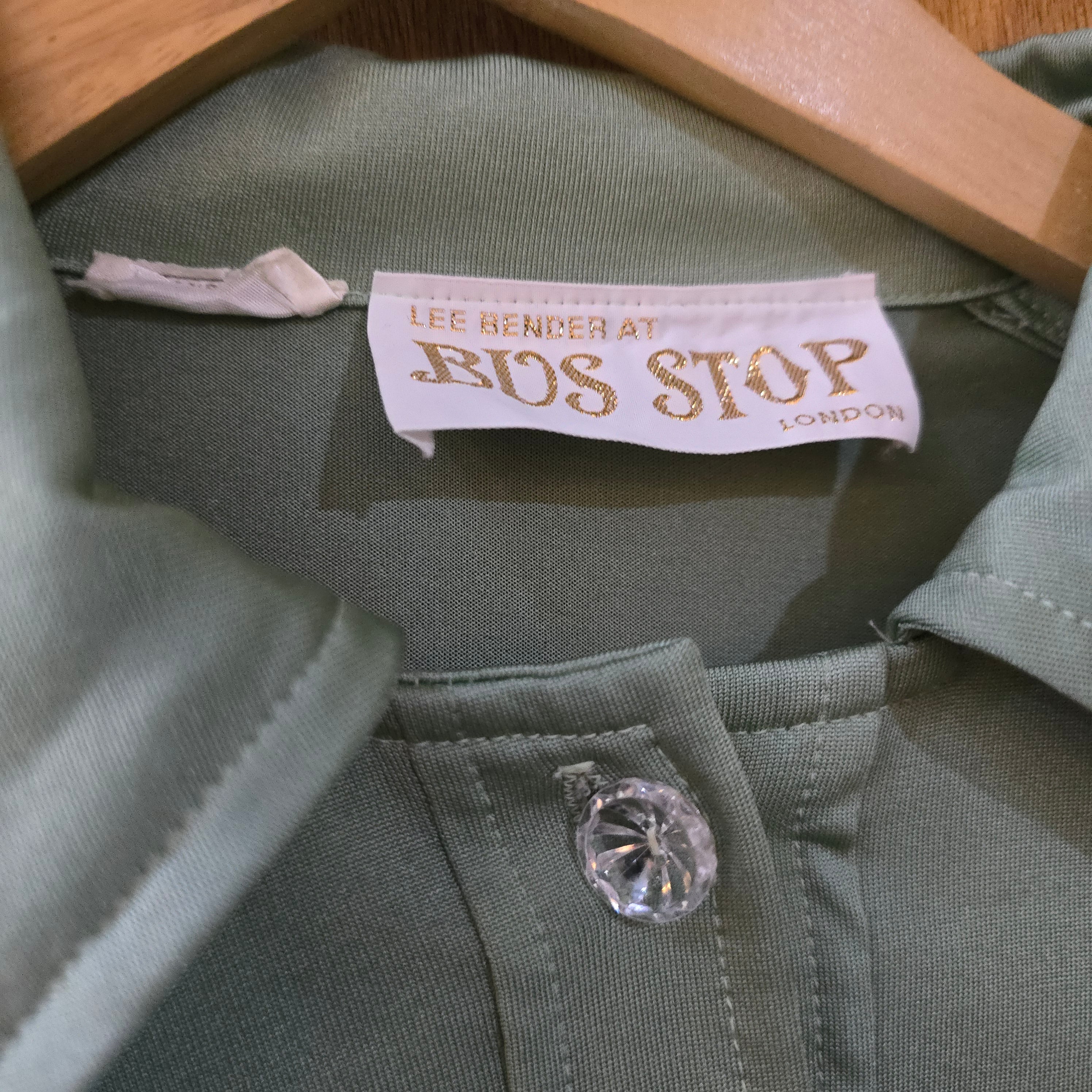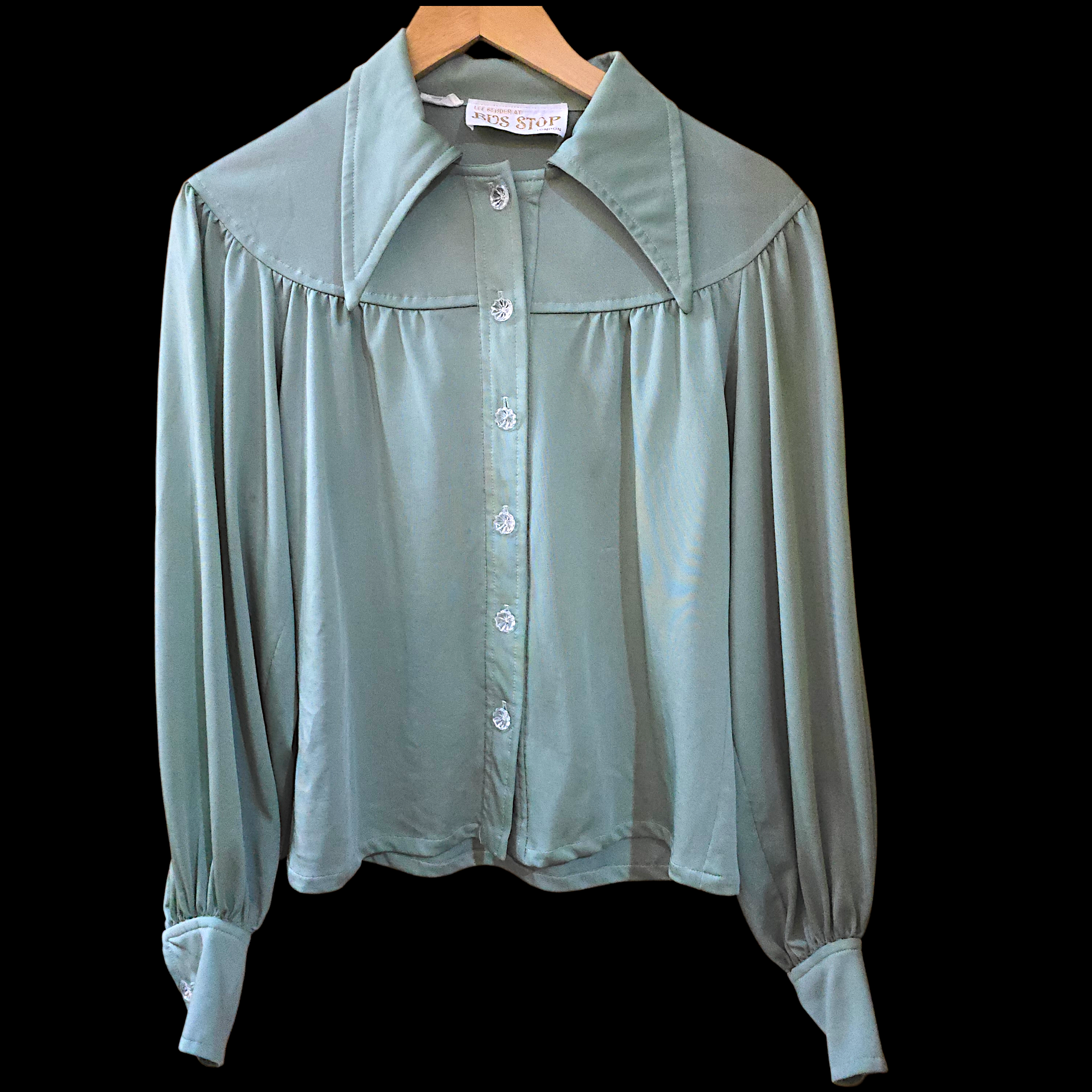 Original Lee Bender at Bus Stop 70s does 30s peppermint green blouse - S/MWith statement dagger collars, balloon sleeves and decorative buttons - it really looks like its straight out of the 1930s but as its cut from slinky polyester jersey, it can be washed easily in the machine machine!