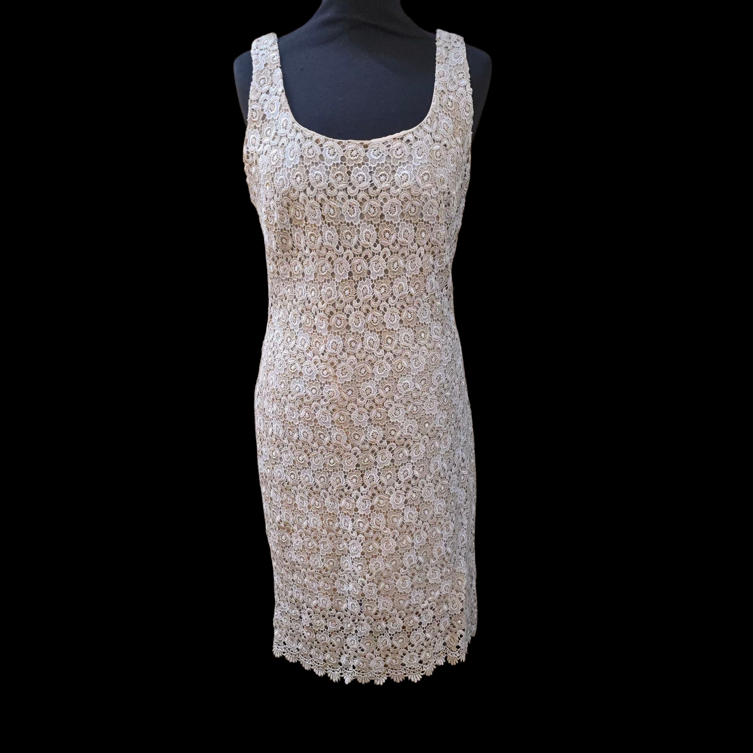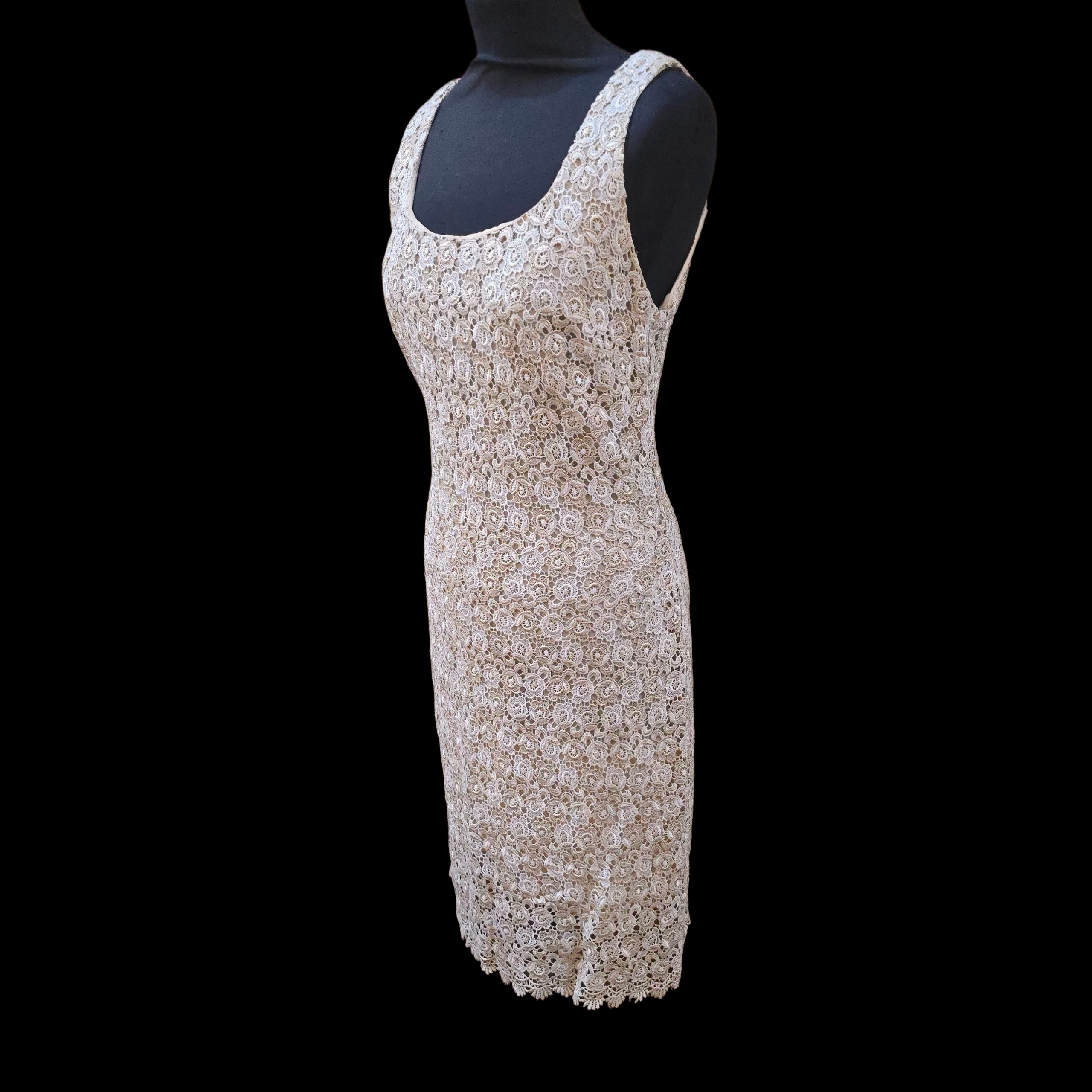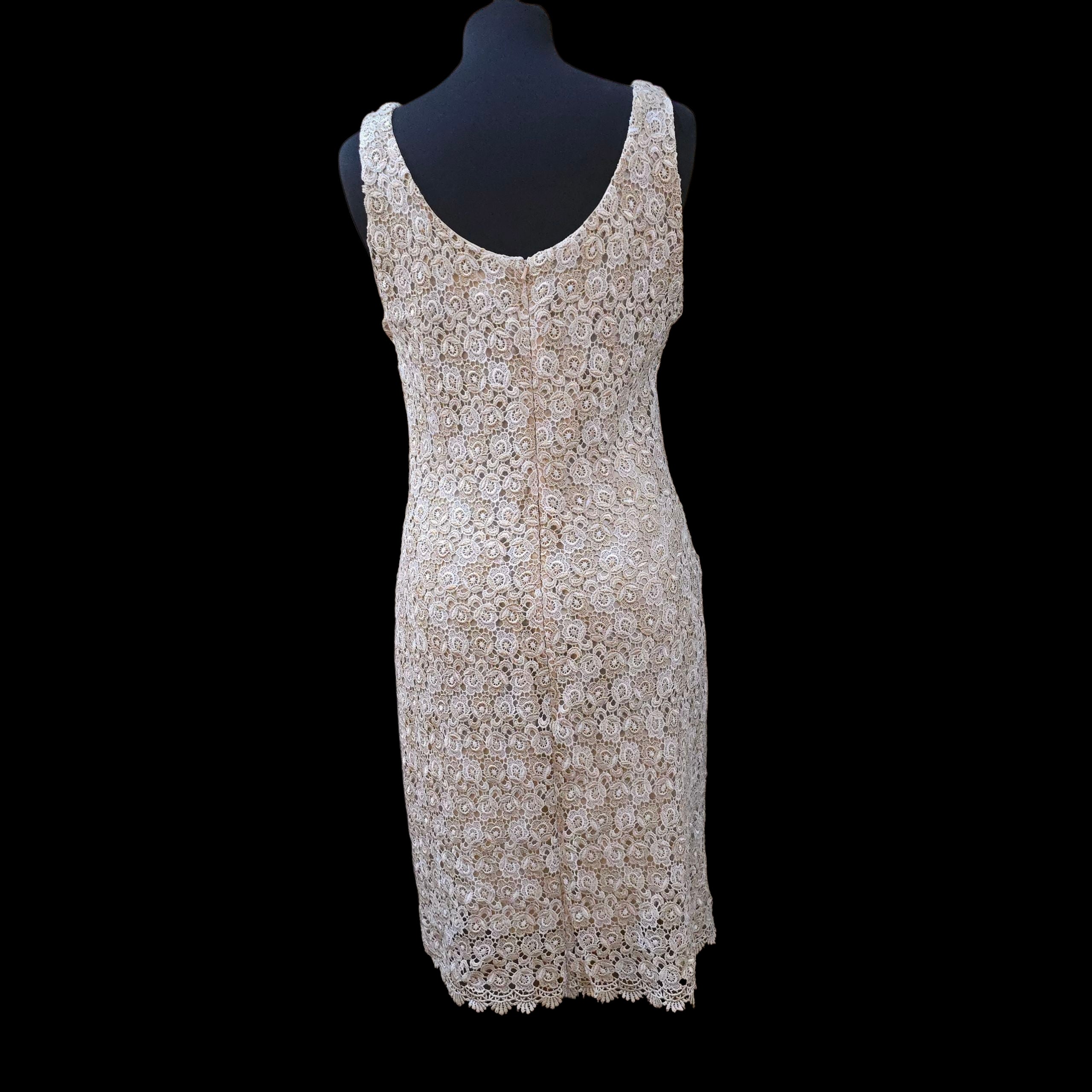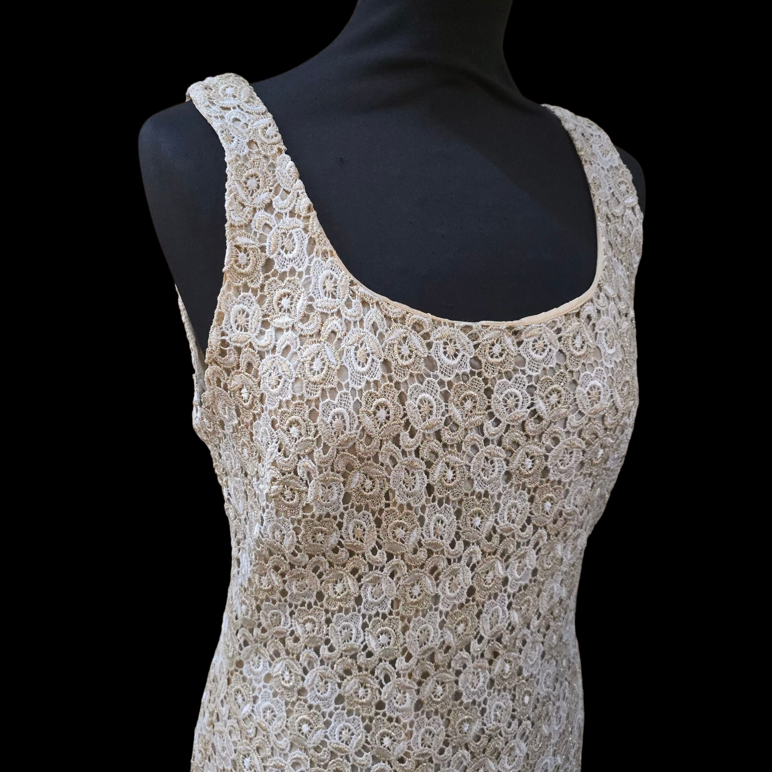 Really pretty sleeveless shift dress in a white floral Crochet thats intertwined with glittery cool Gold lurex flowers over a nude acetate lining