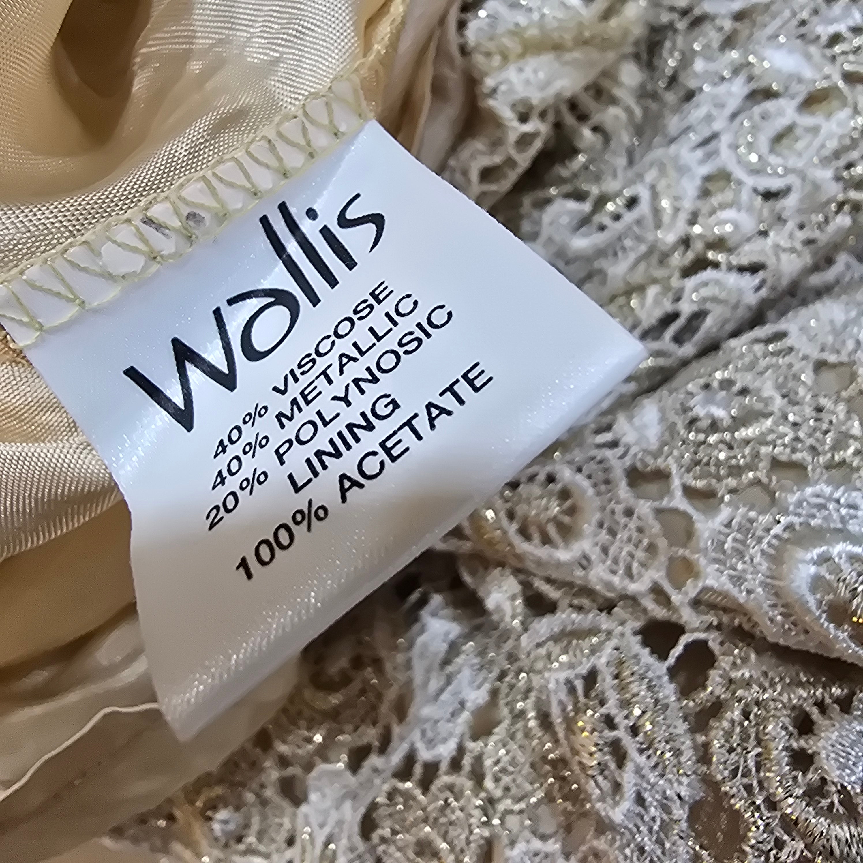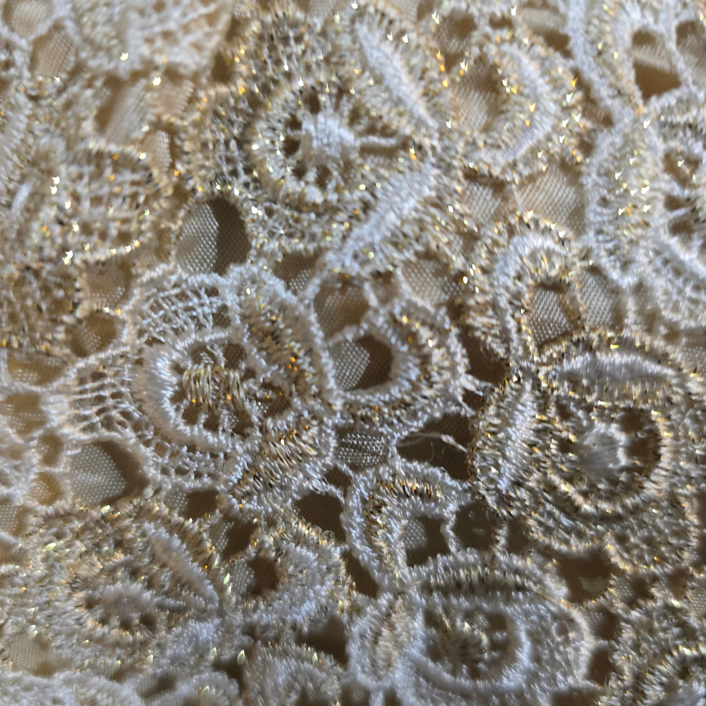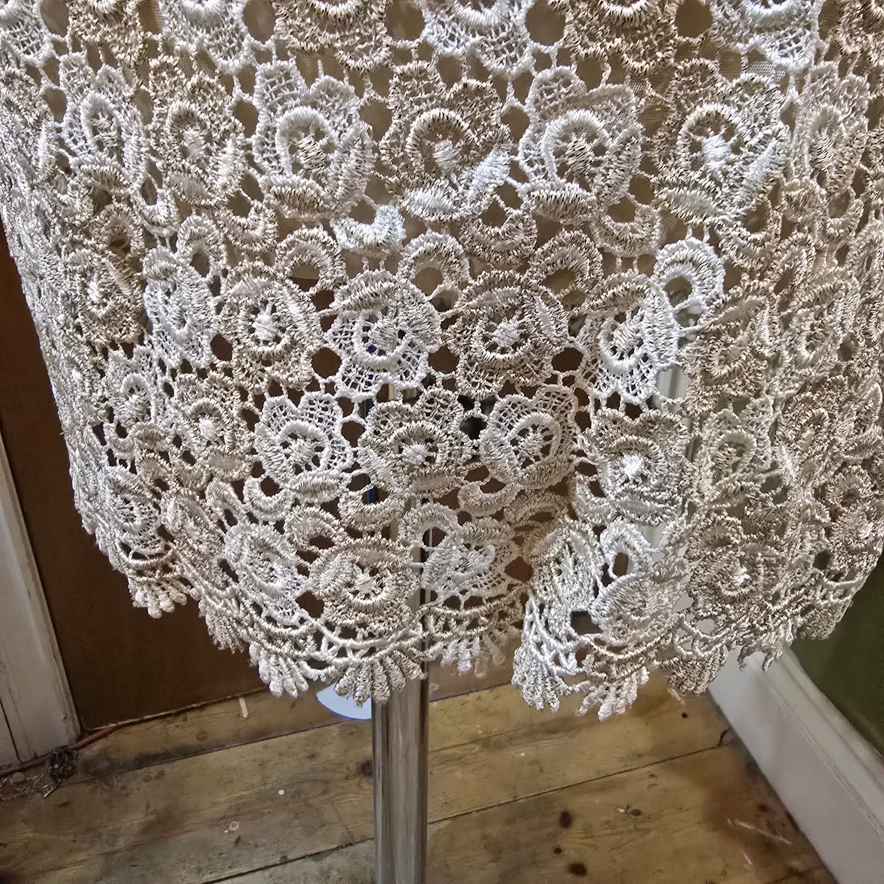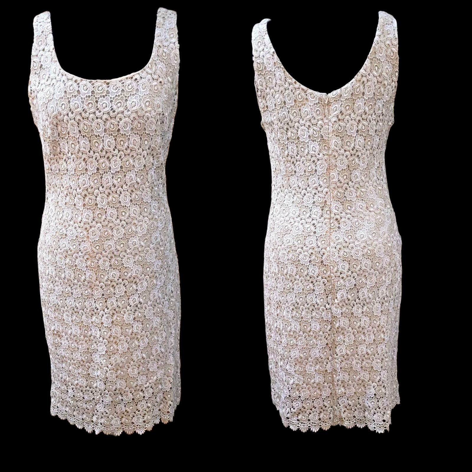 Really pretty sleeveless shift dress in a white floral Crochet thats intertwined with glittery cool Gold lurex flowers over a nude acetate lining