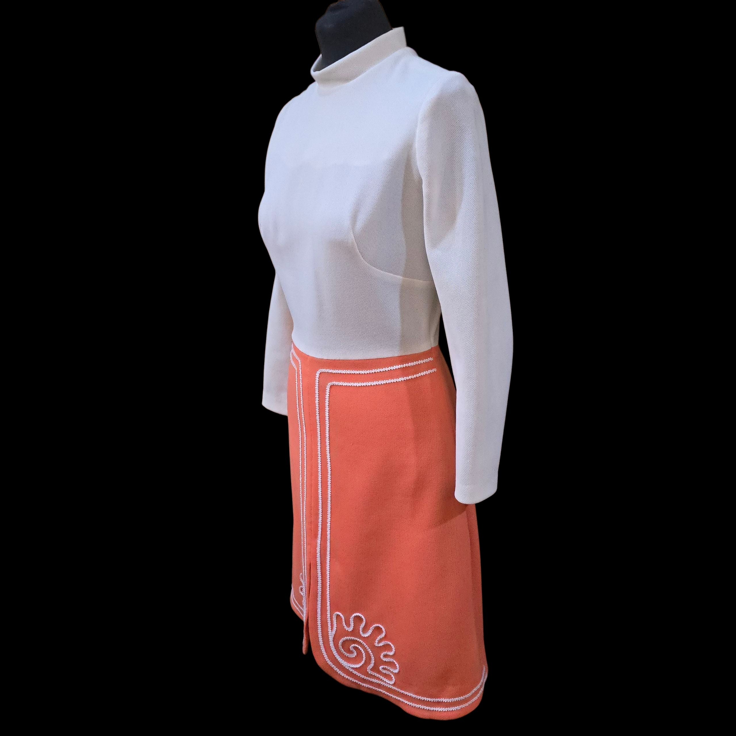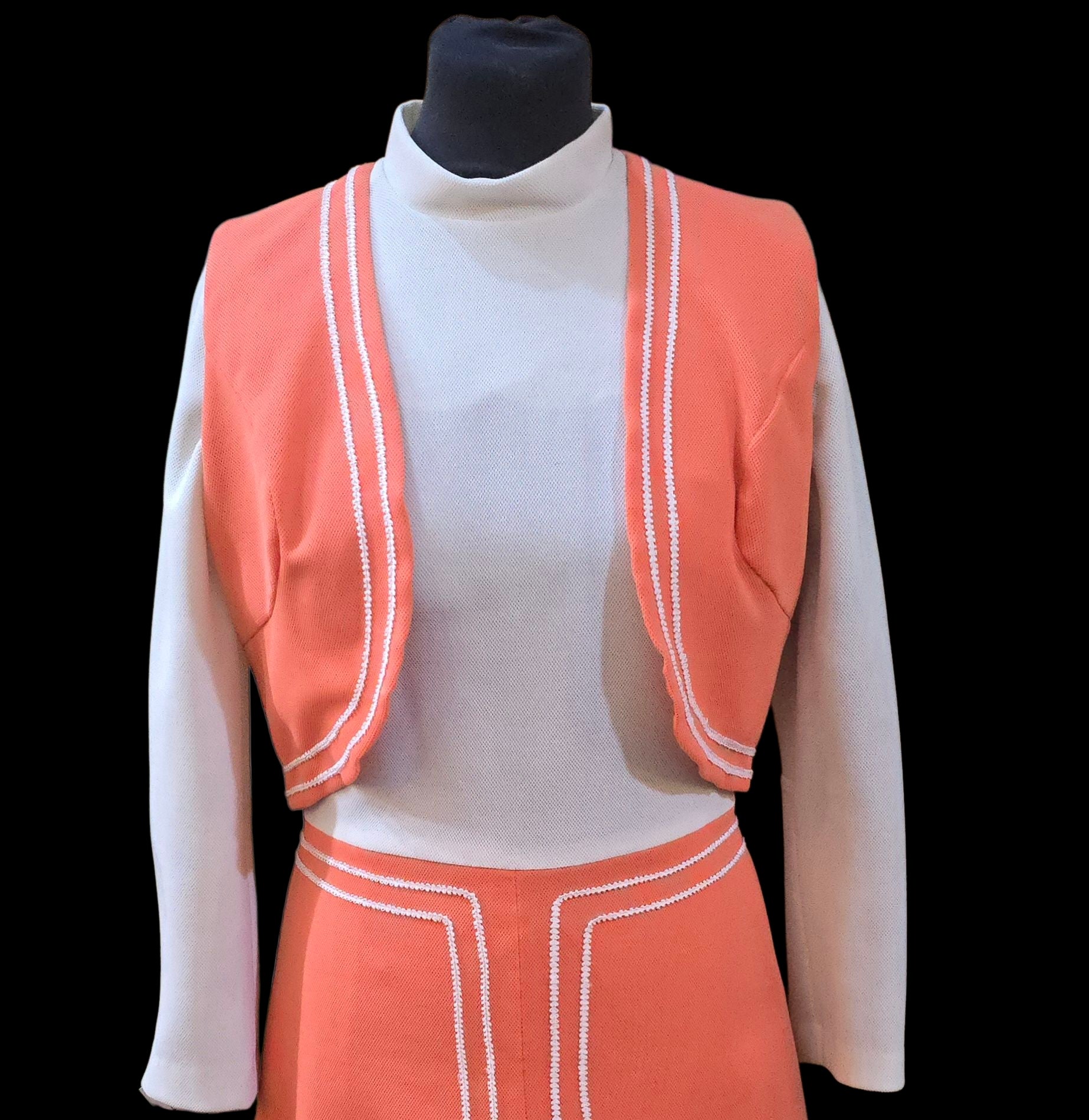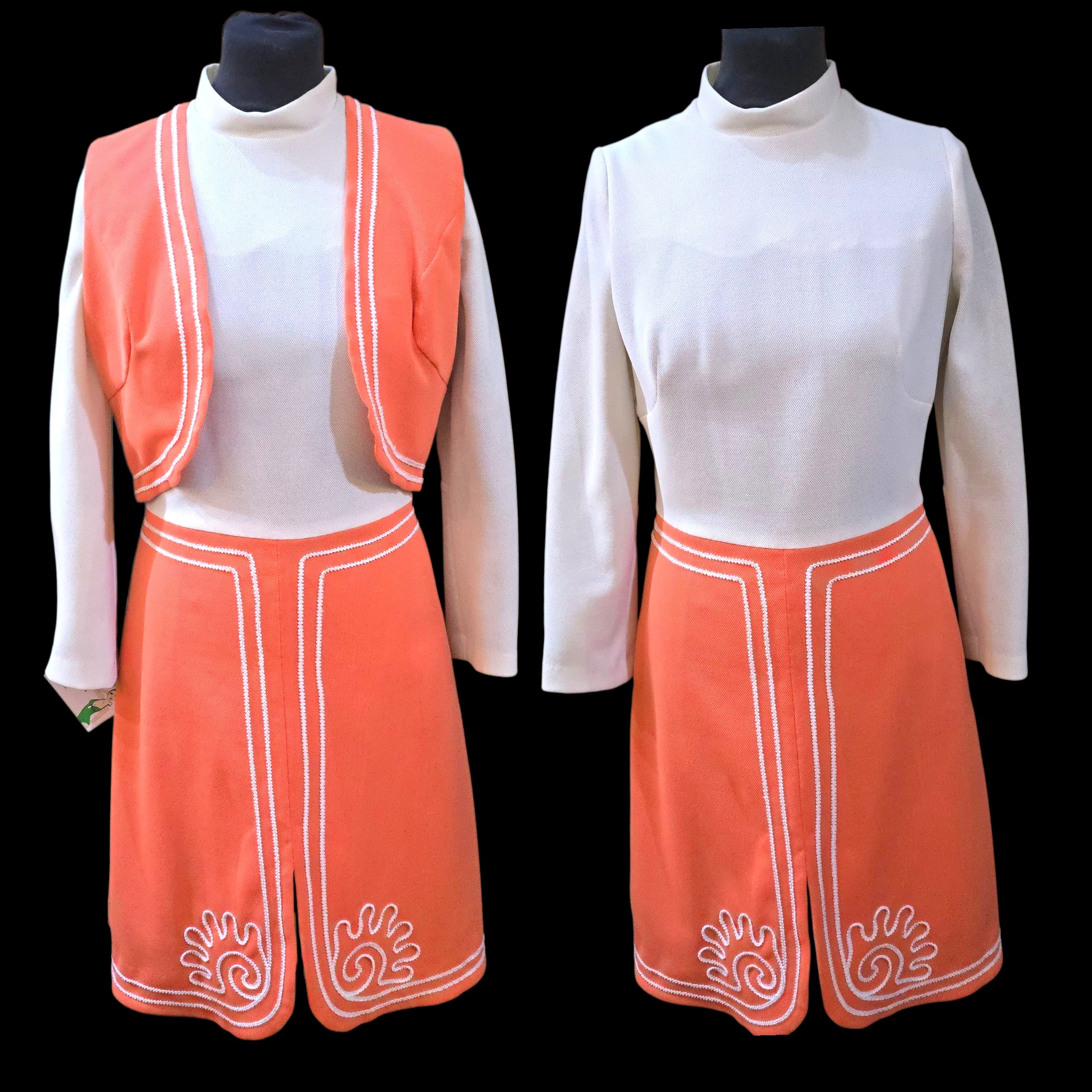 Comprising of a high neck, long sleeved knee length dress and matching waistcoat - both made in a peach and white crimplene thats trimmed with decorative soutache trim