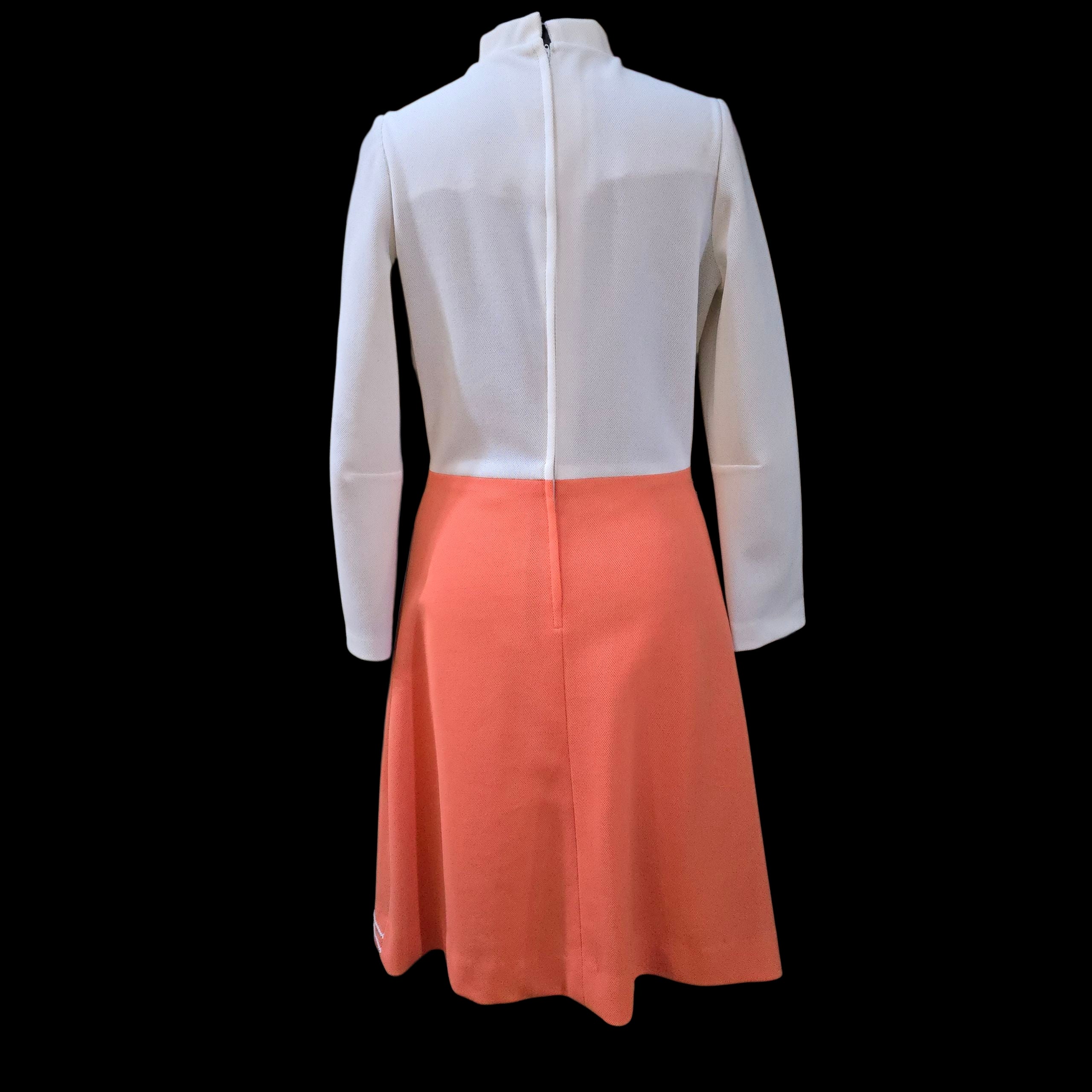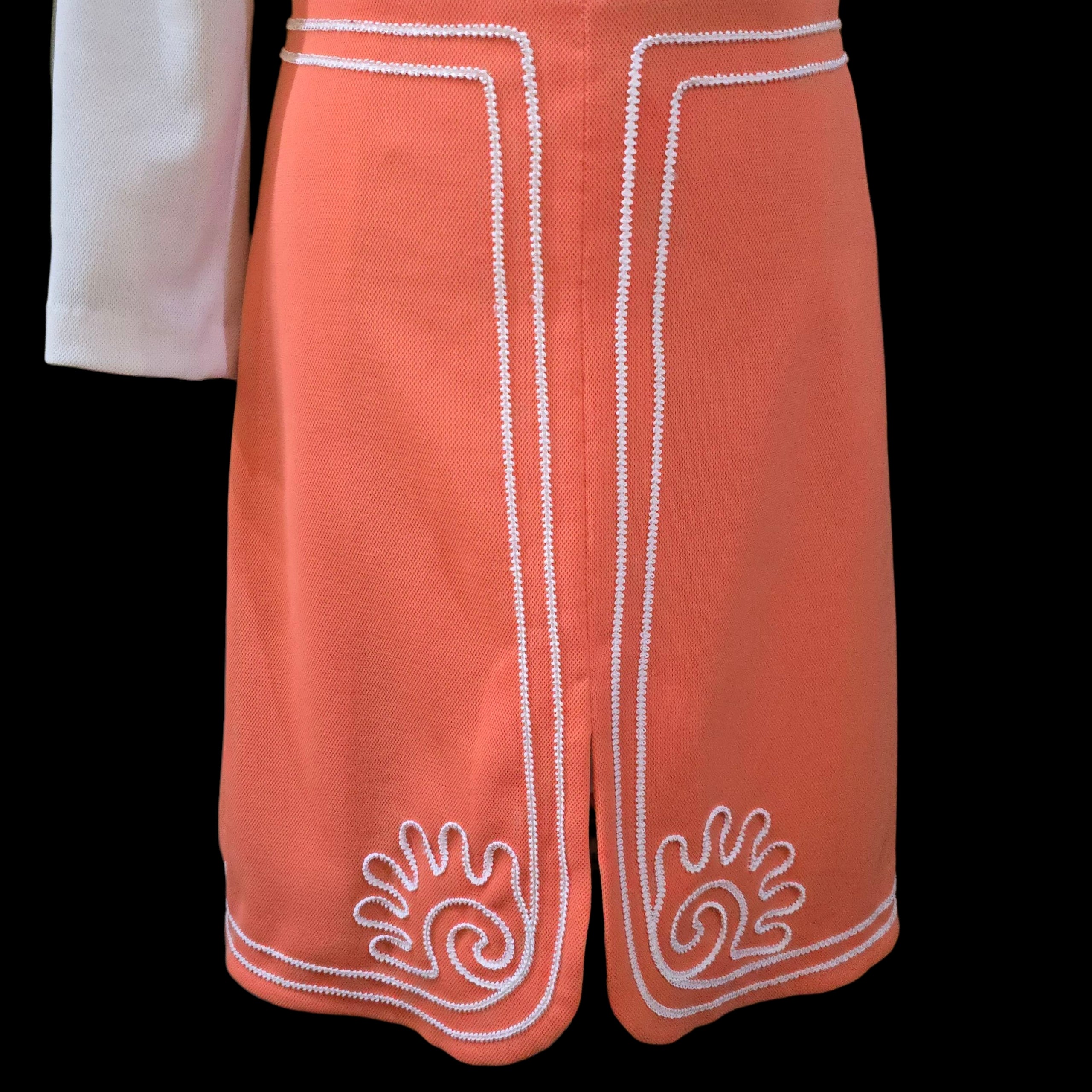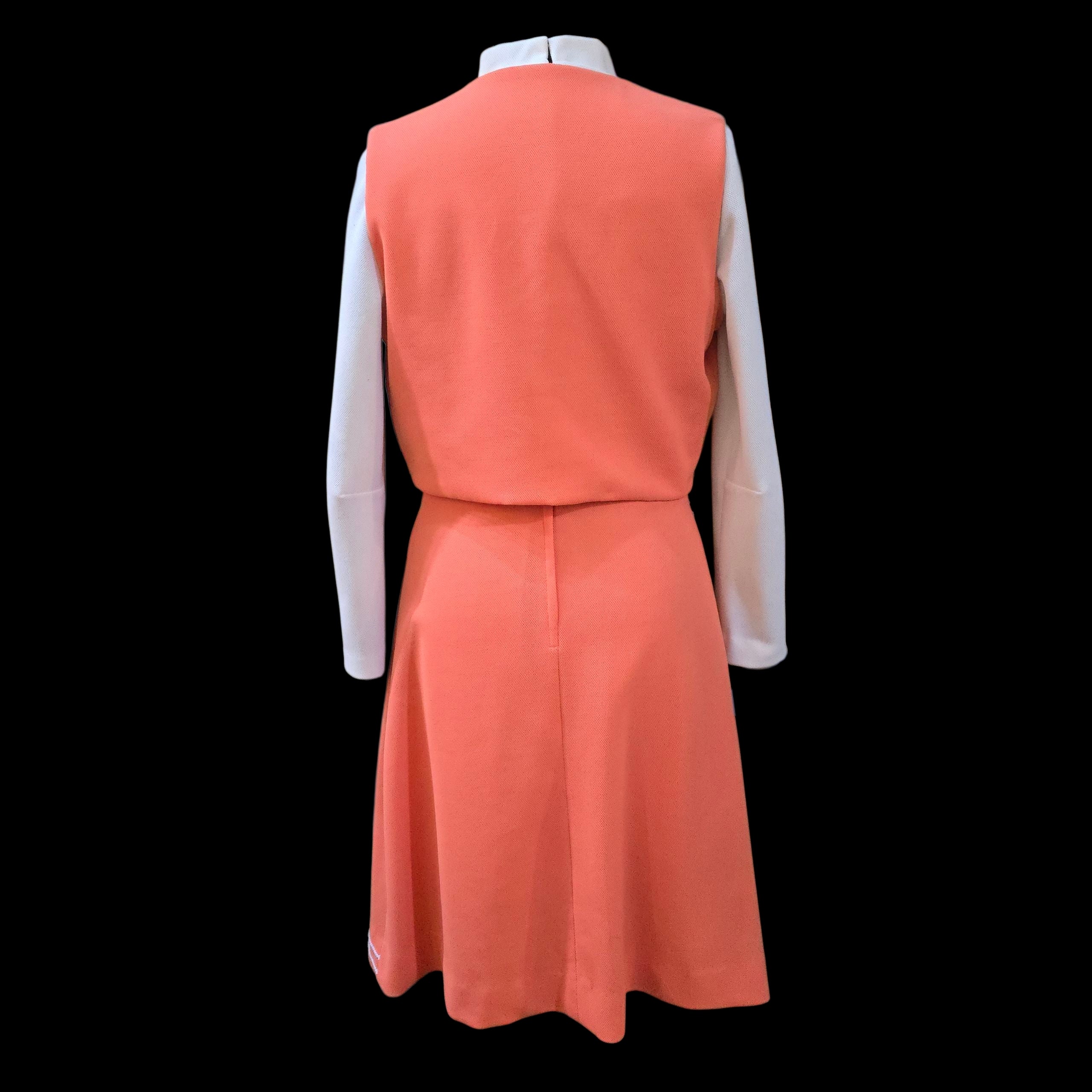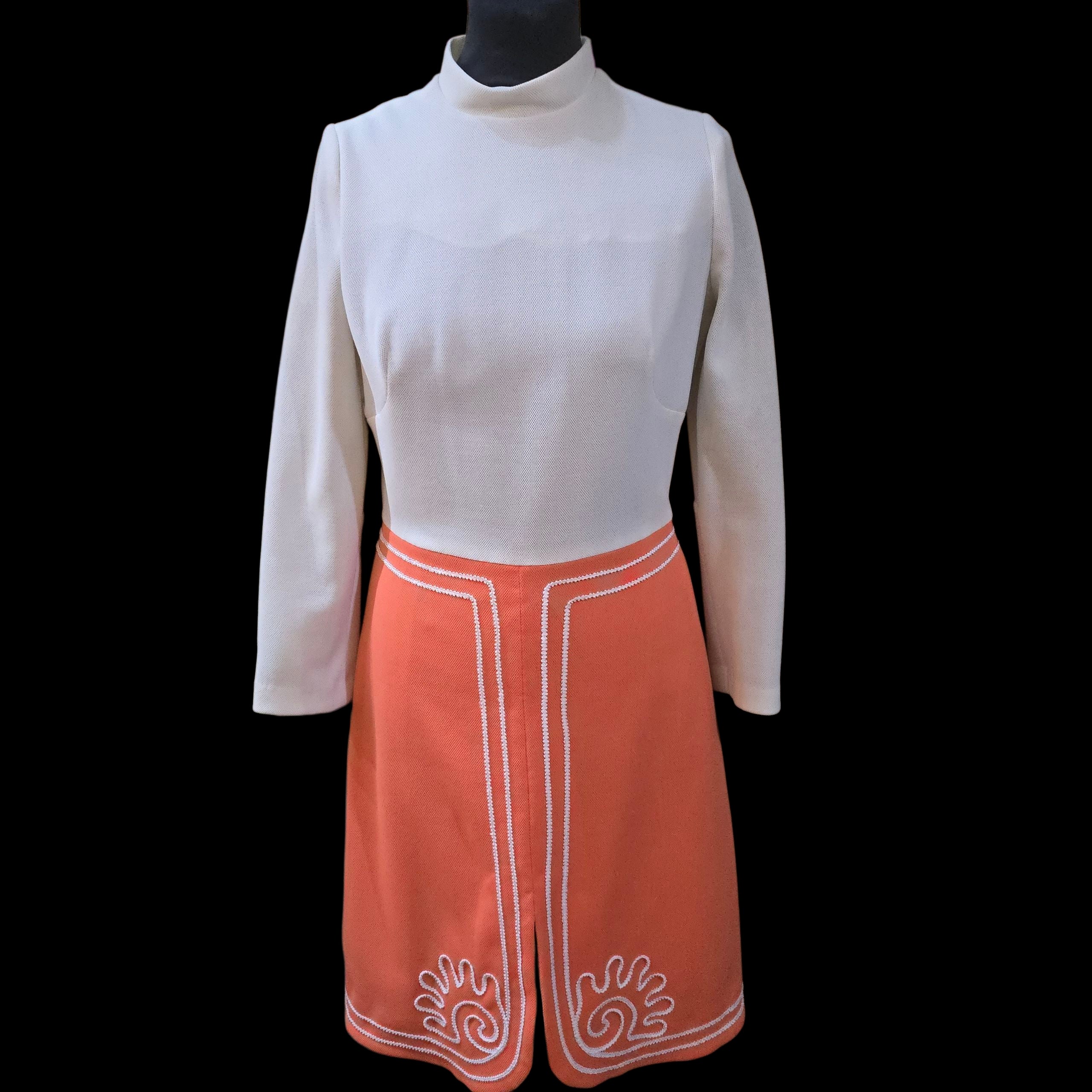 Comprising of a high neck, long sleeved knee length dress and matching waistcoat - both made in a peach and white crimplene thats trimmed with decorative soutache trim