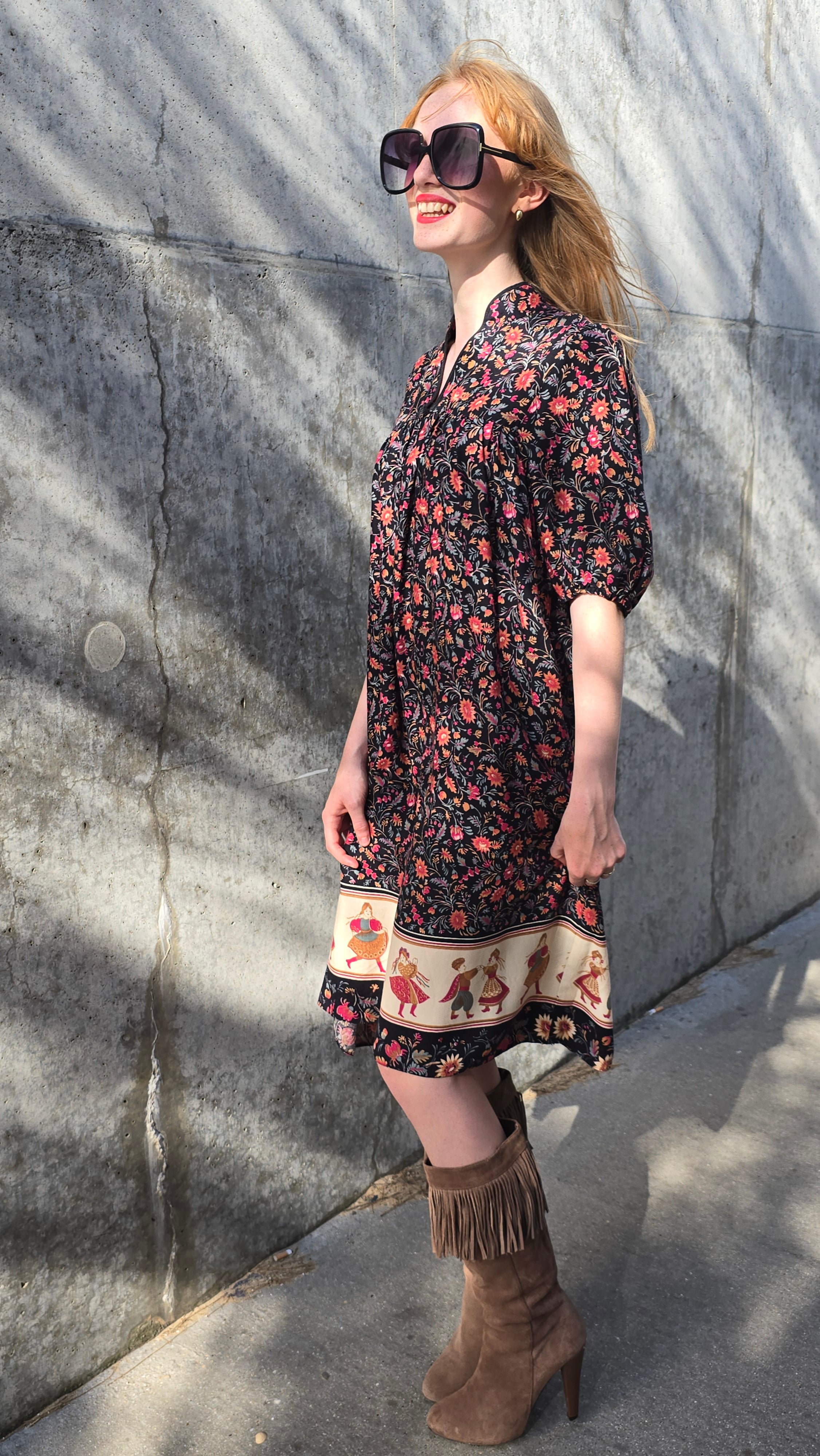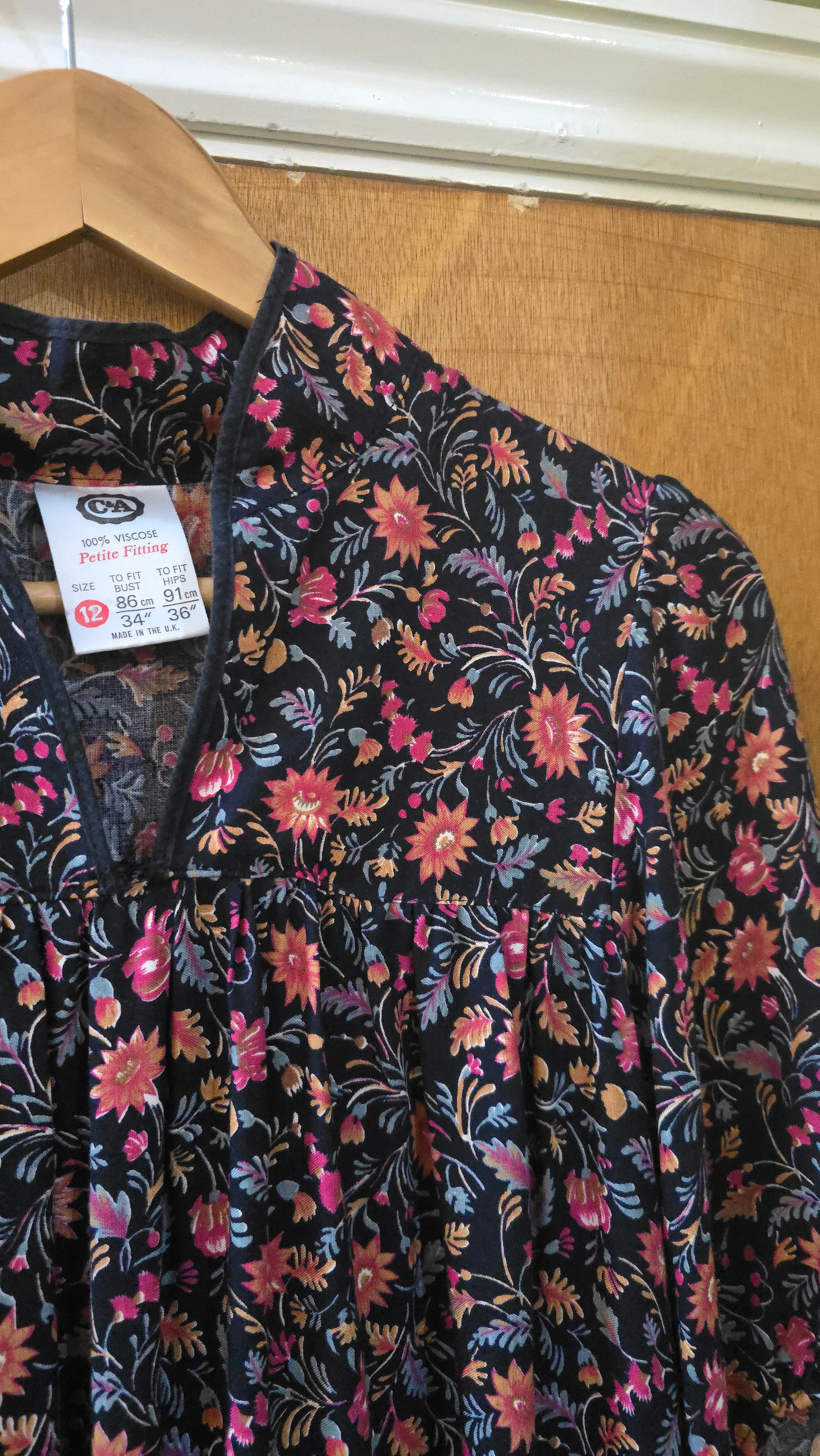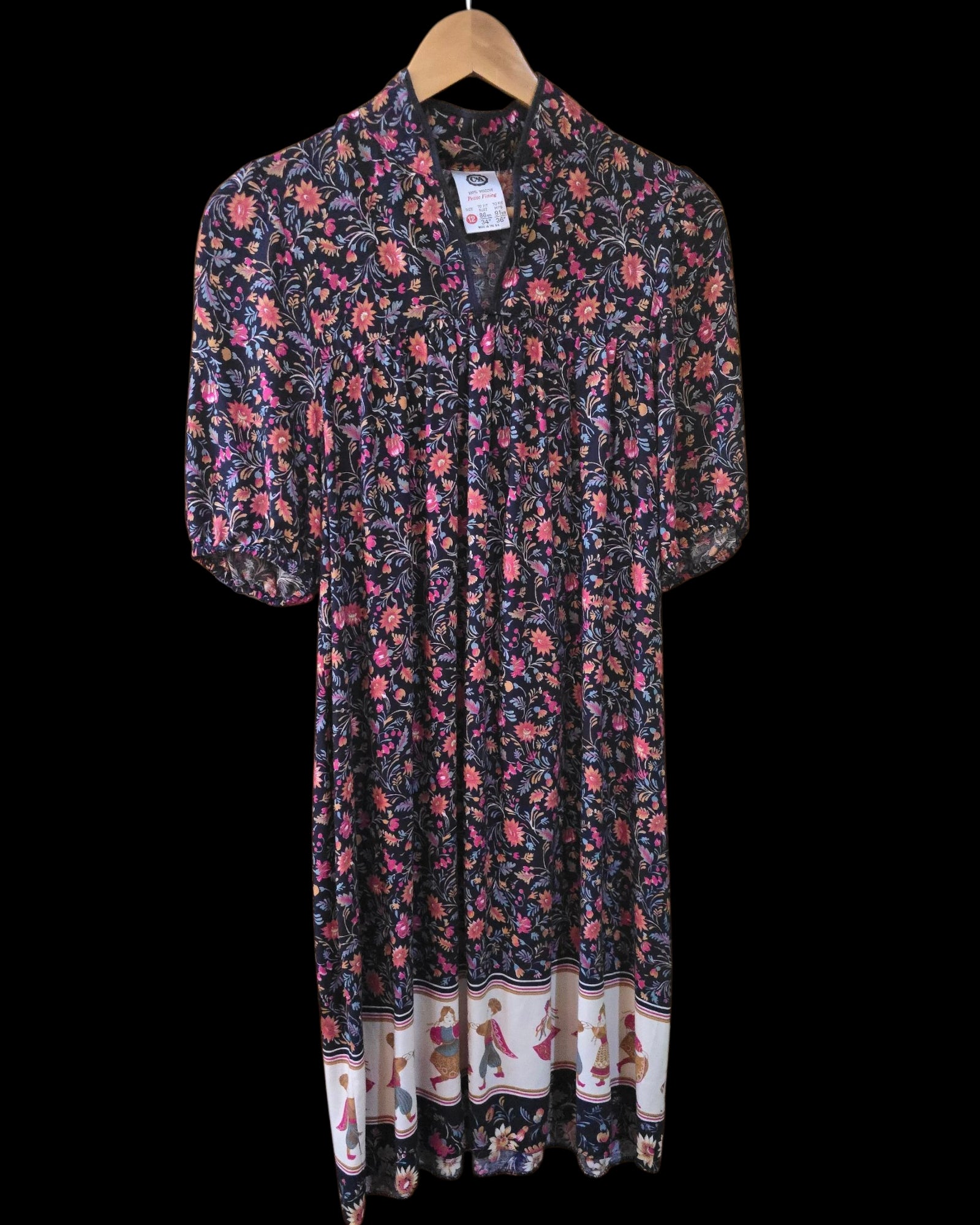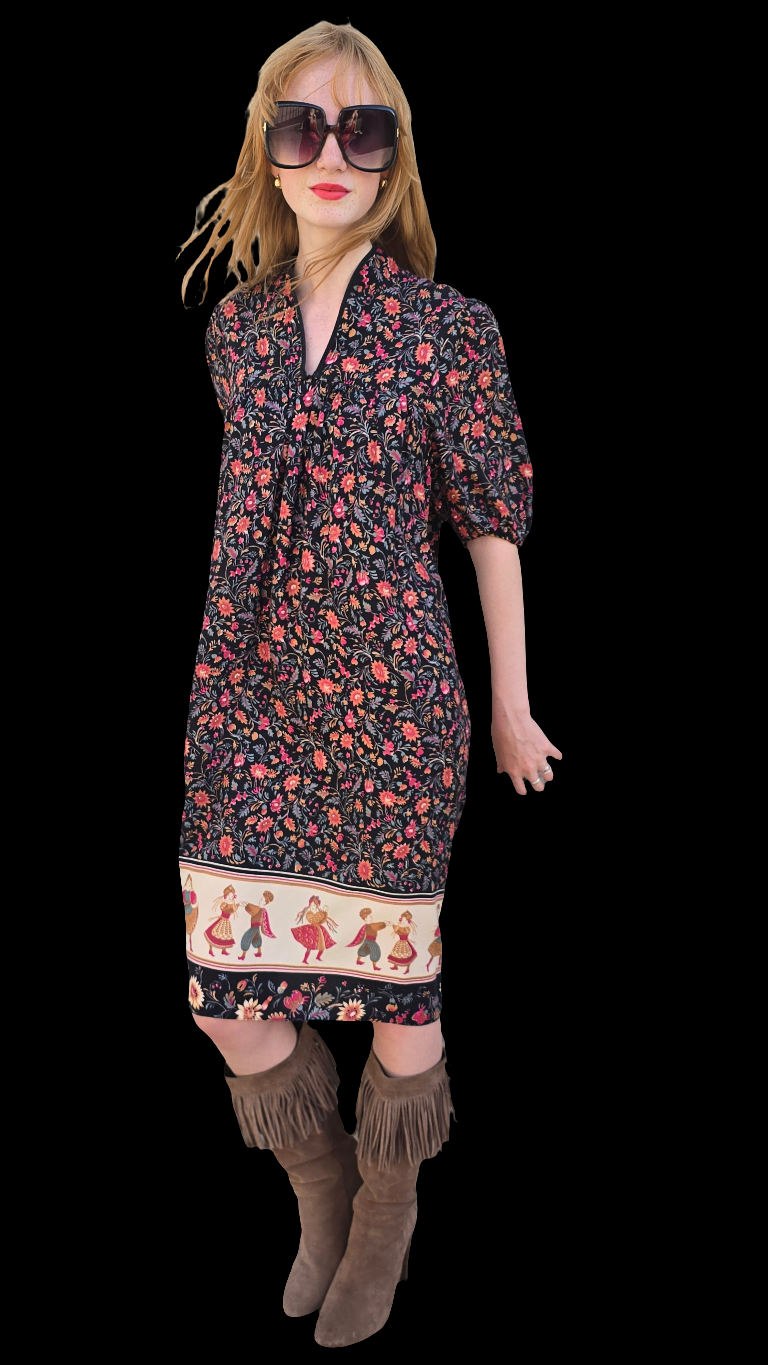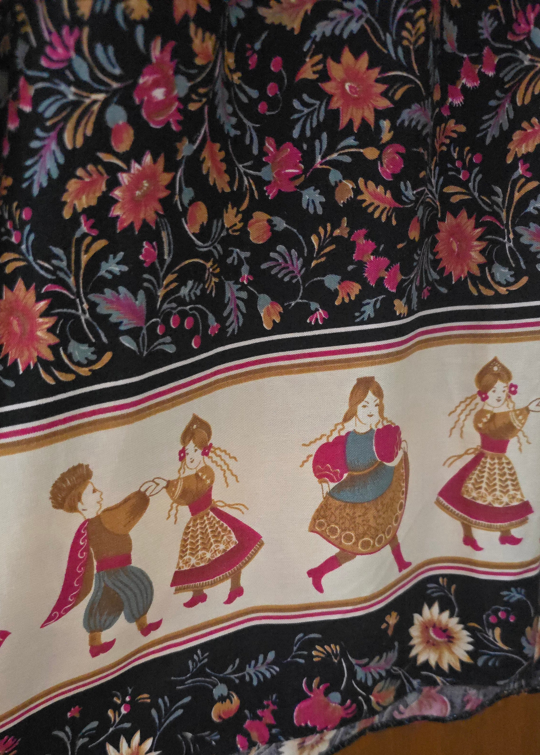 In a gorgeous dark floral print, super soft viscose with the loveliest folk print border on the midi length skirt which depicts a  Hungarian folk dance