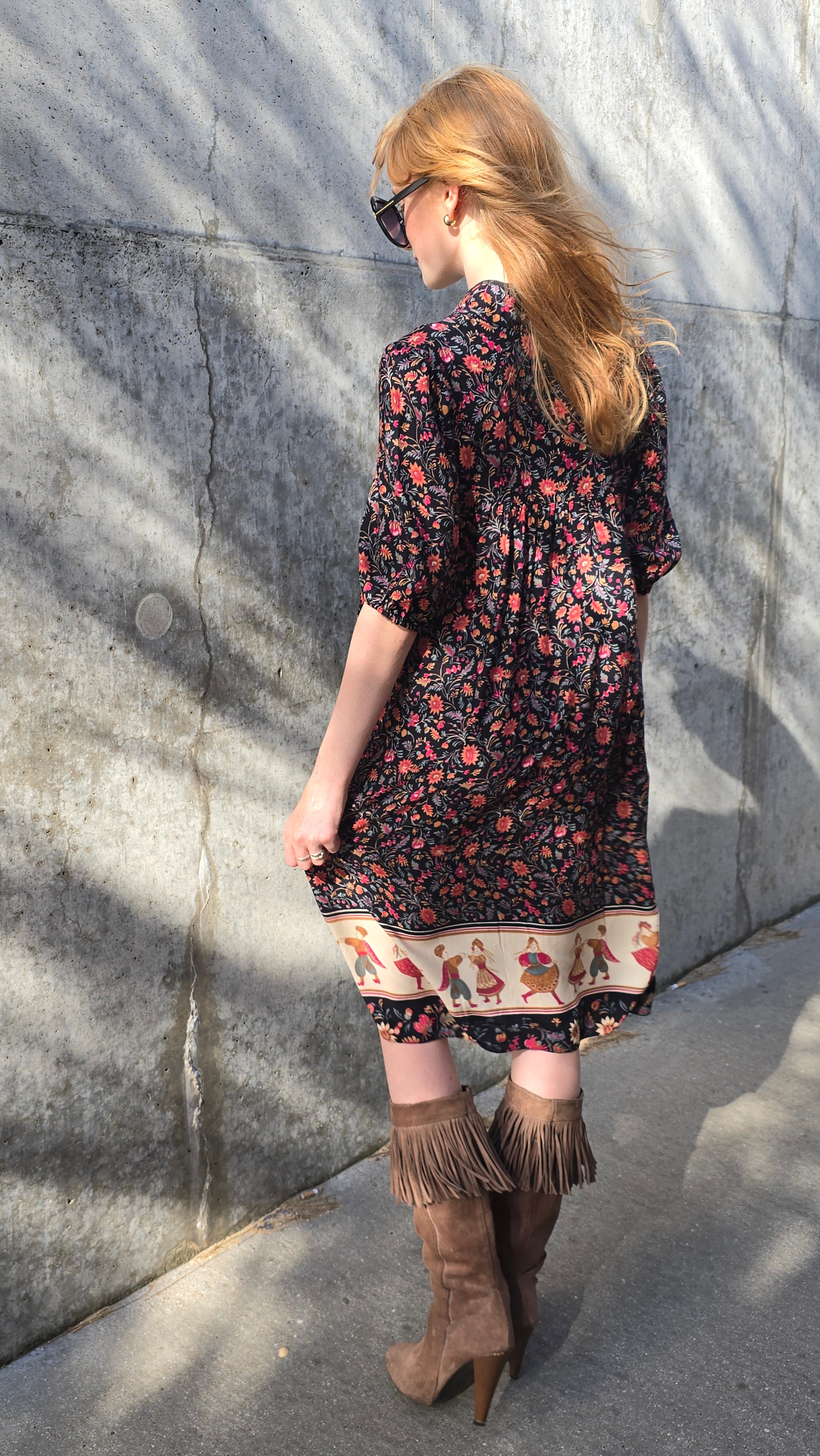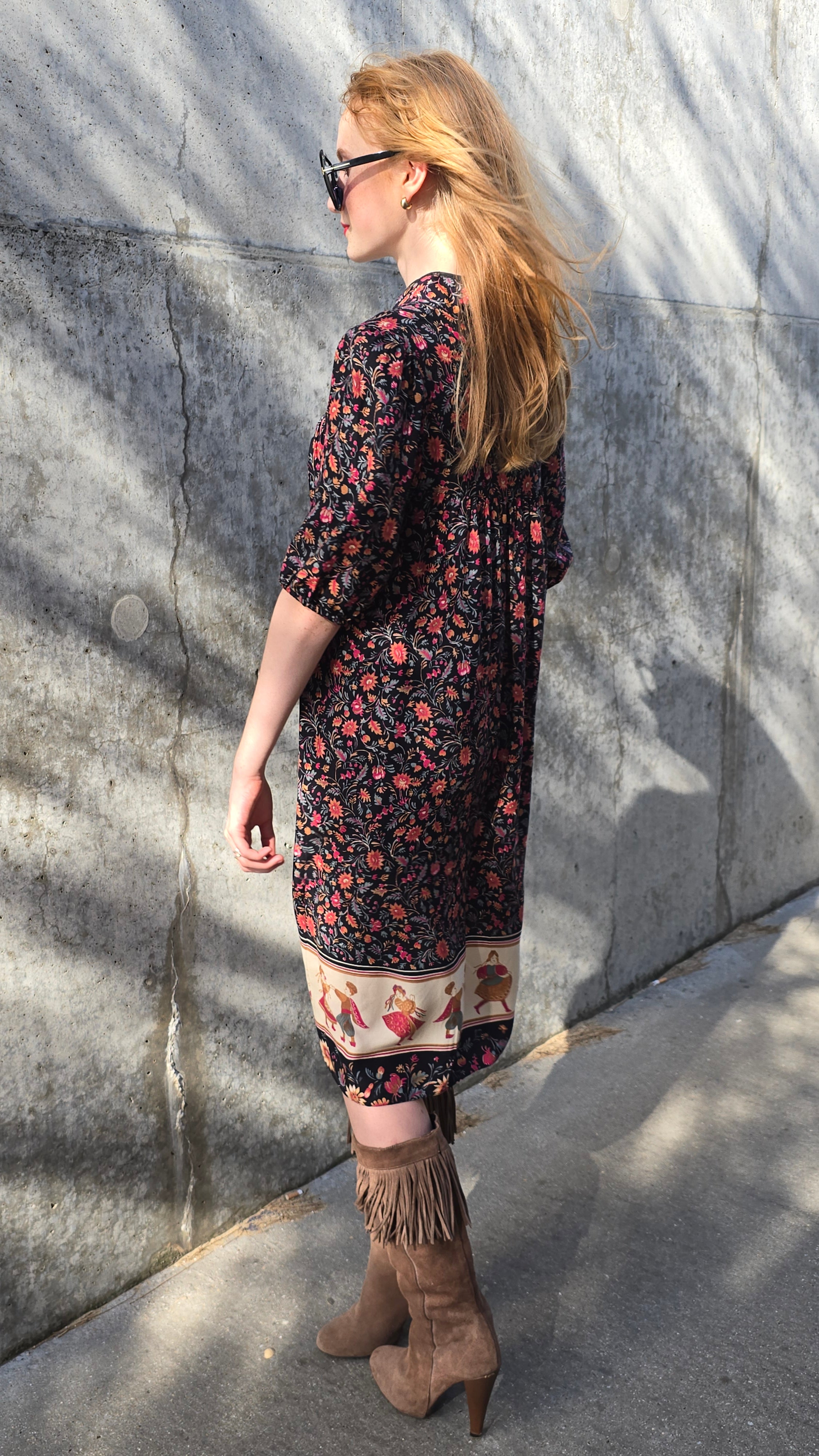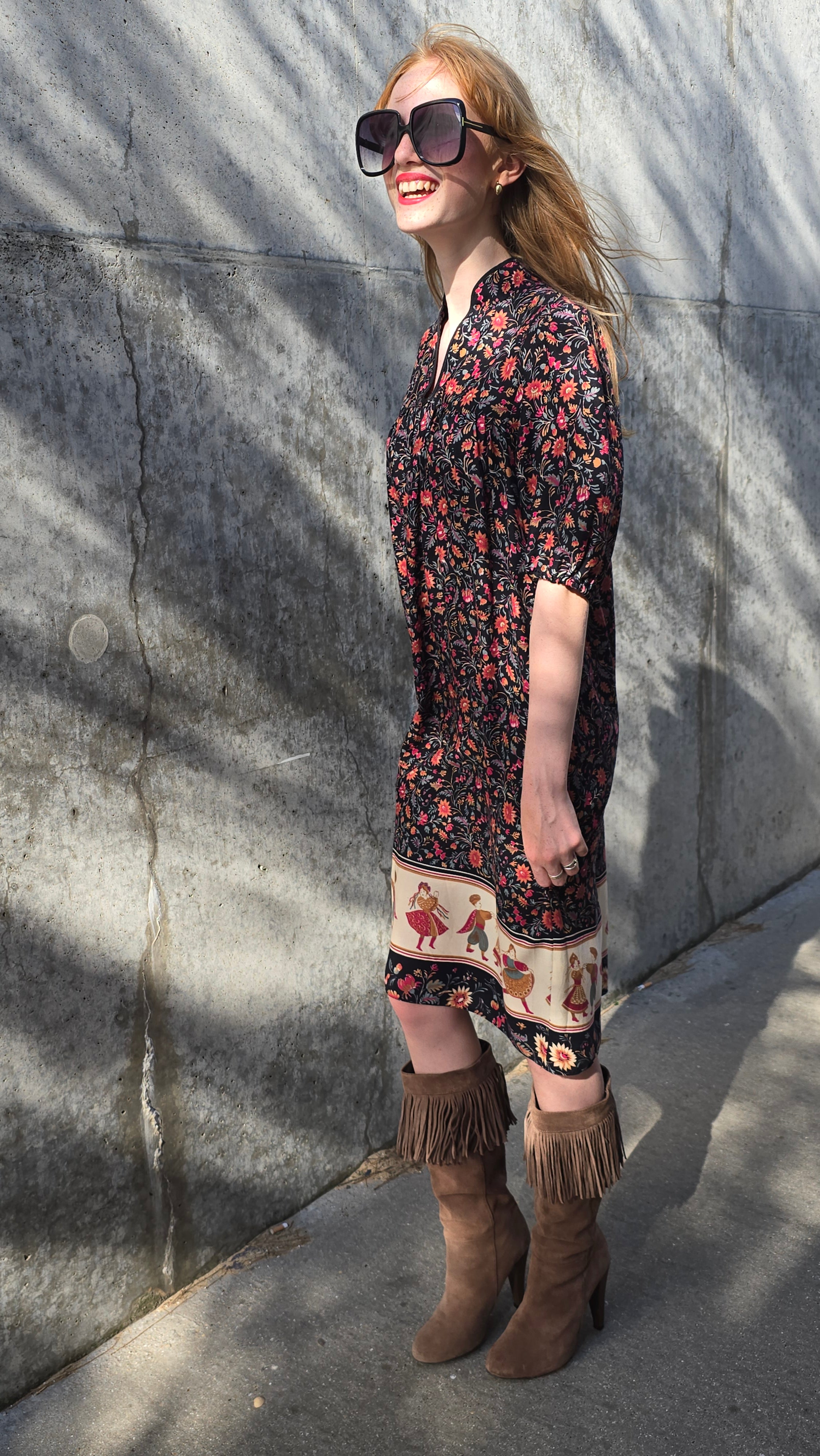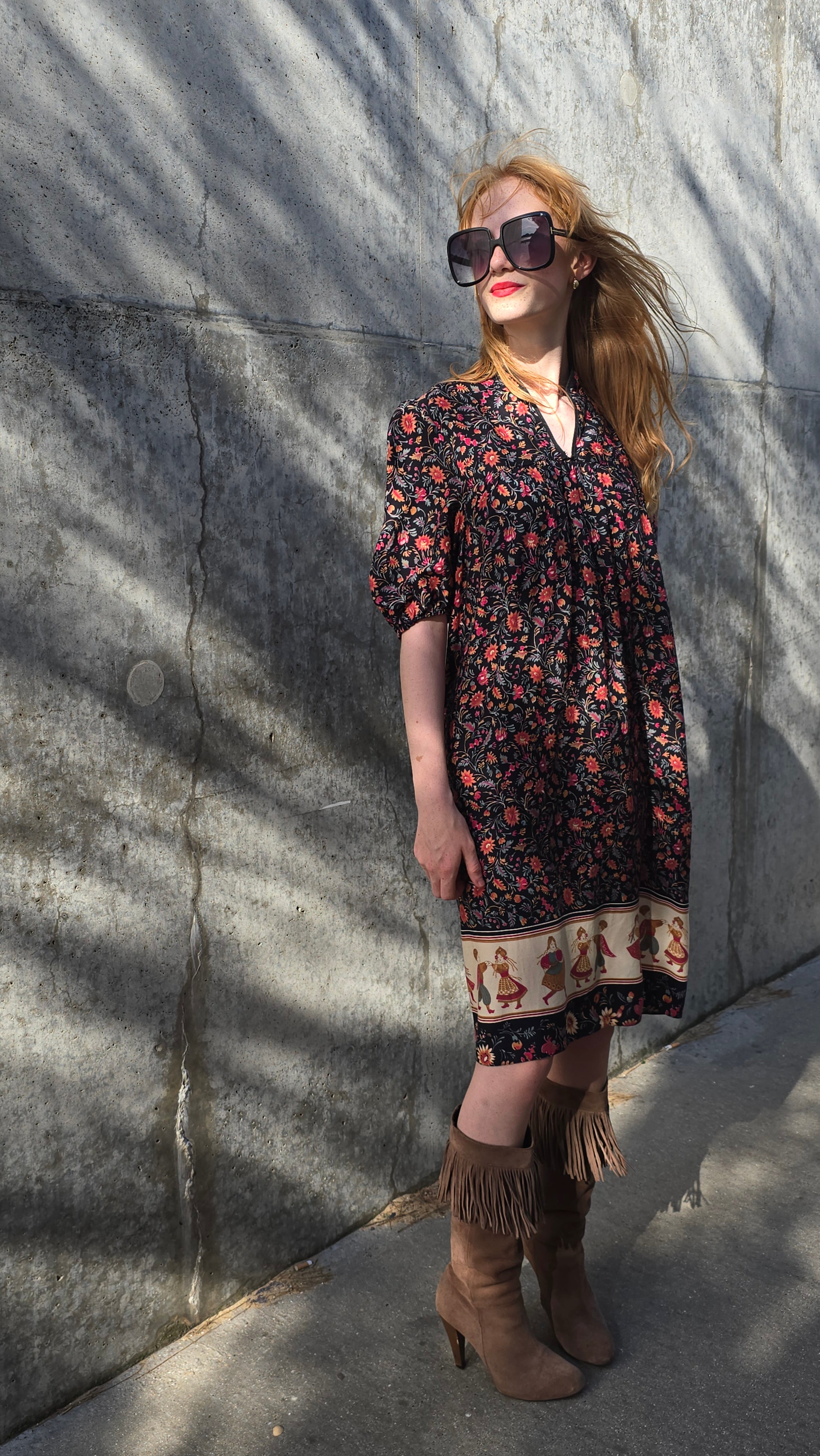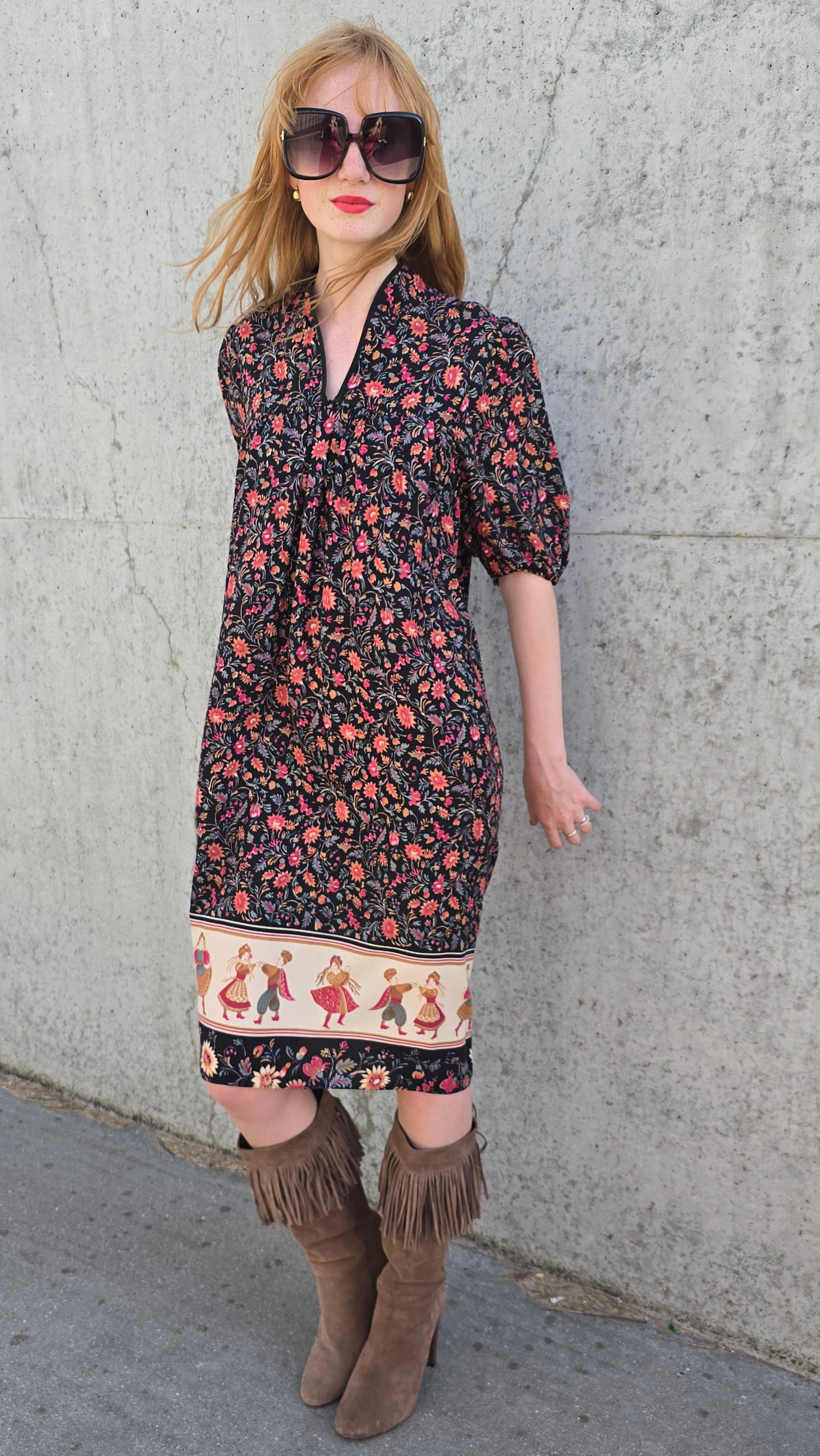 In a gorgeous dark floral print, super soft viscose with the loveliest folk print border on the midi length skirt which depicts a  Hungarian folk dance