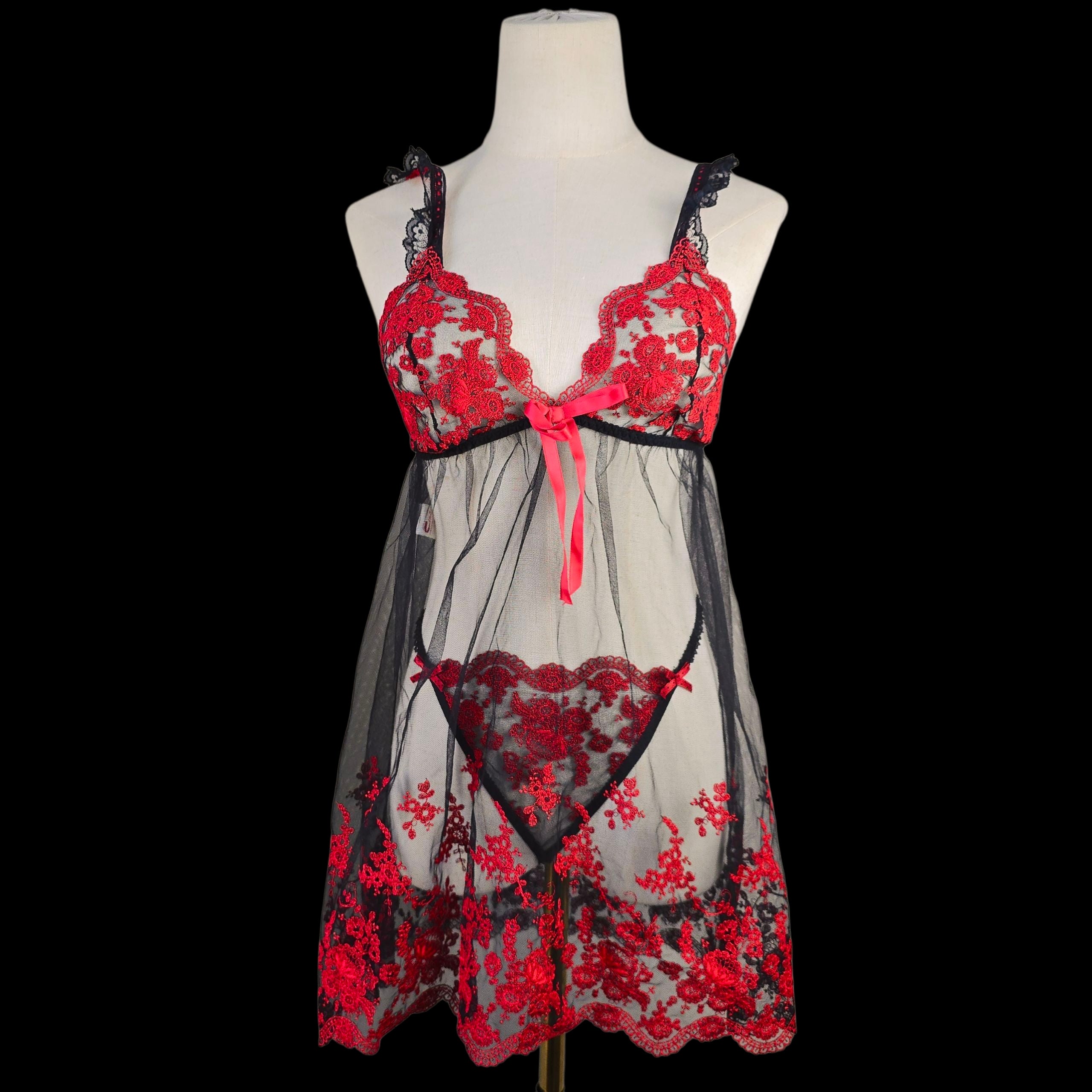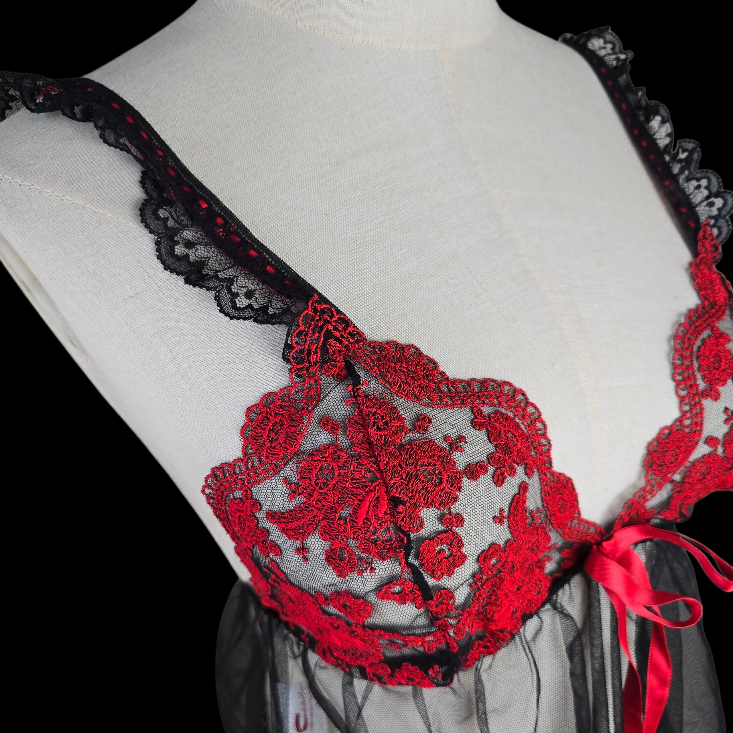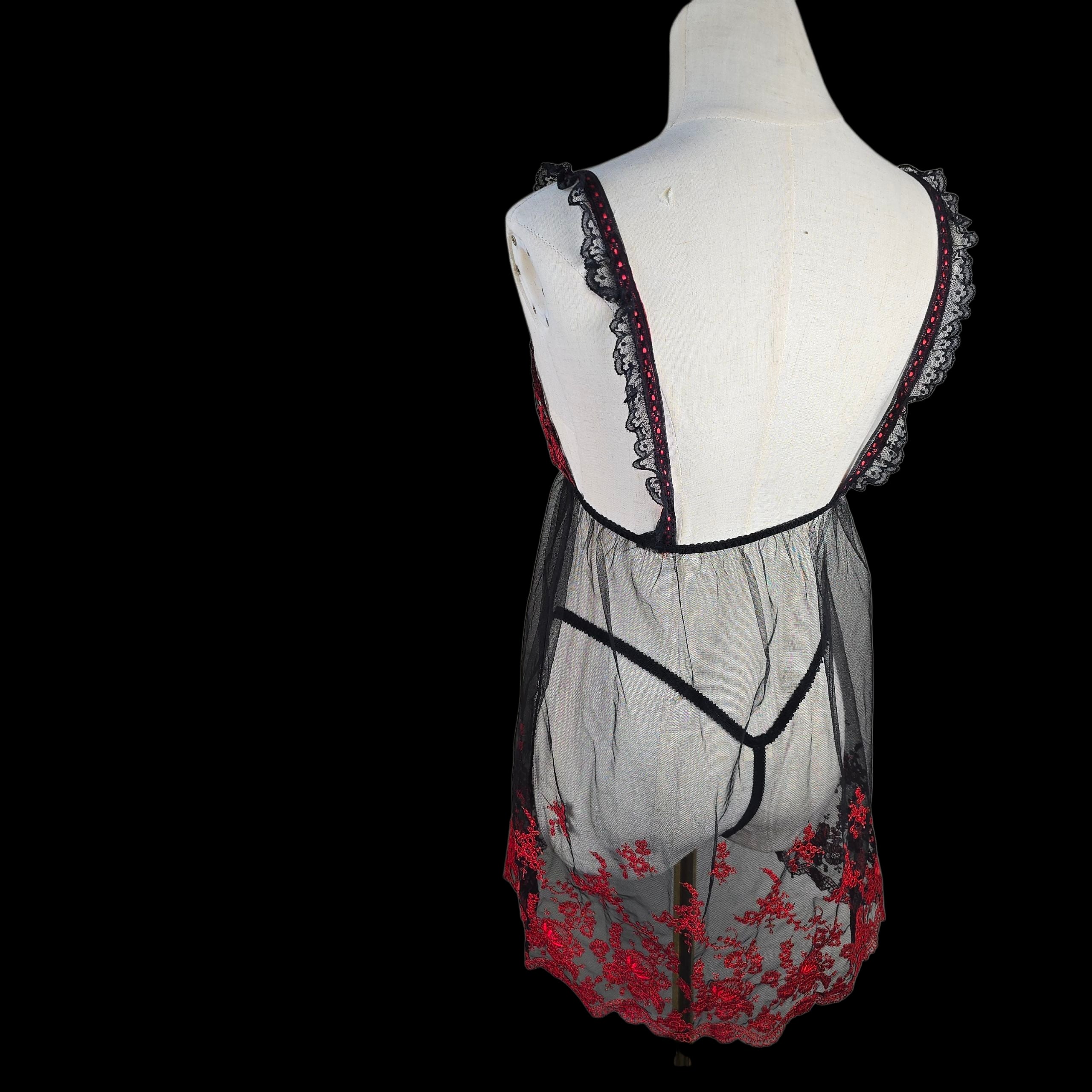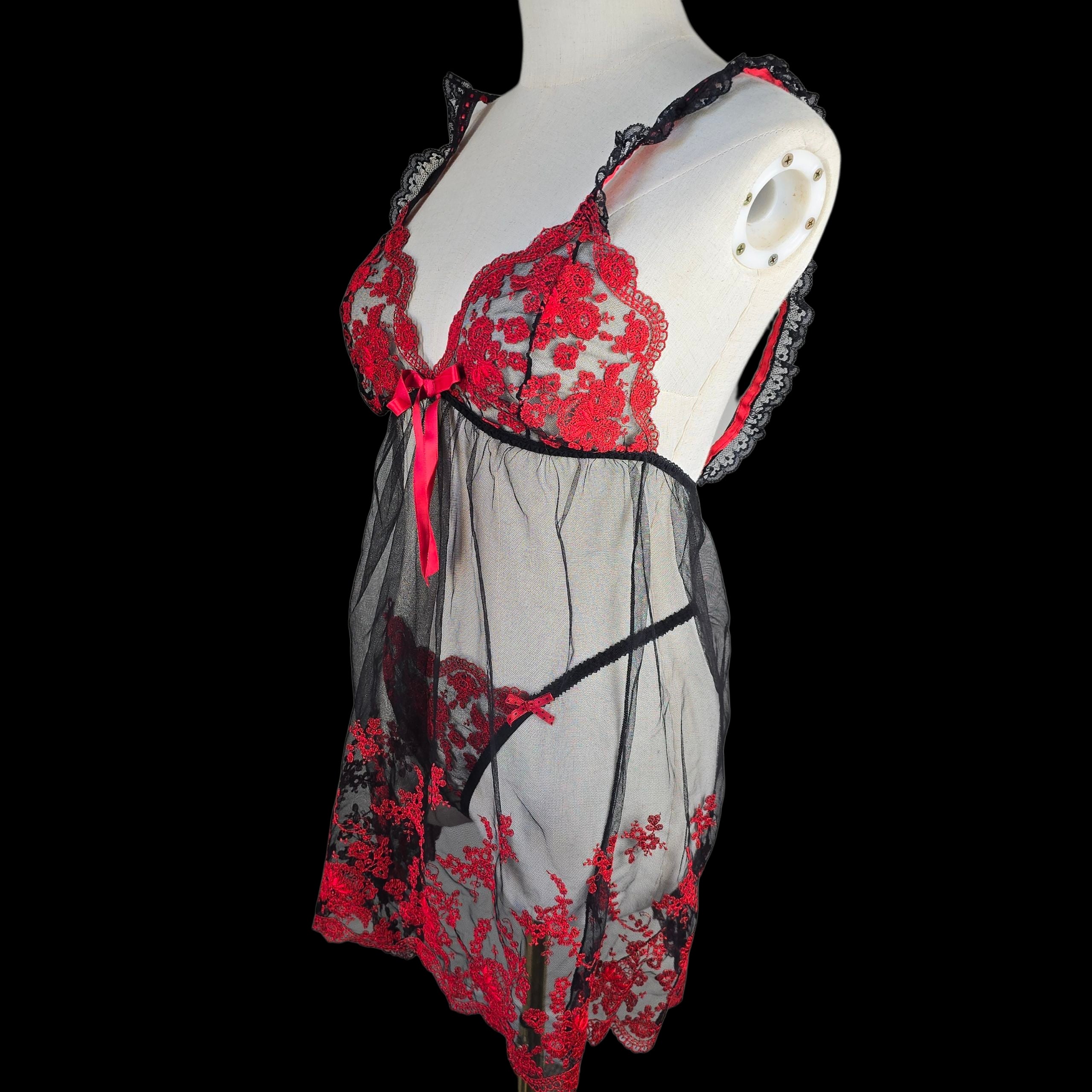 In an Inky Black sheer mesh, this Baby Doll dress has contrasting racy Red Floral embroidery on her skirt and also on her triangular soft cup bust. She has scallop lace trim on her straps which are also trimmed with red satin ribbon. This ribbon is repeated between the breasts tied into a sweet bow.