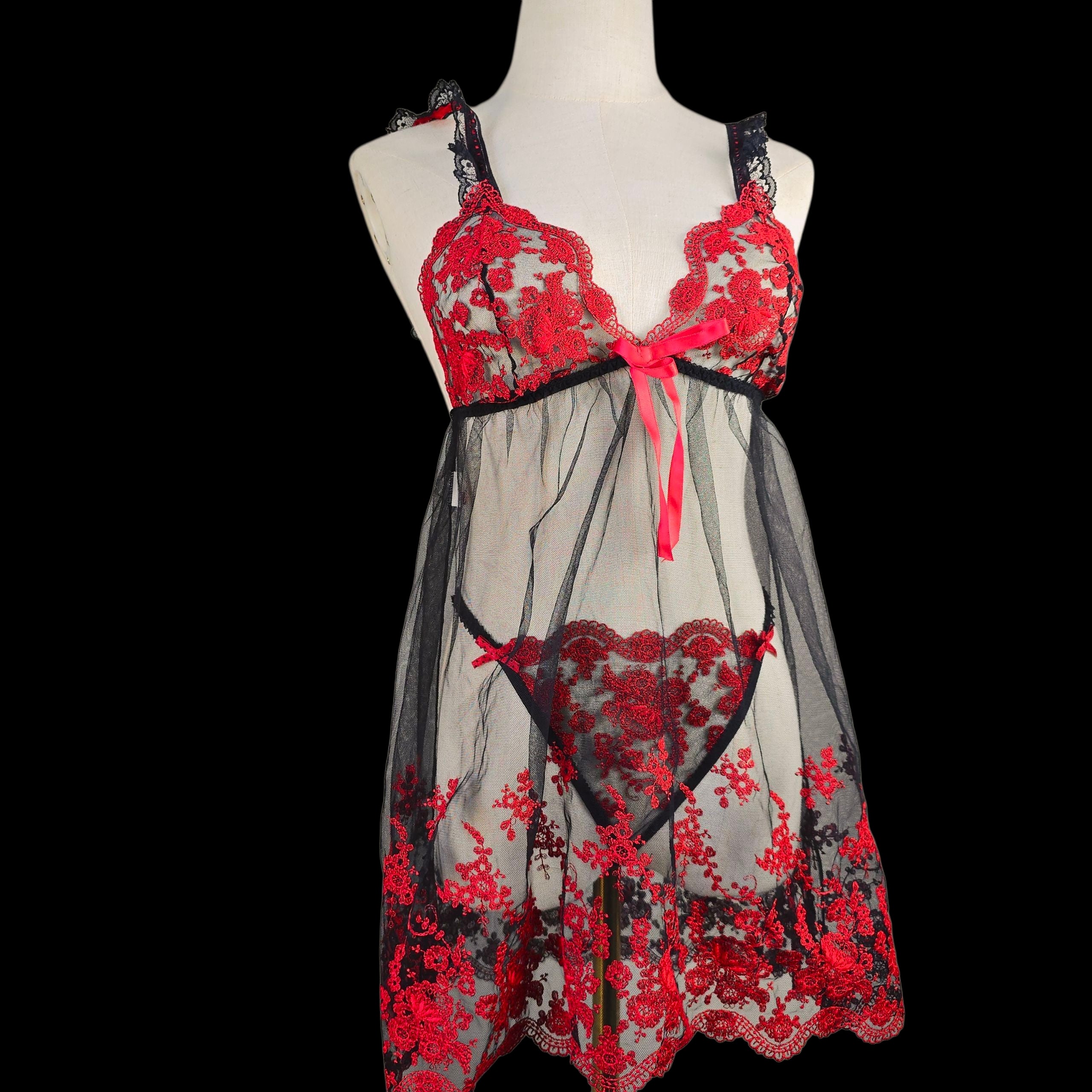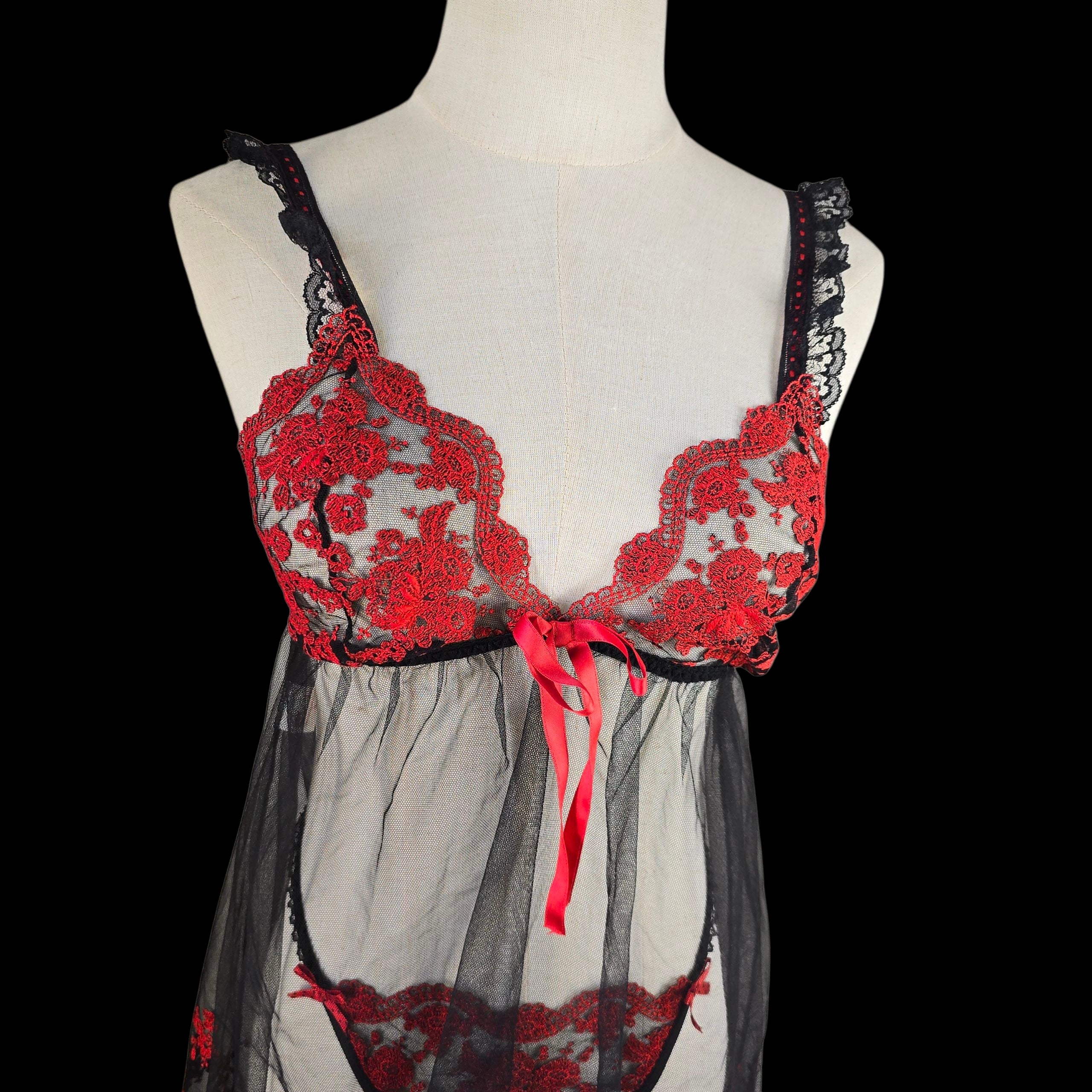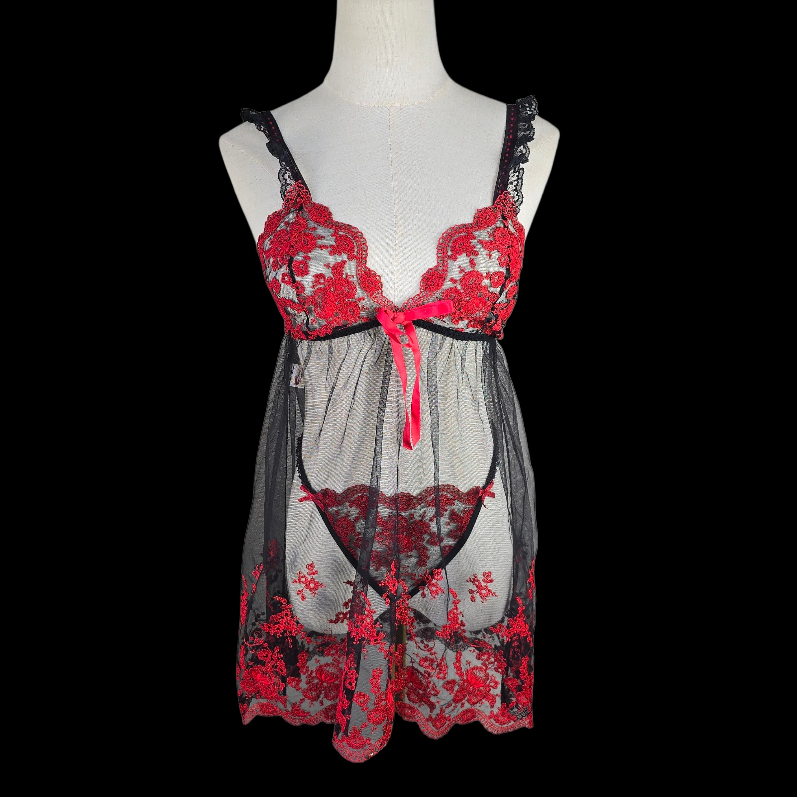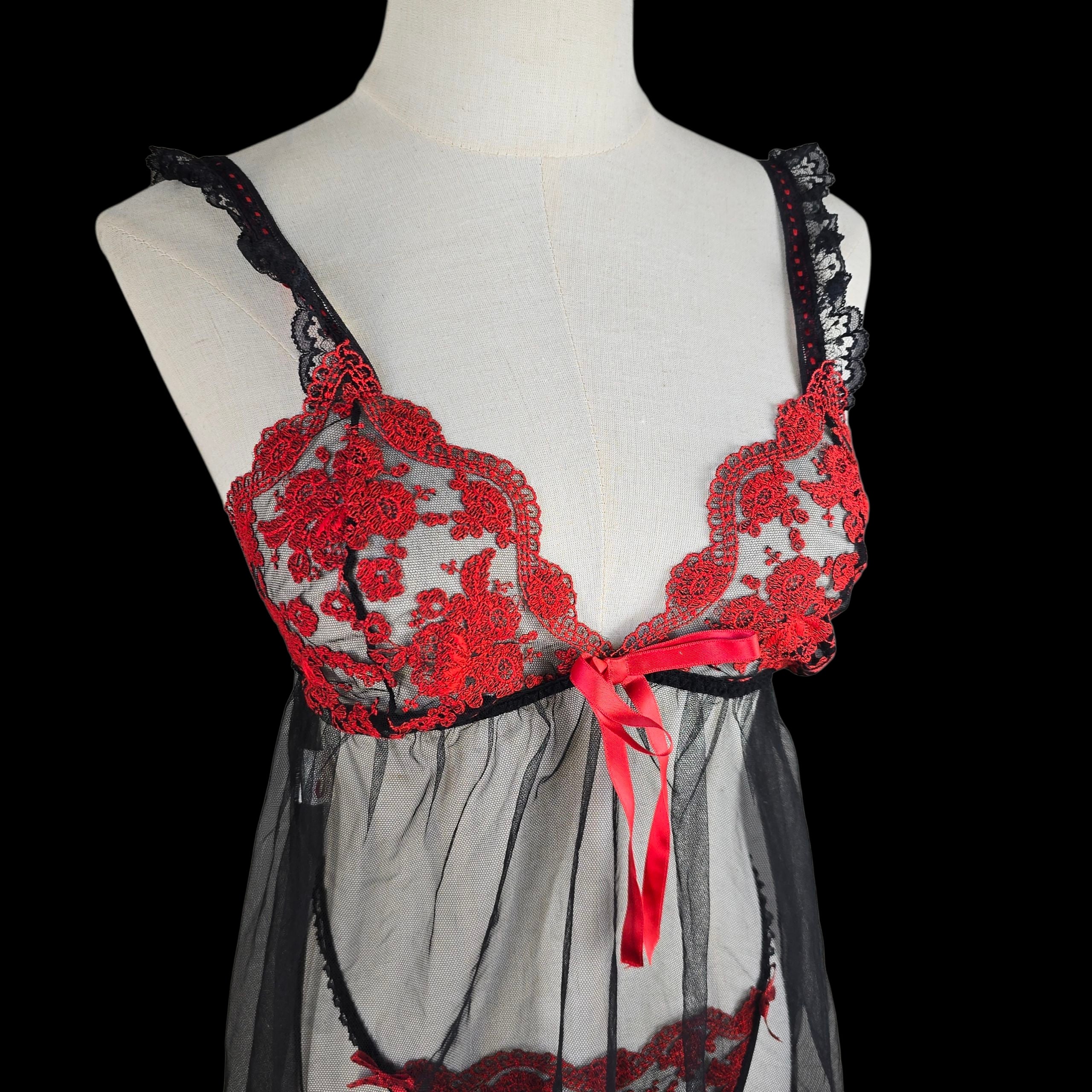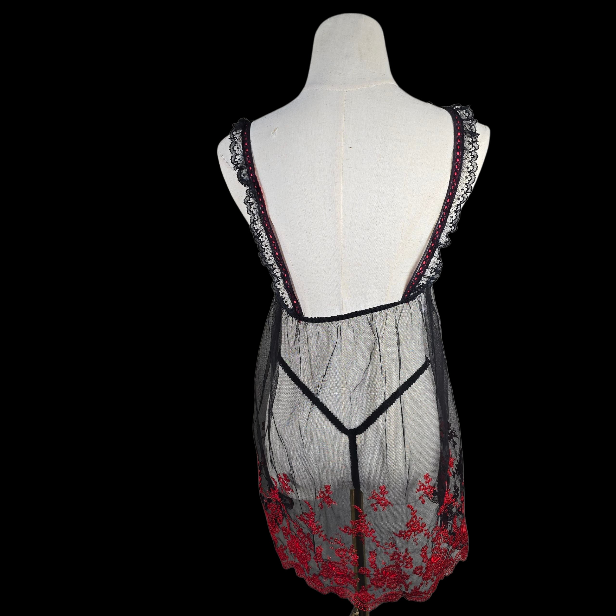 In an Inky Black sheer mesh, this Baby Doll dress has contrasting racy Red Floral embroidery on her skirt and also on her triangular soft cup bust. She has scallop lace trim on her straps which are also trimmed with red satin ribbon. This ribbon is repeated between the breasts tied into a sweet bow.