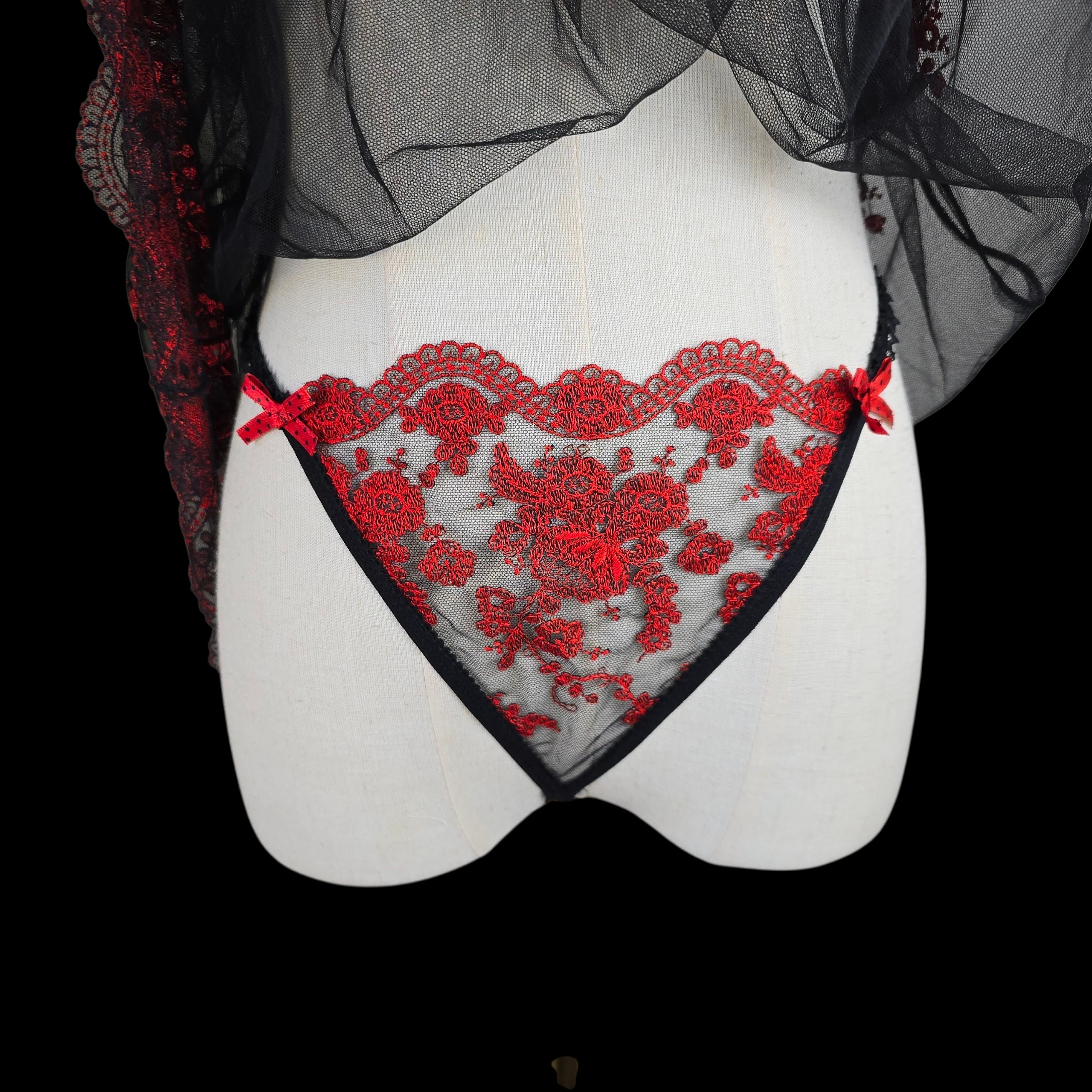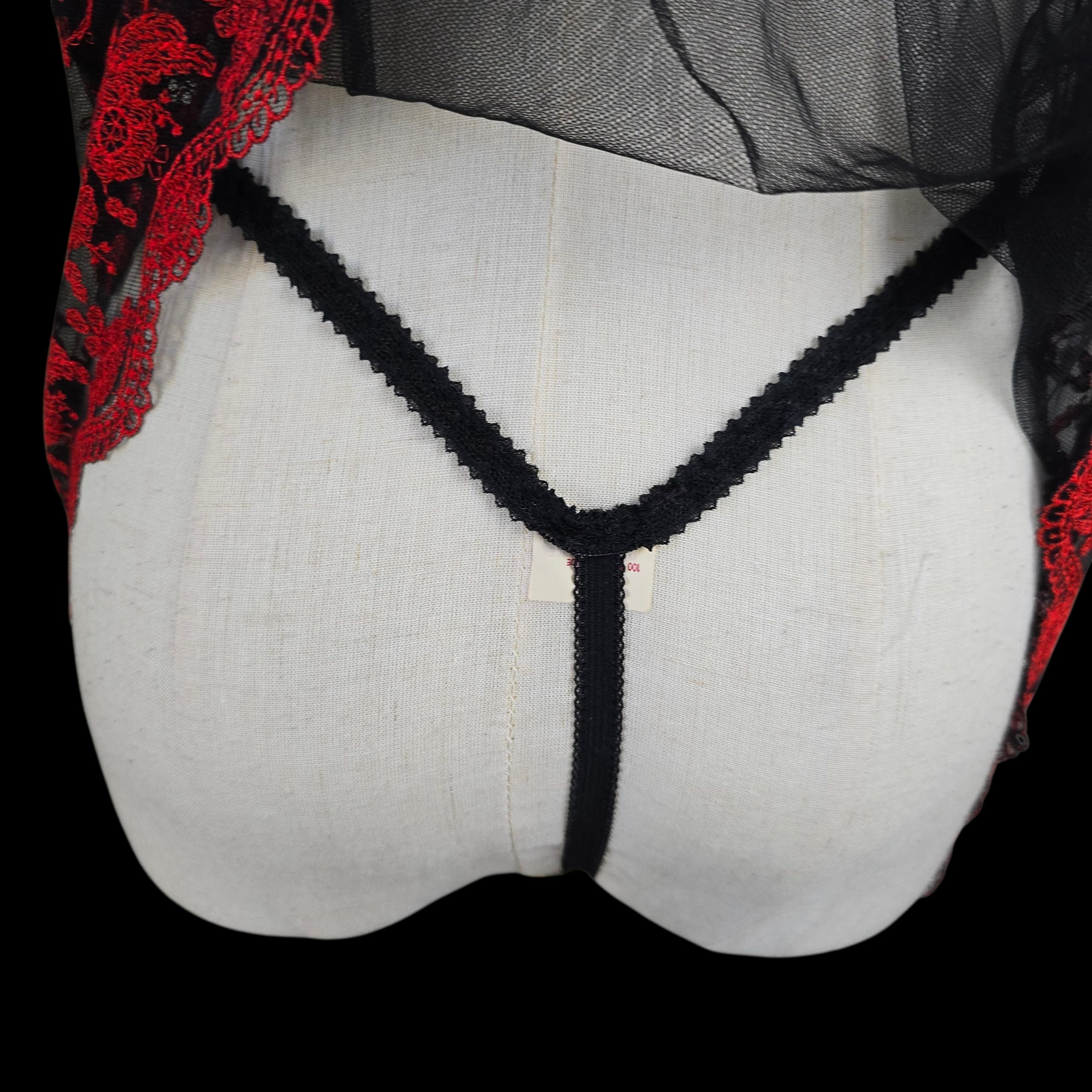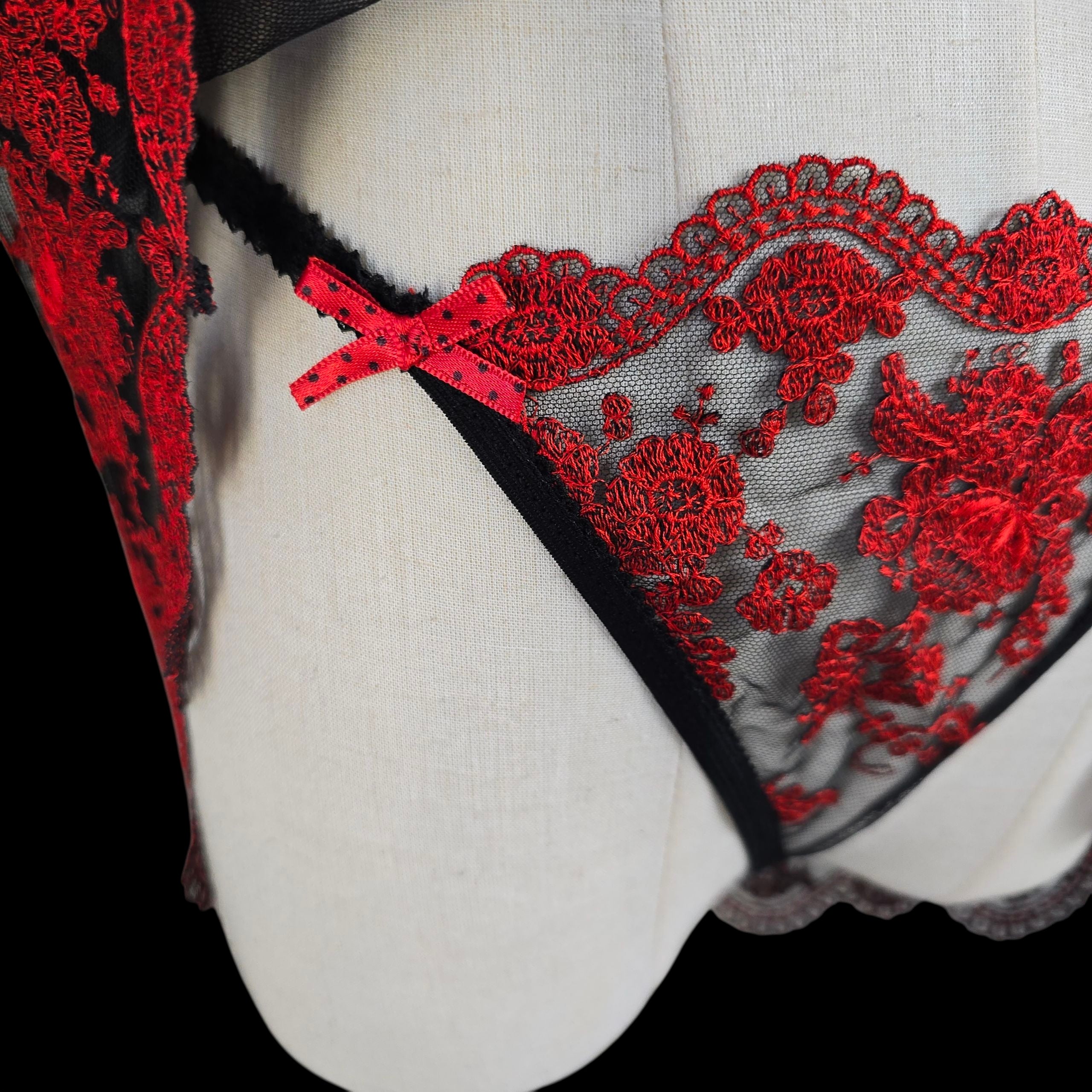 The coordinating G String pants are in the same sheer mesh and have red floral embroidery and scallop top which are finished with two red and black polka dot ribbon bows