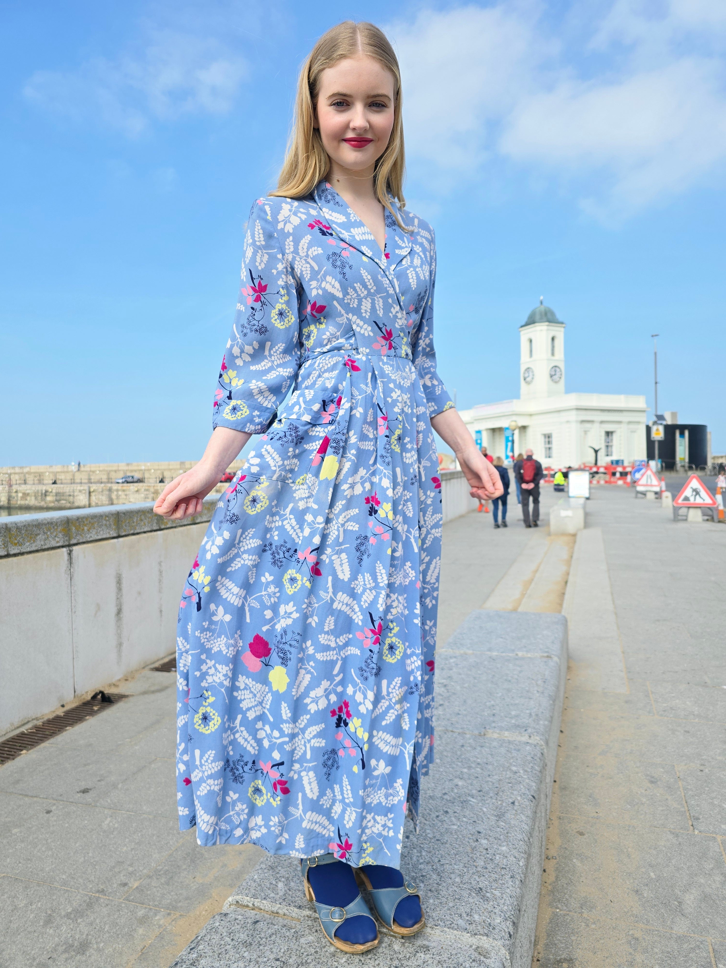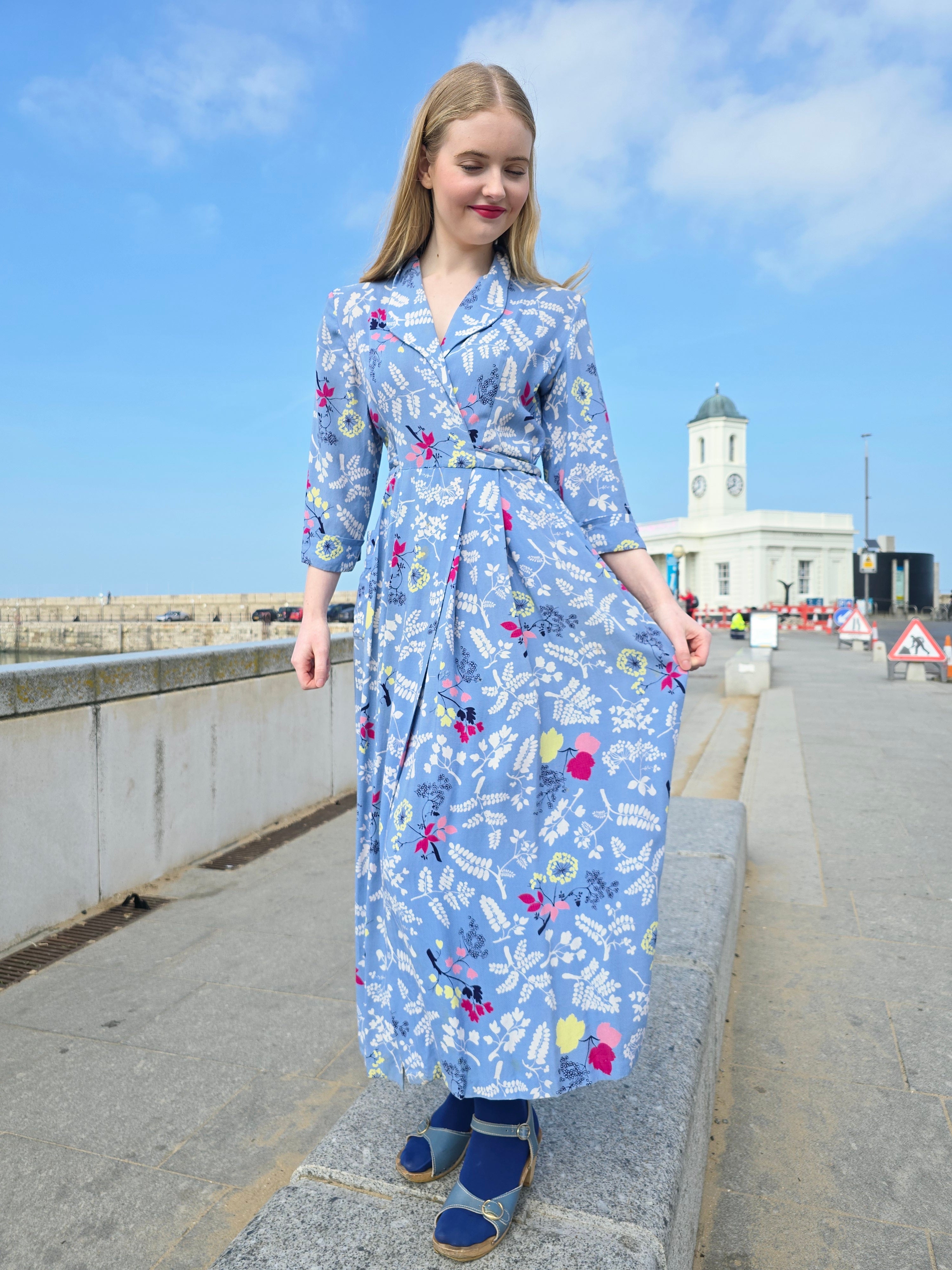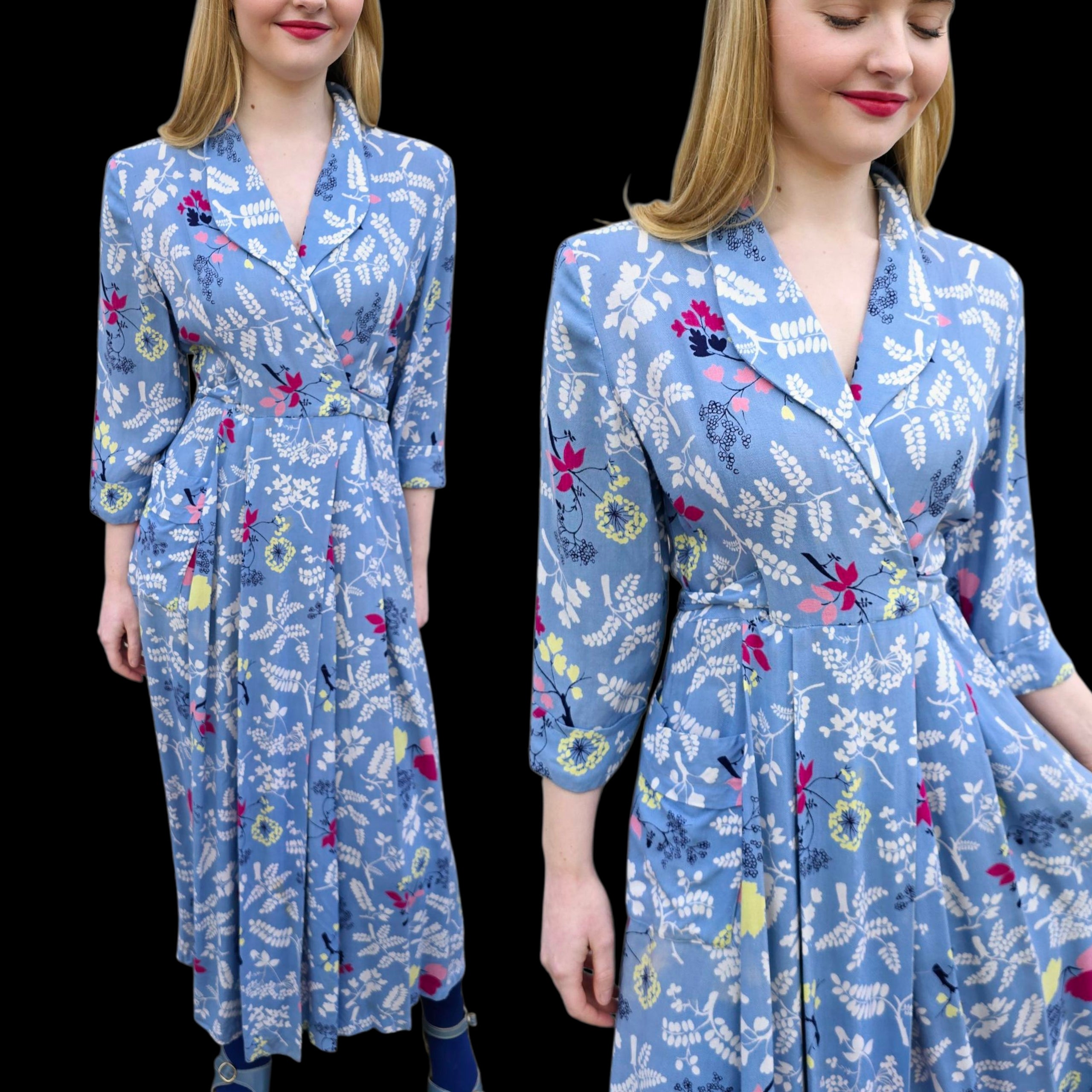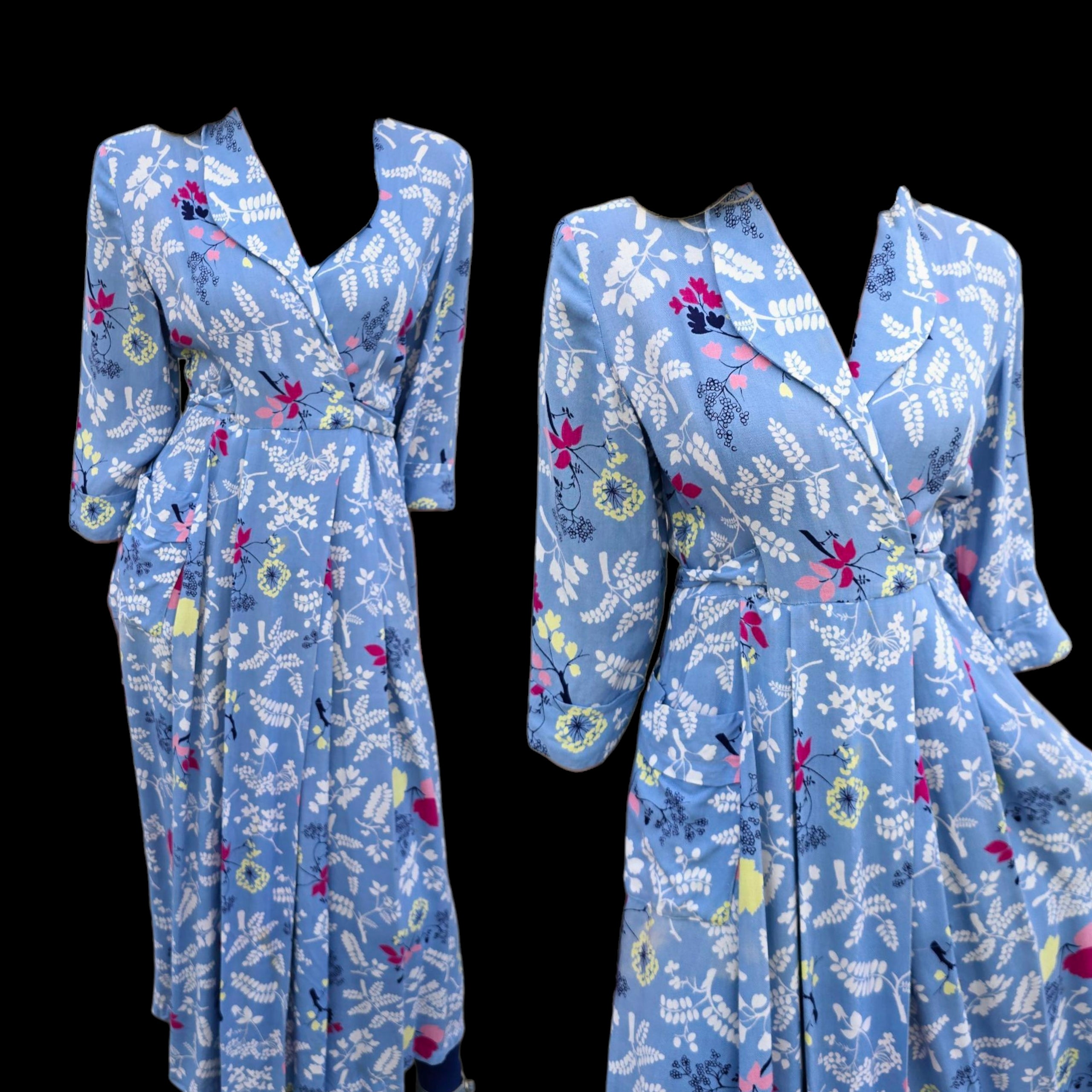 Wraparound style gown that also works as a lovely dress. In a stunning sky blue with the prettiest - oh so 40s- print