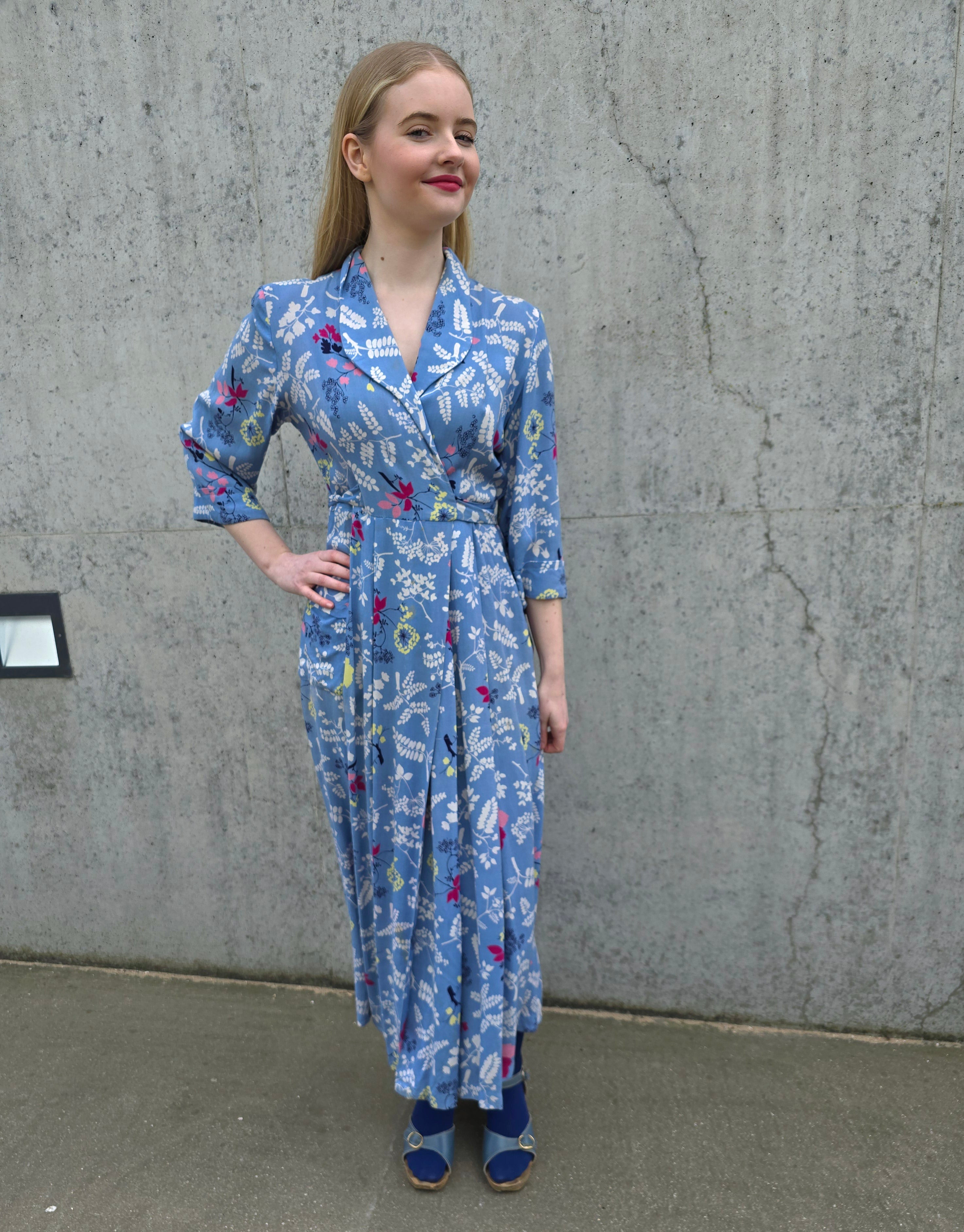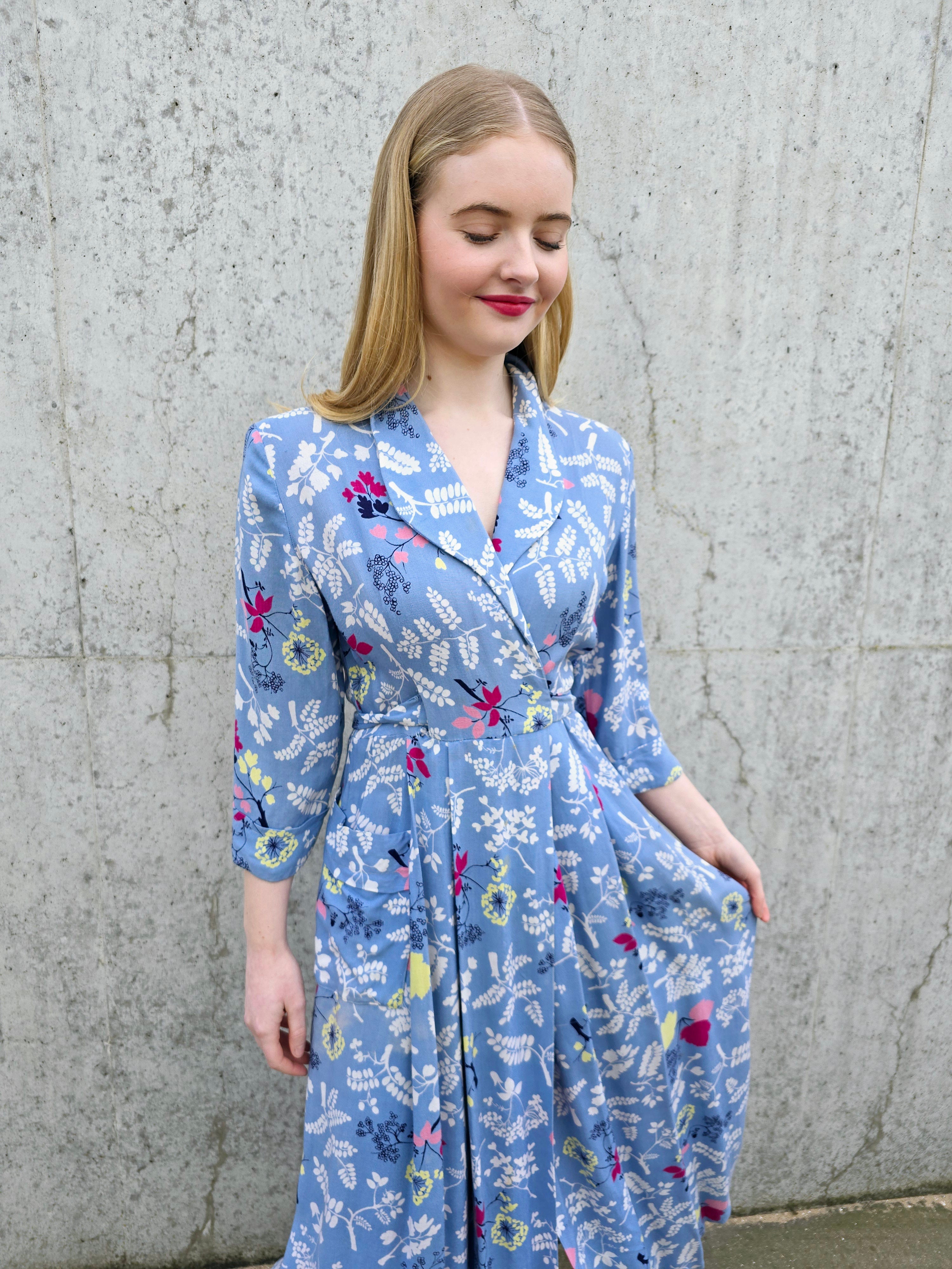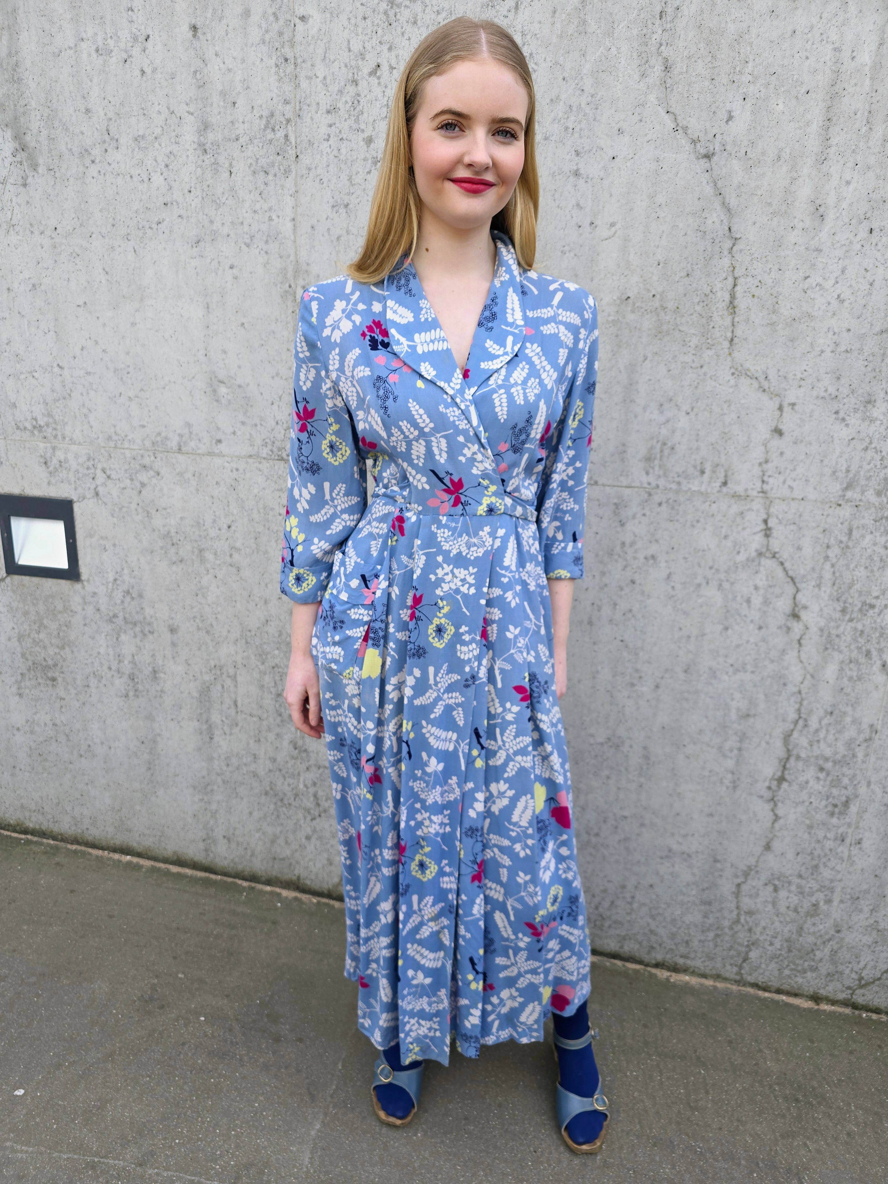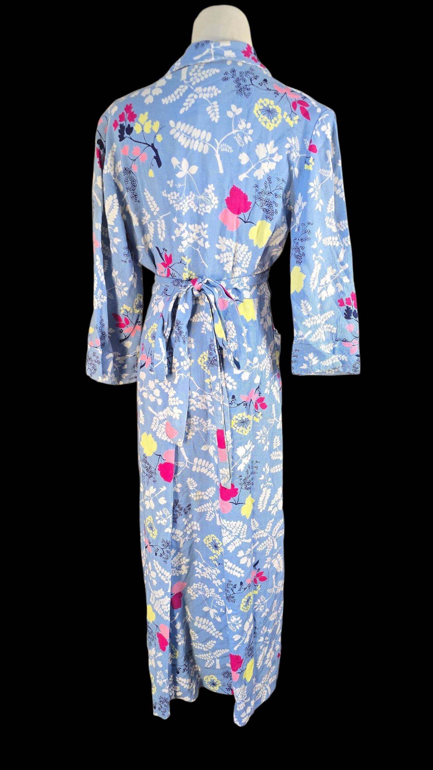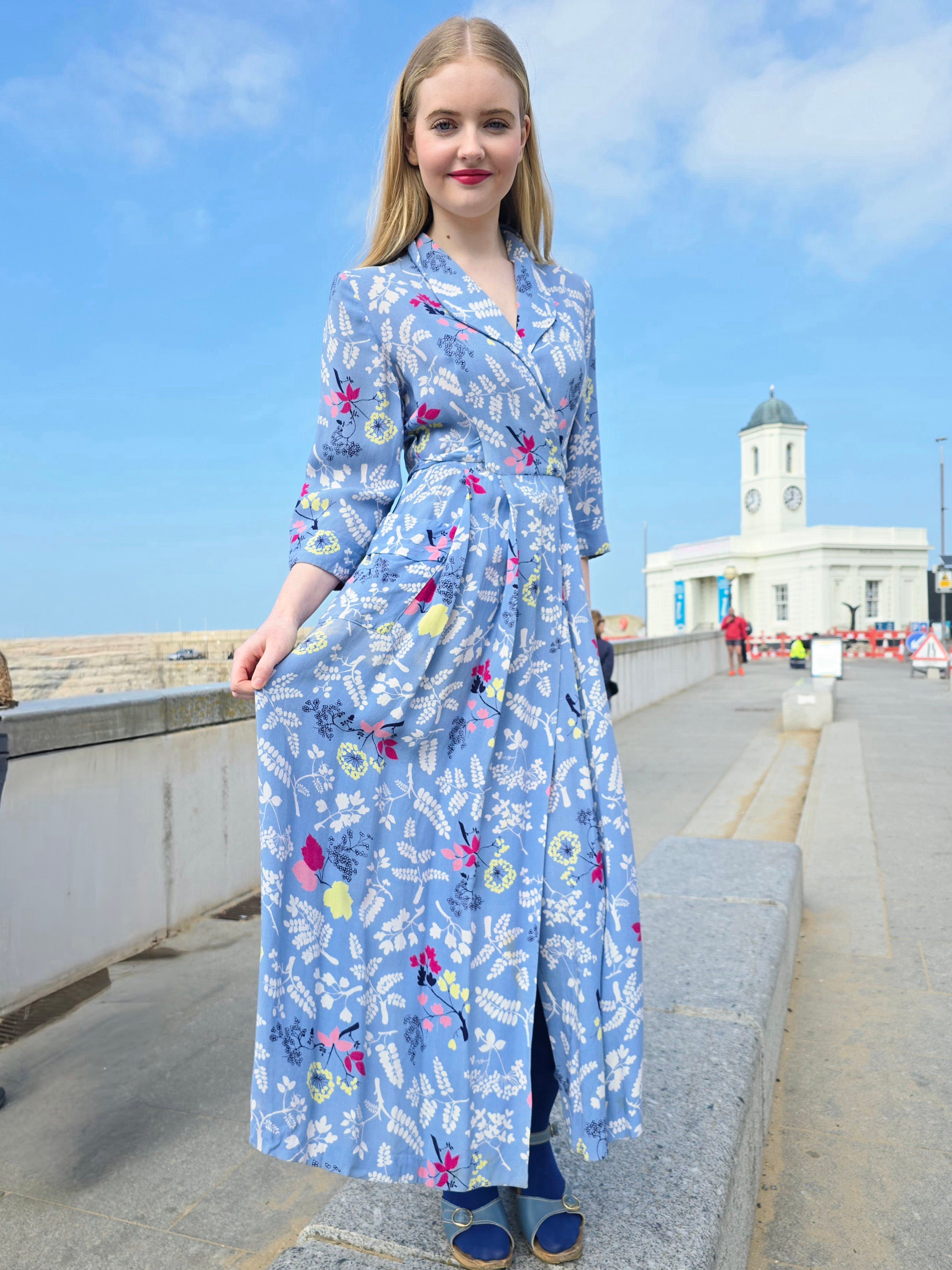 Wraparound style gown that also works as a lovely dress. In a stunning sky blue with the prettiest - oh so 40s- print
