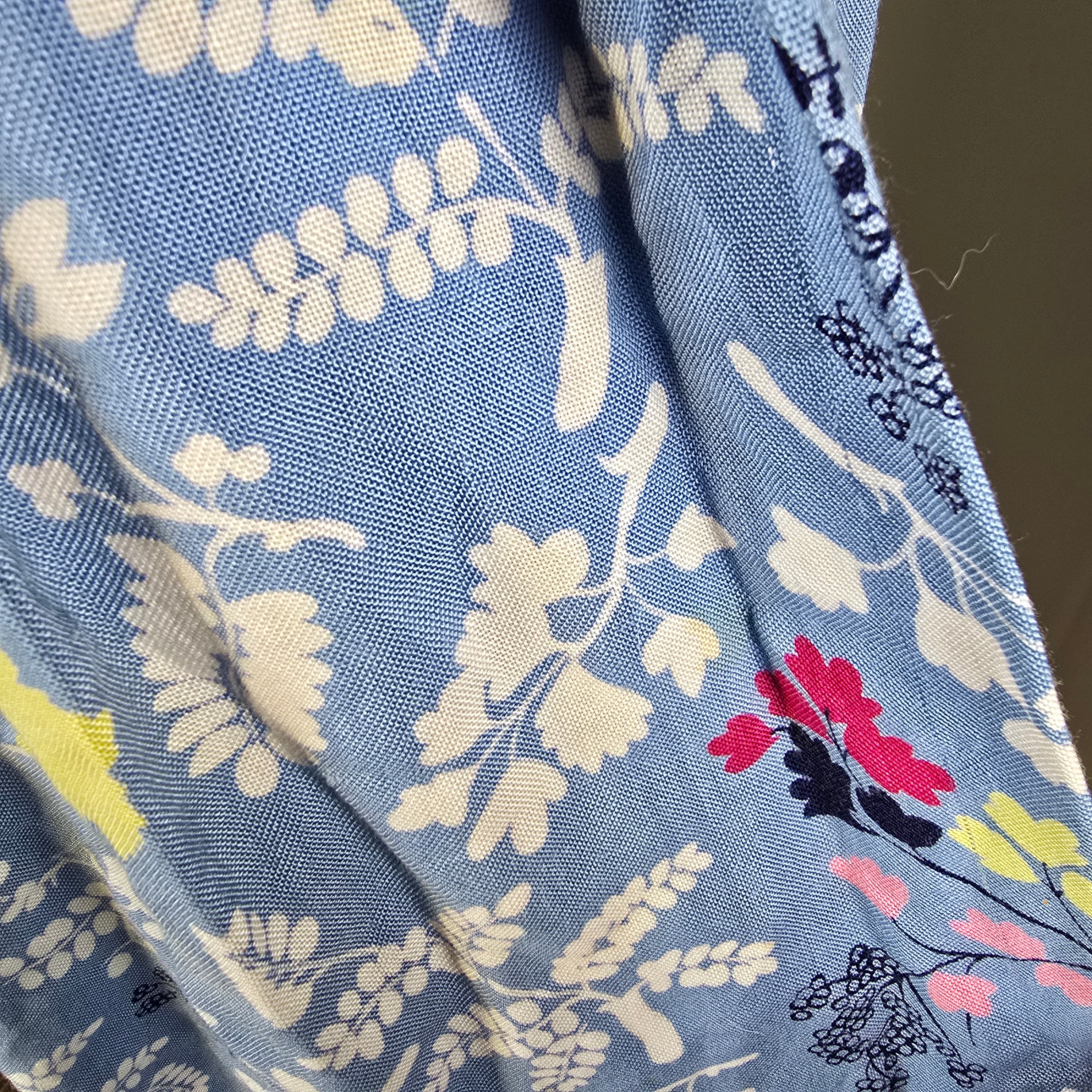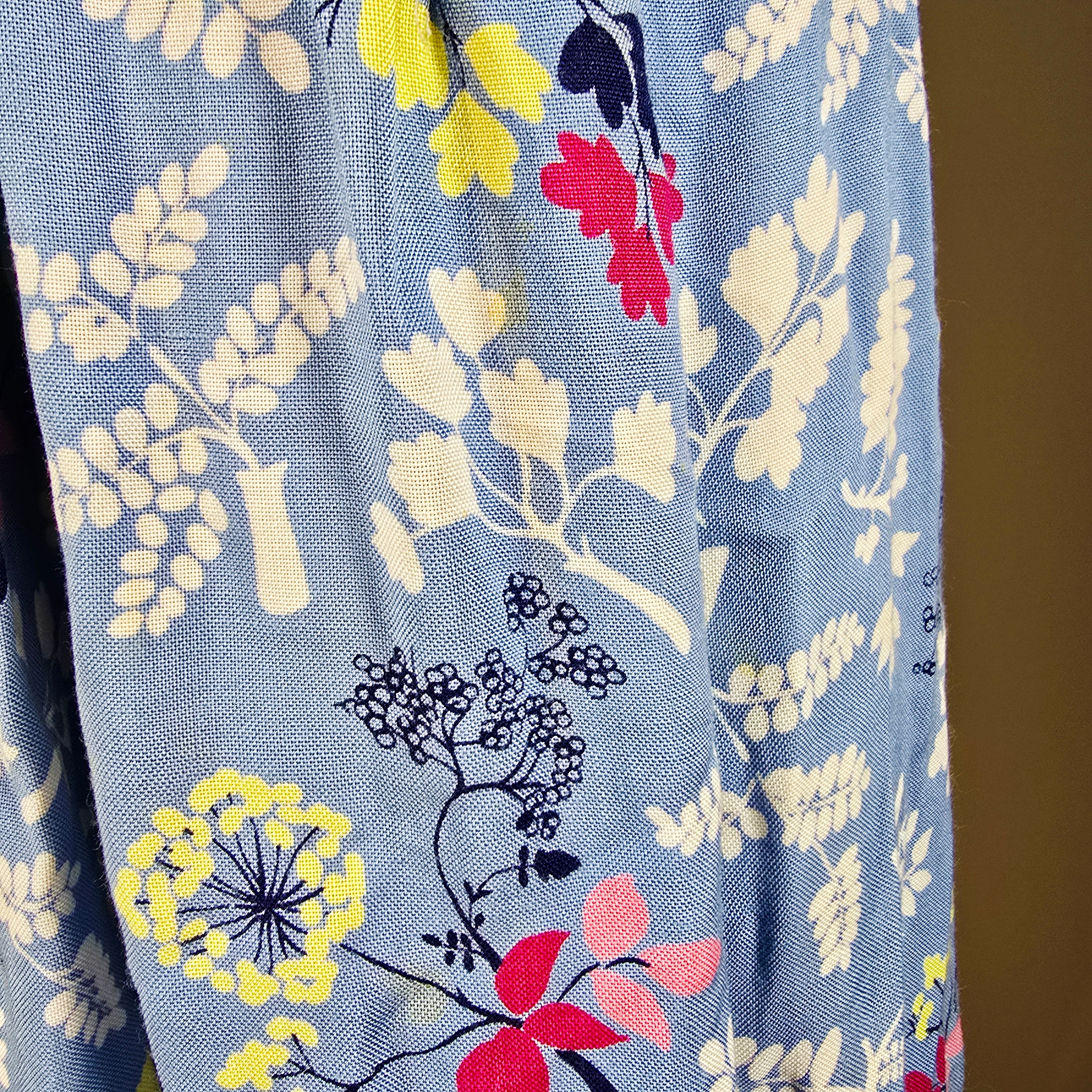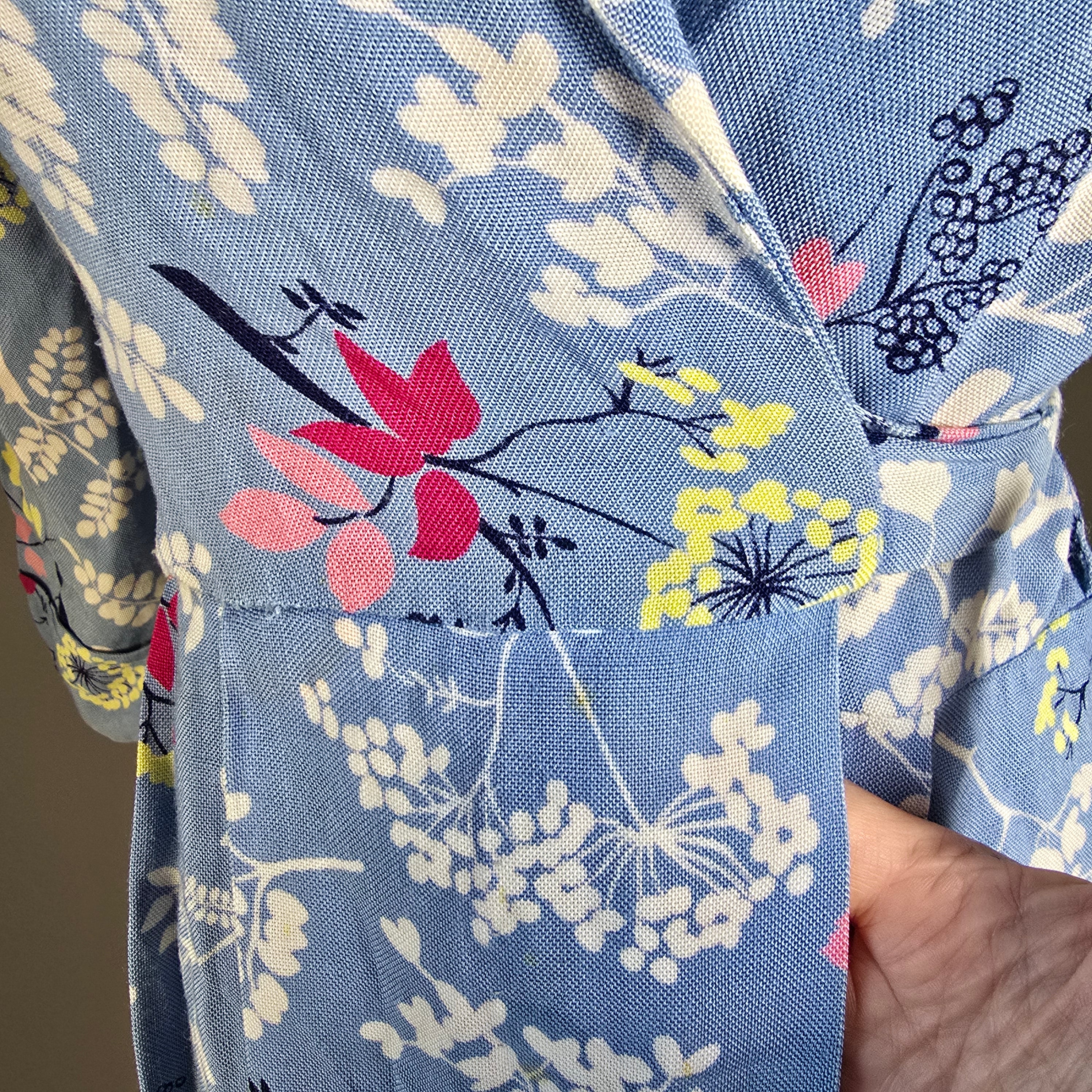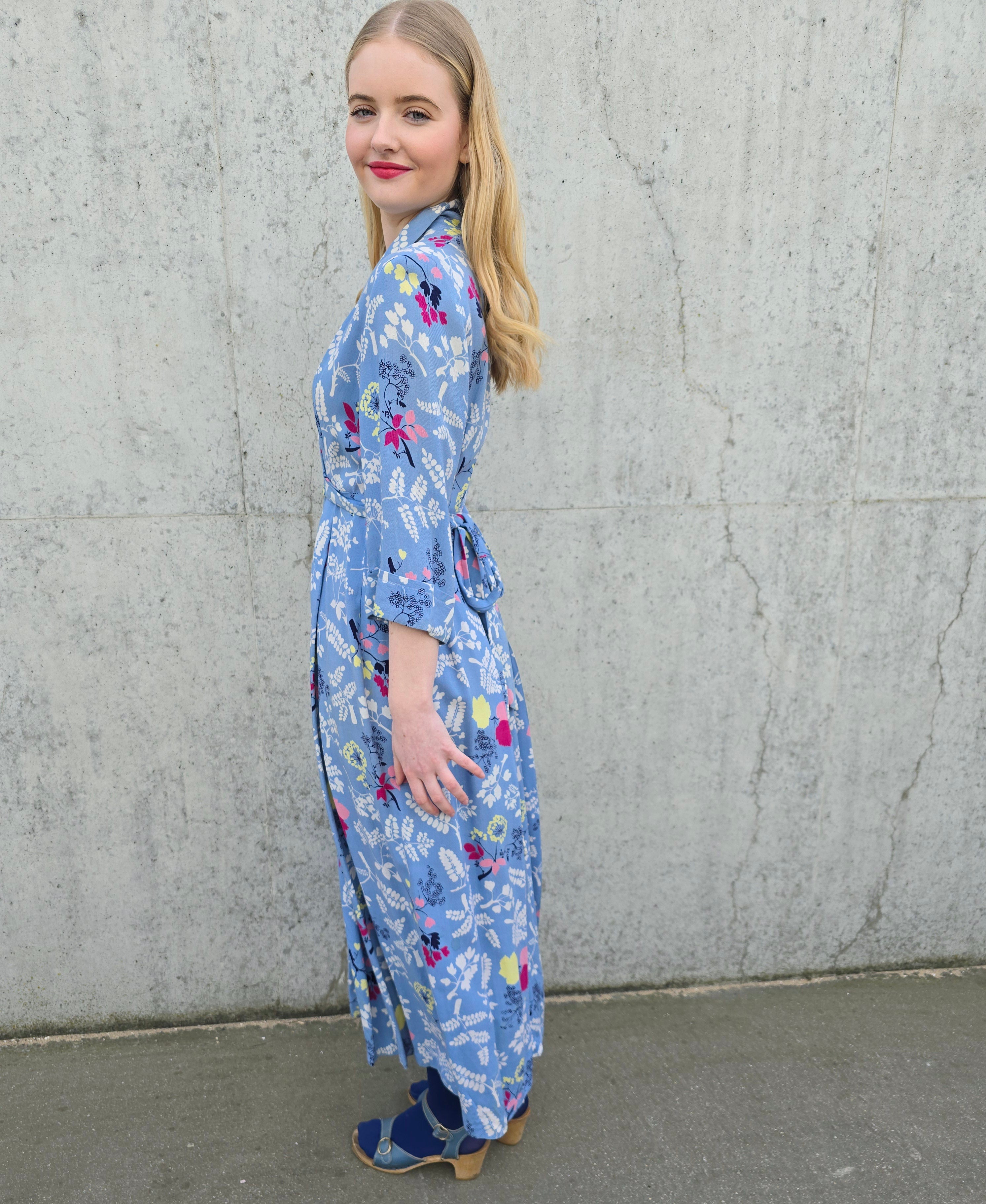 Wraparound style gown that also works as a lovely dress. In a stunning sky blue with the prettiest - oh so 40s- print