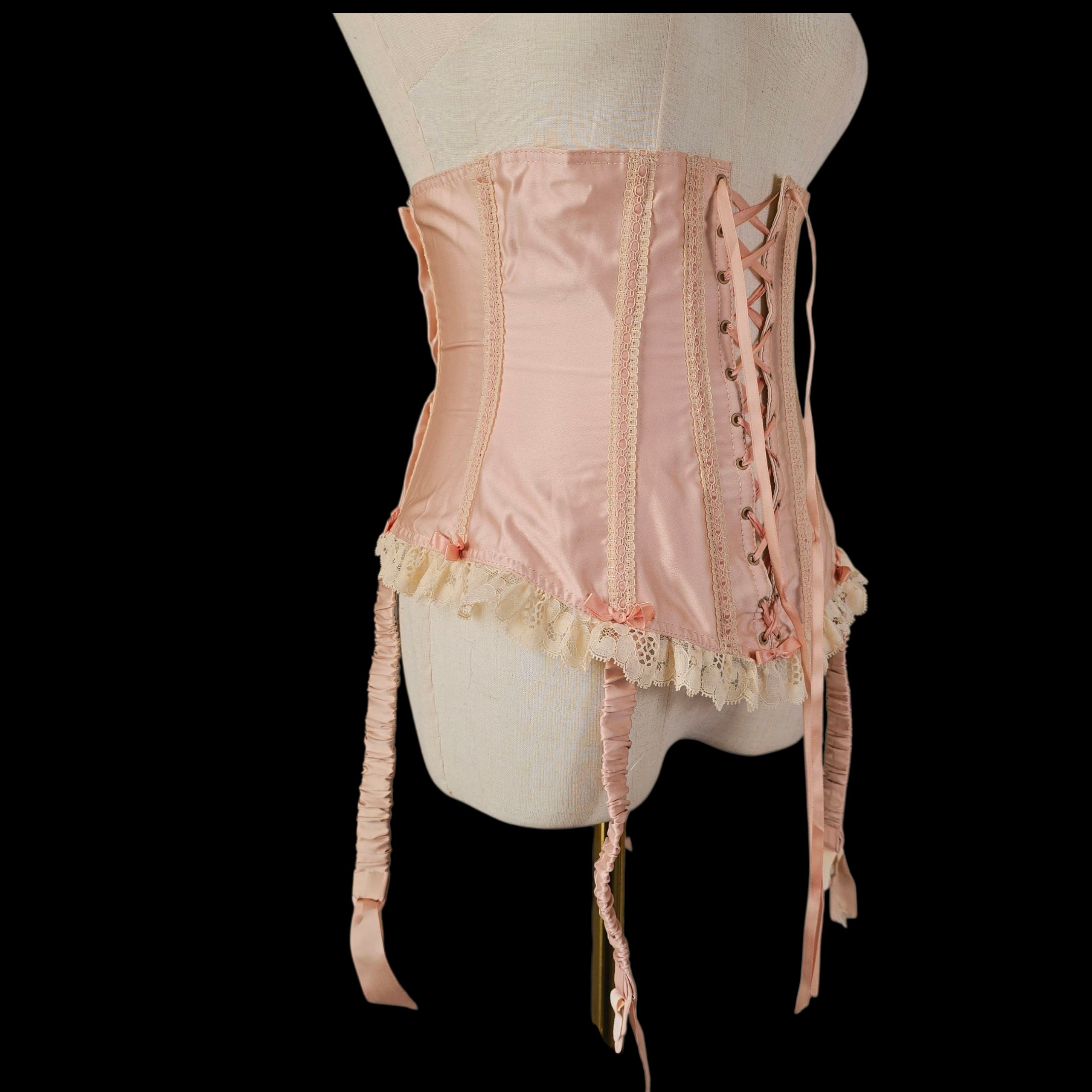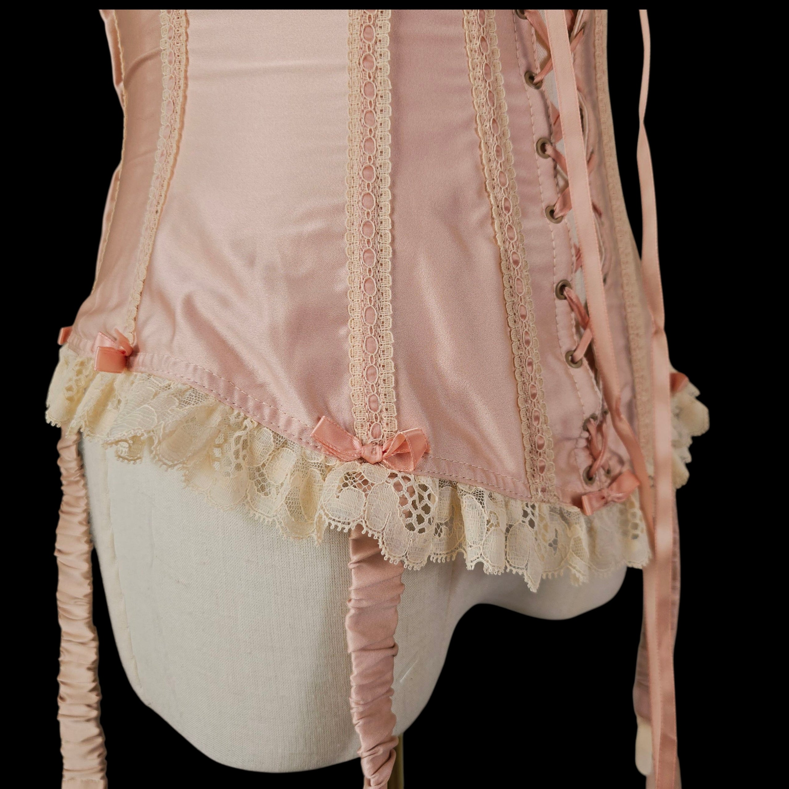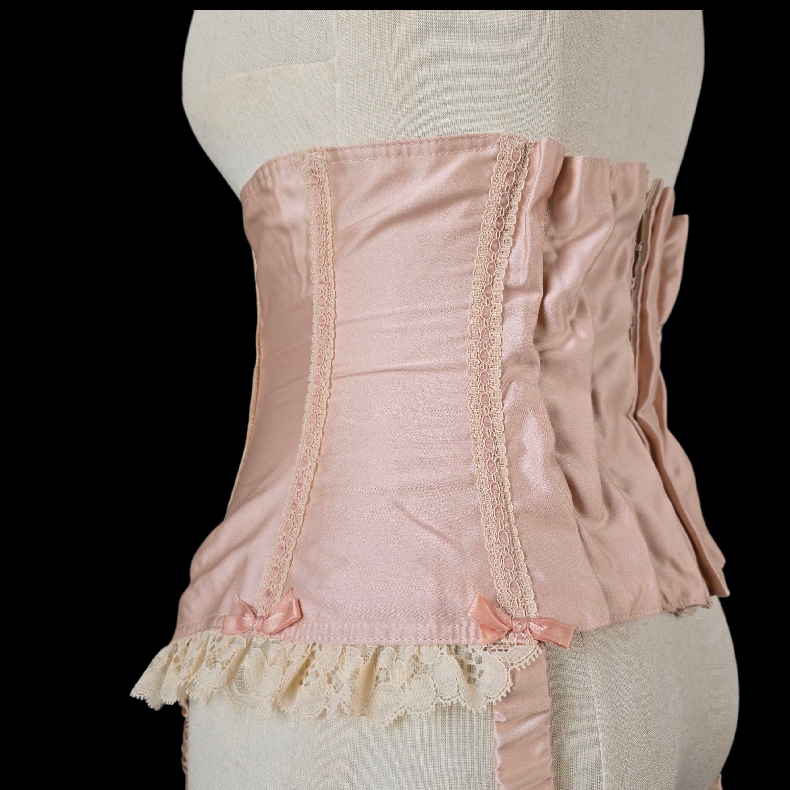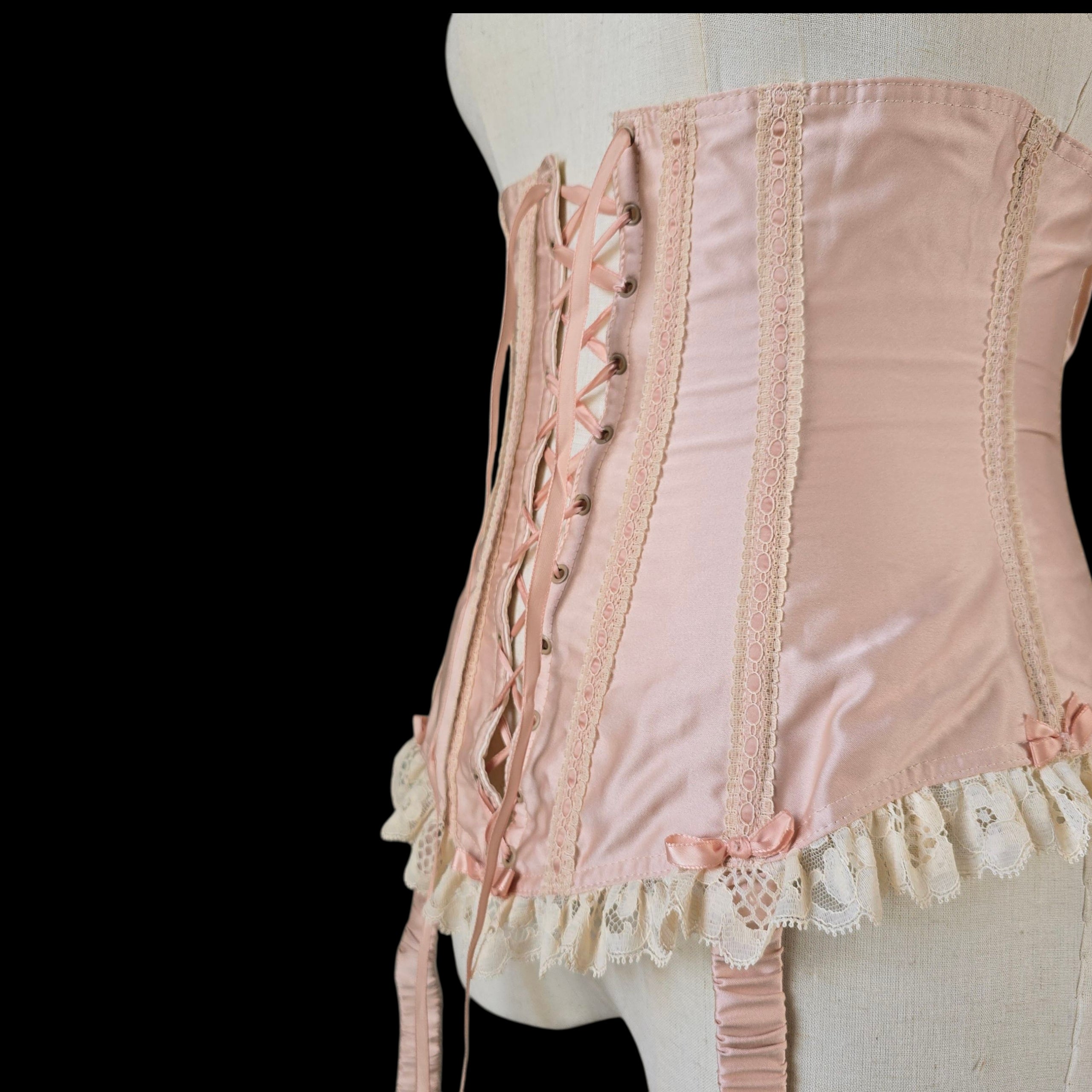 Crafted from the prettiest Blush Peach Satin this rare vintage piece features an adjustable lace-up ribbon front and has Champagne tone scalloped floral lace trim on the peplum which is repeated on the body with Blush silk ribbon laced through
