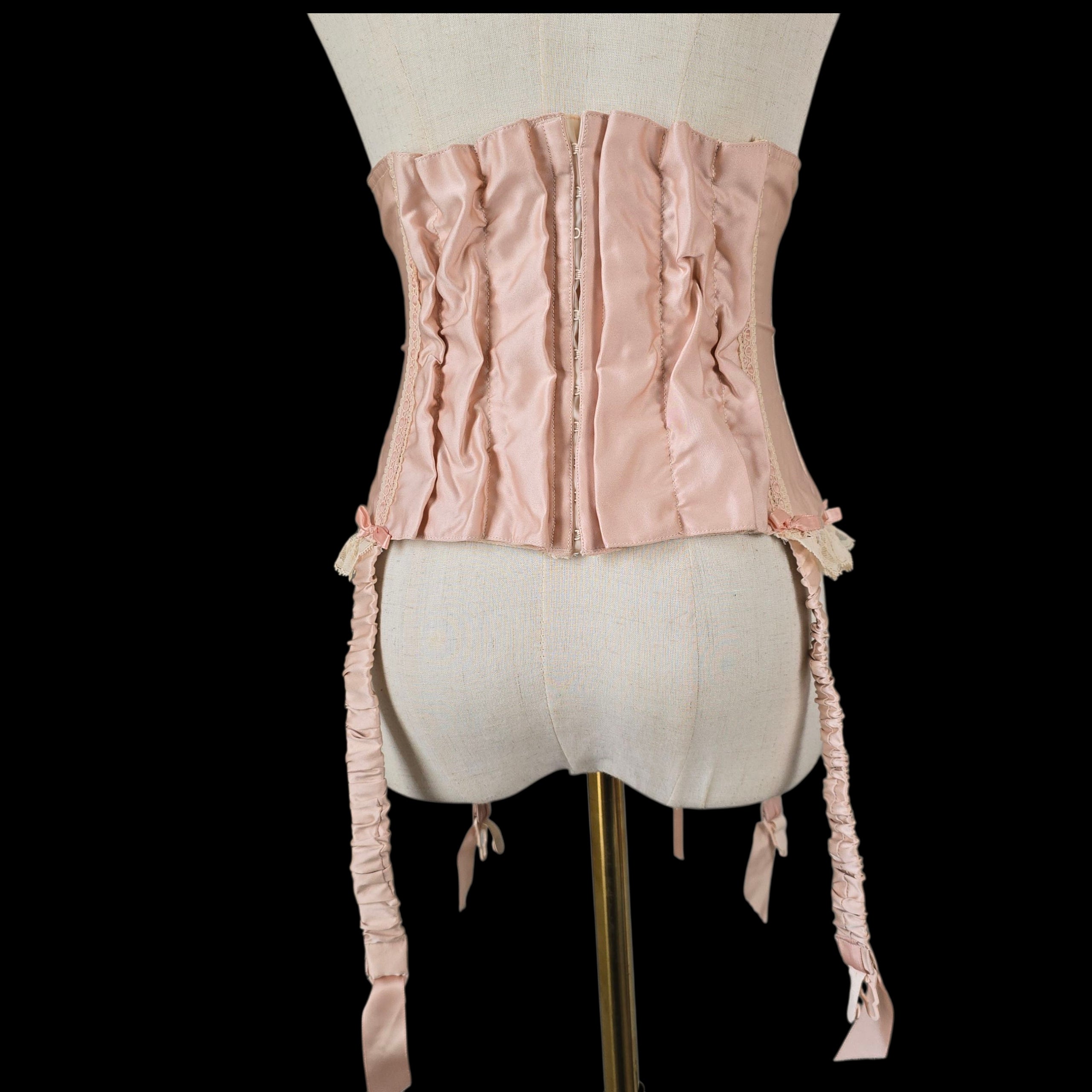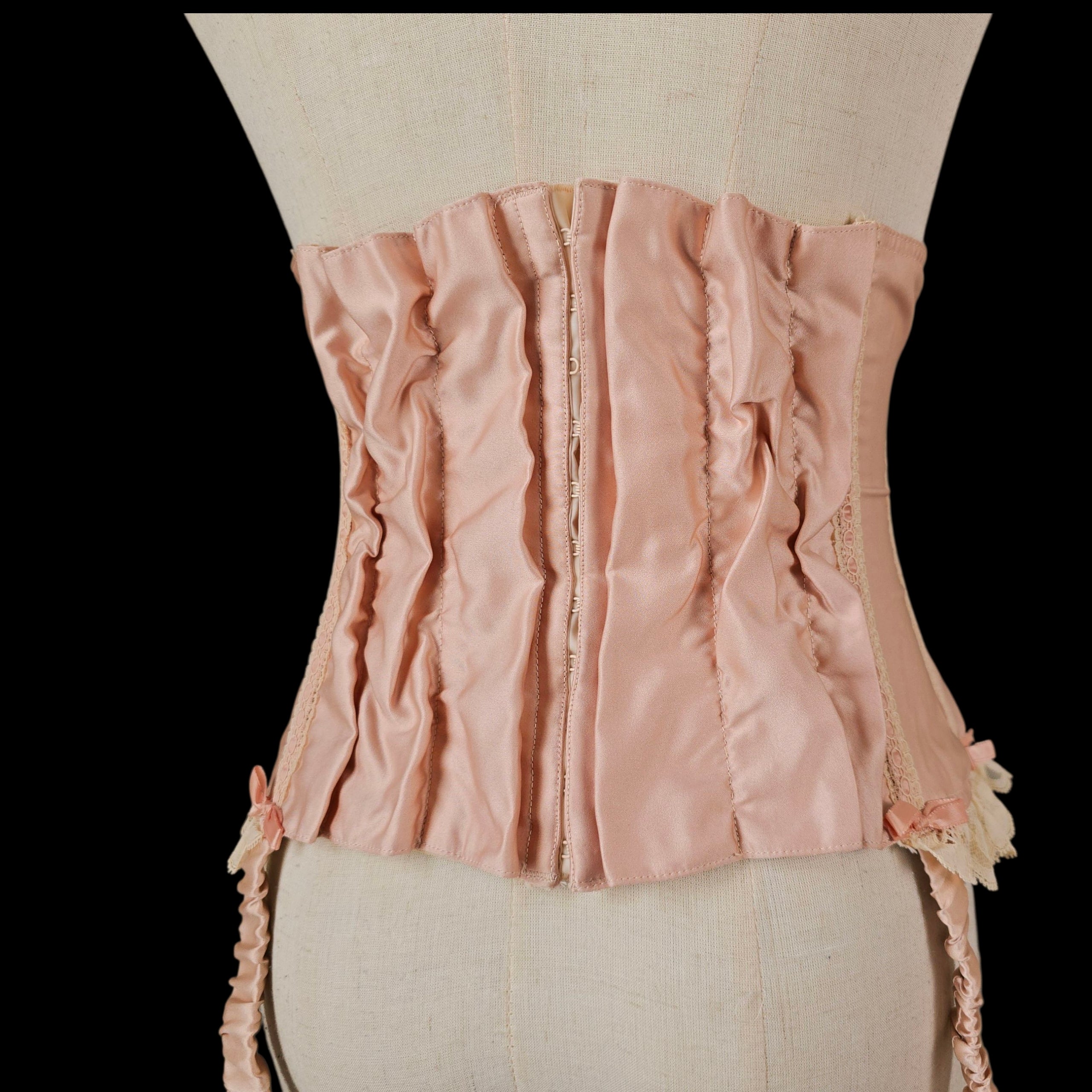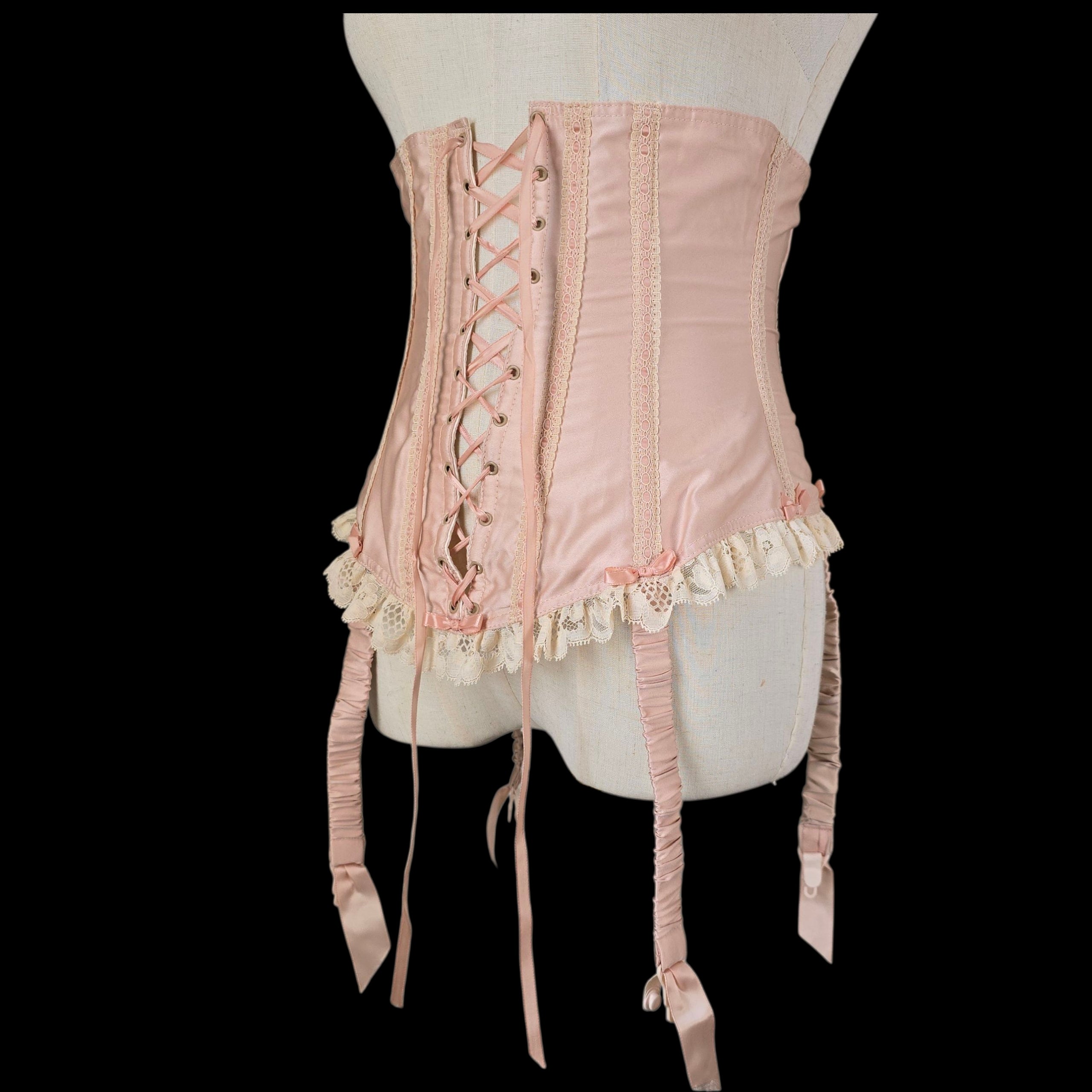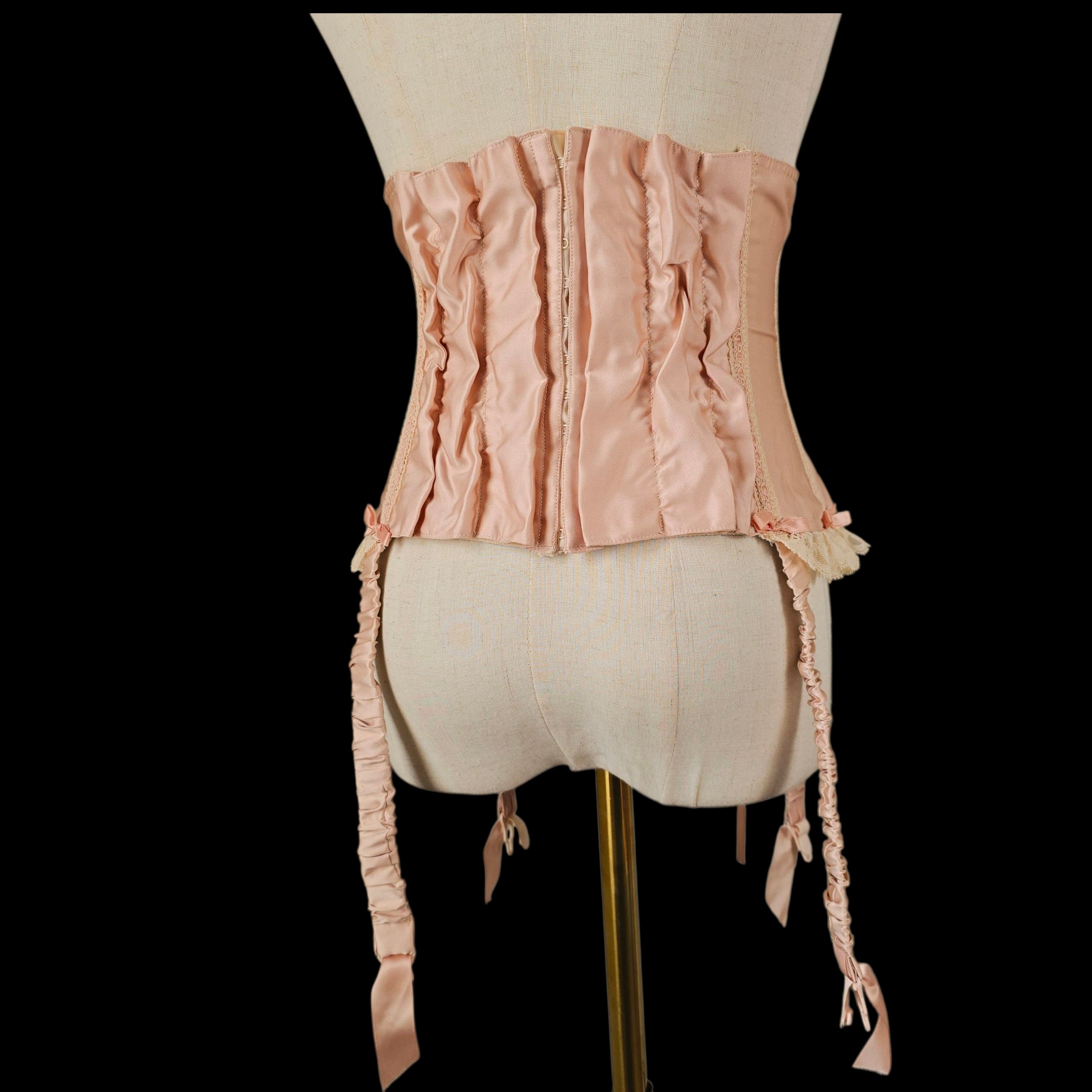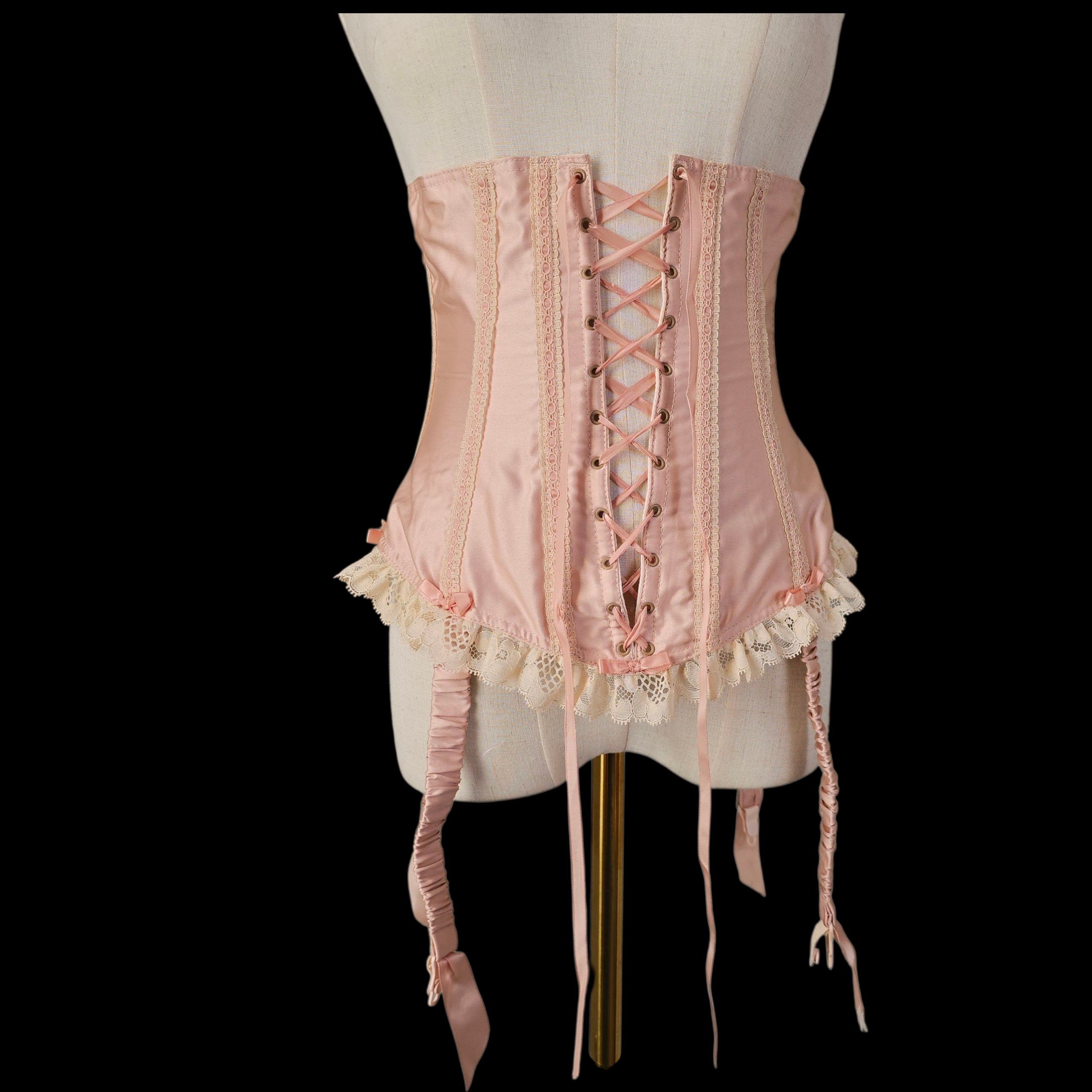 Crafted from the prettiest Blush Peach Satin this rare vintage piece features an adjustable lace-up ribbon front and has Champagne tone scalloped floral lace trim on the peplum which is repeated on the body with Blush silk ribbon laced through