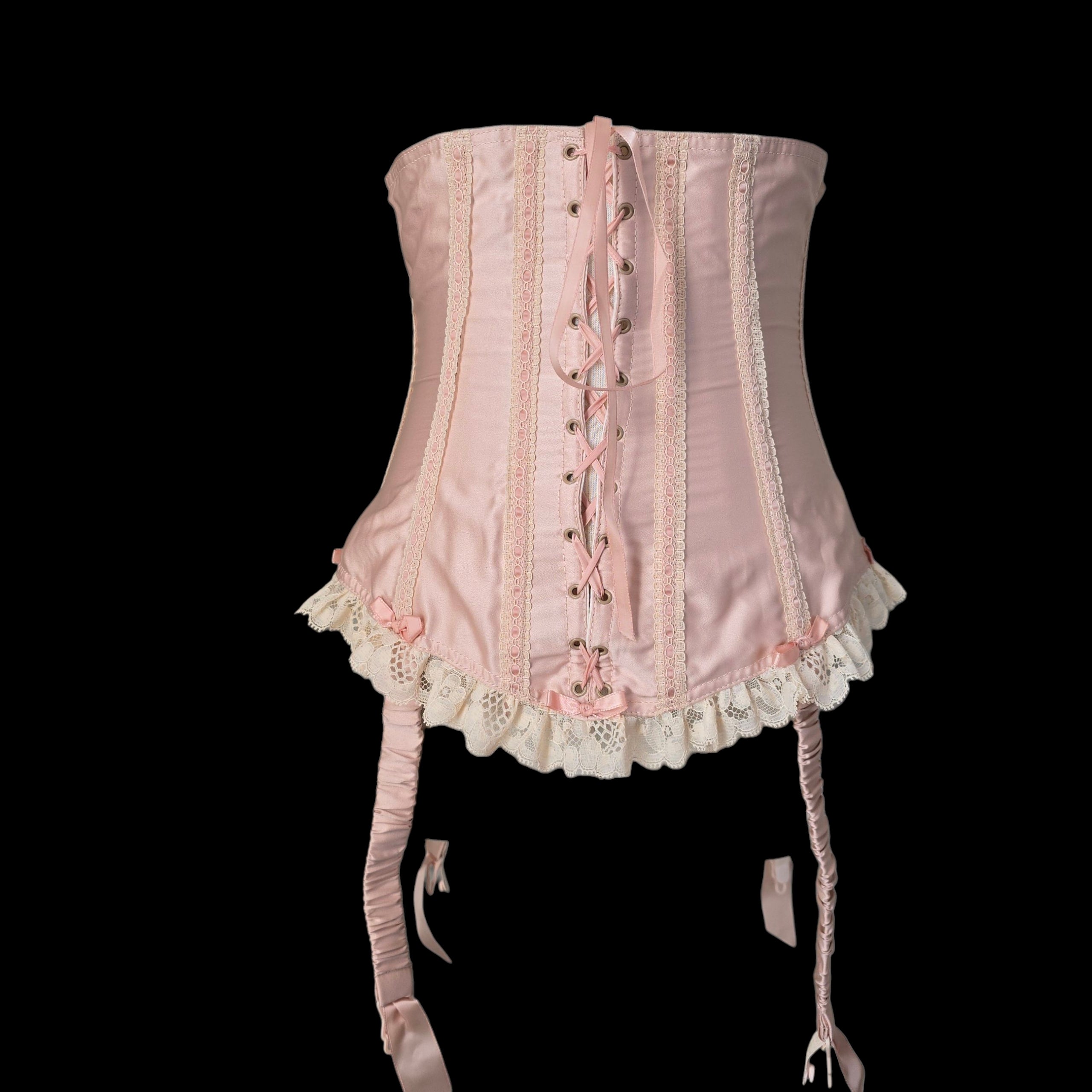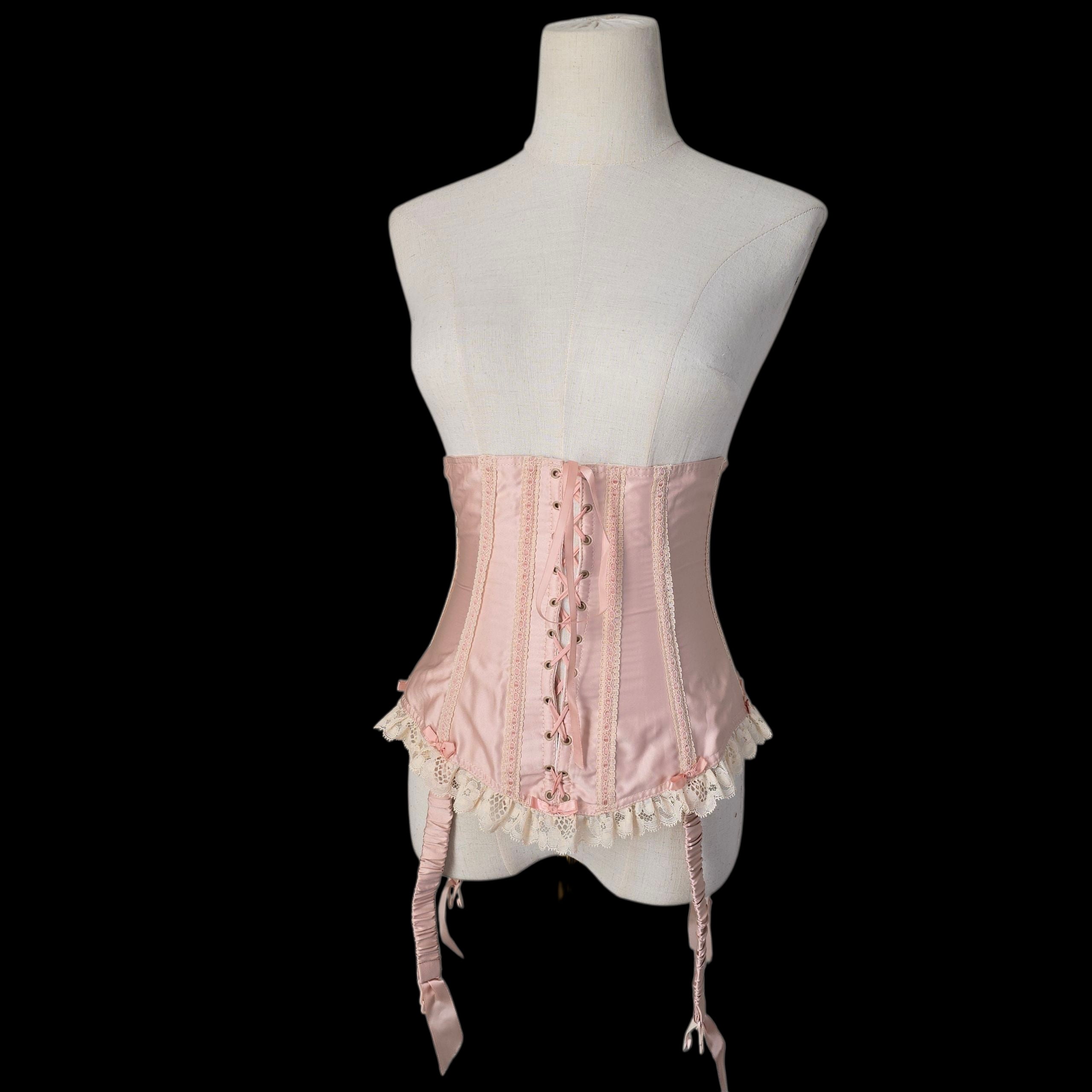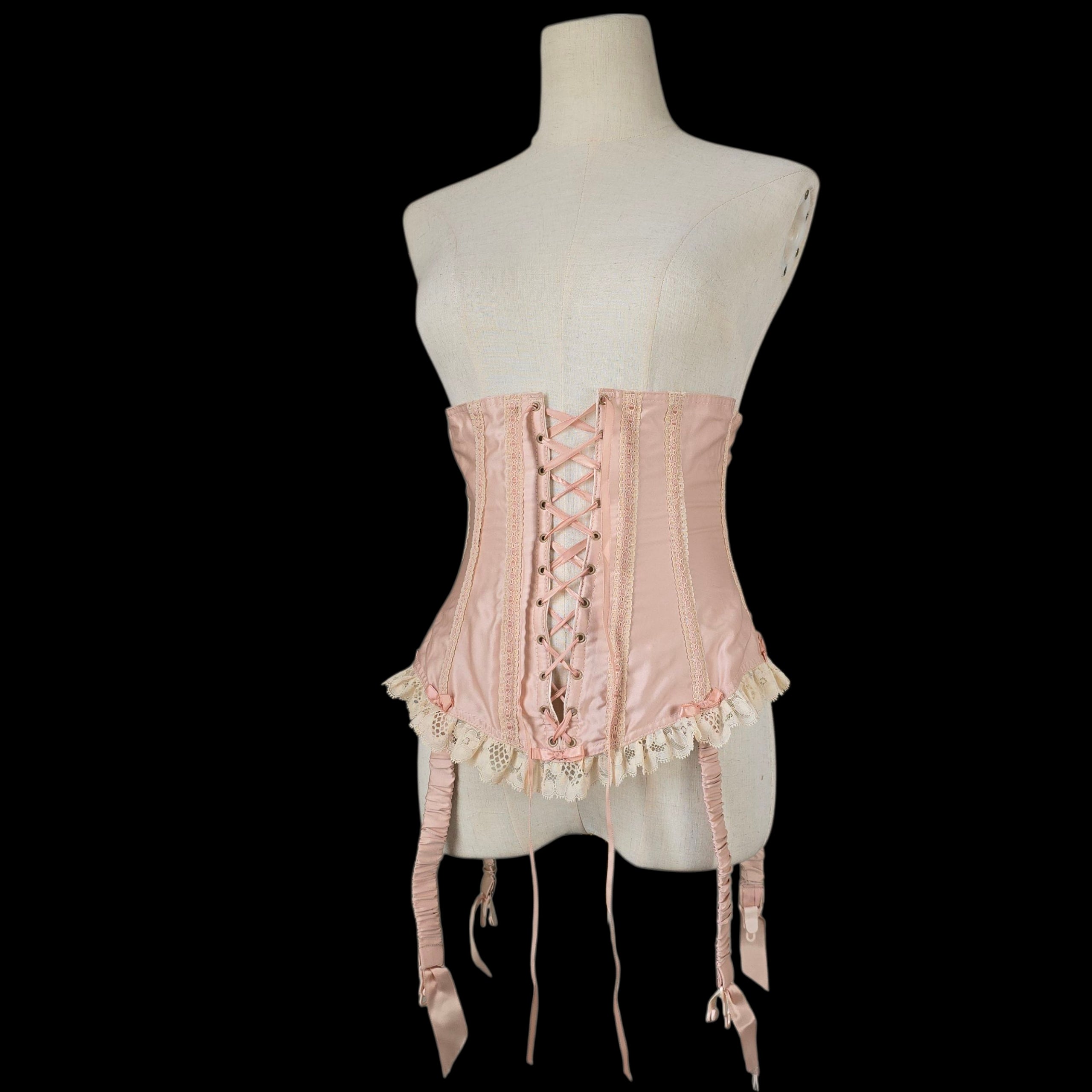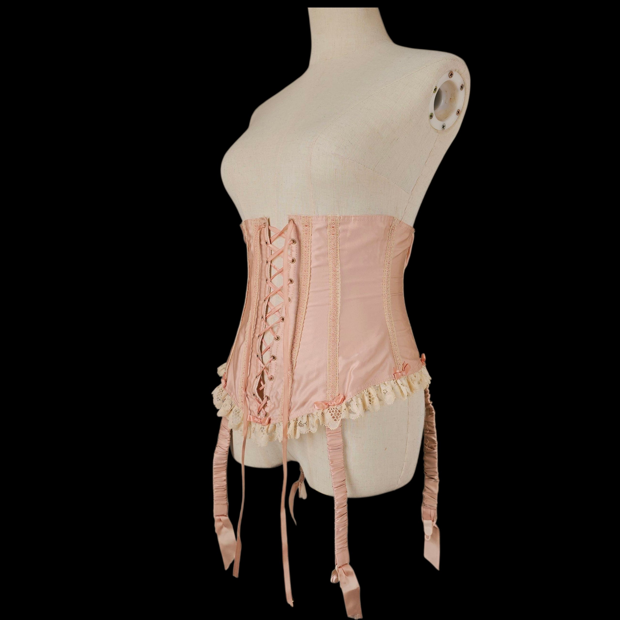 Crafted from the prettiest Blush Peach Satin this rare vintage piece features an adjustable lace-up ribbon front and has Champagne tone scalloped floral lace trim on the peplum which is repeated on the body with Blush silk ribbon laced through