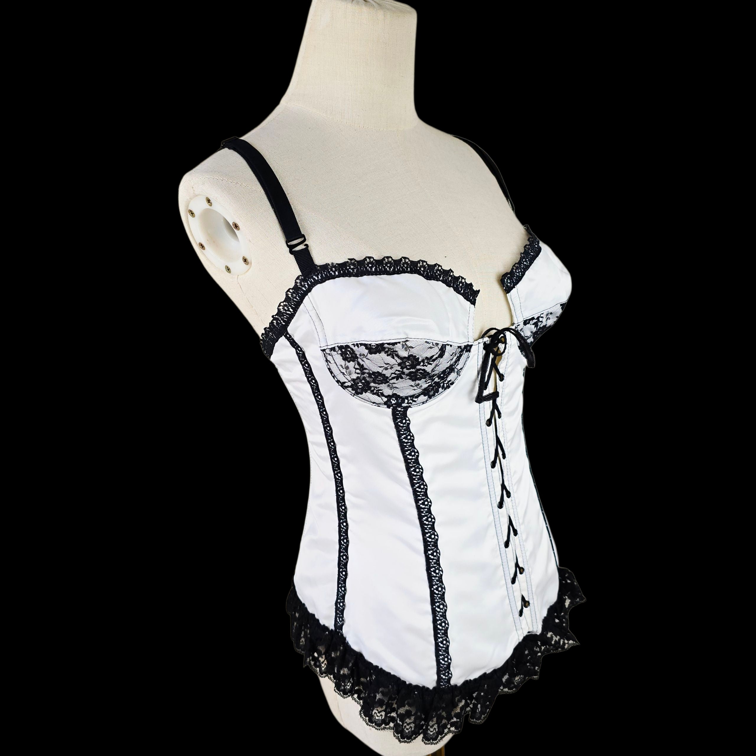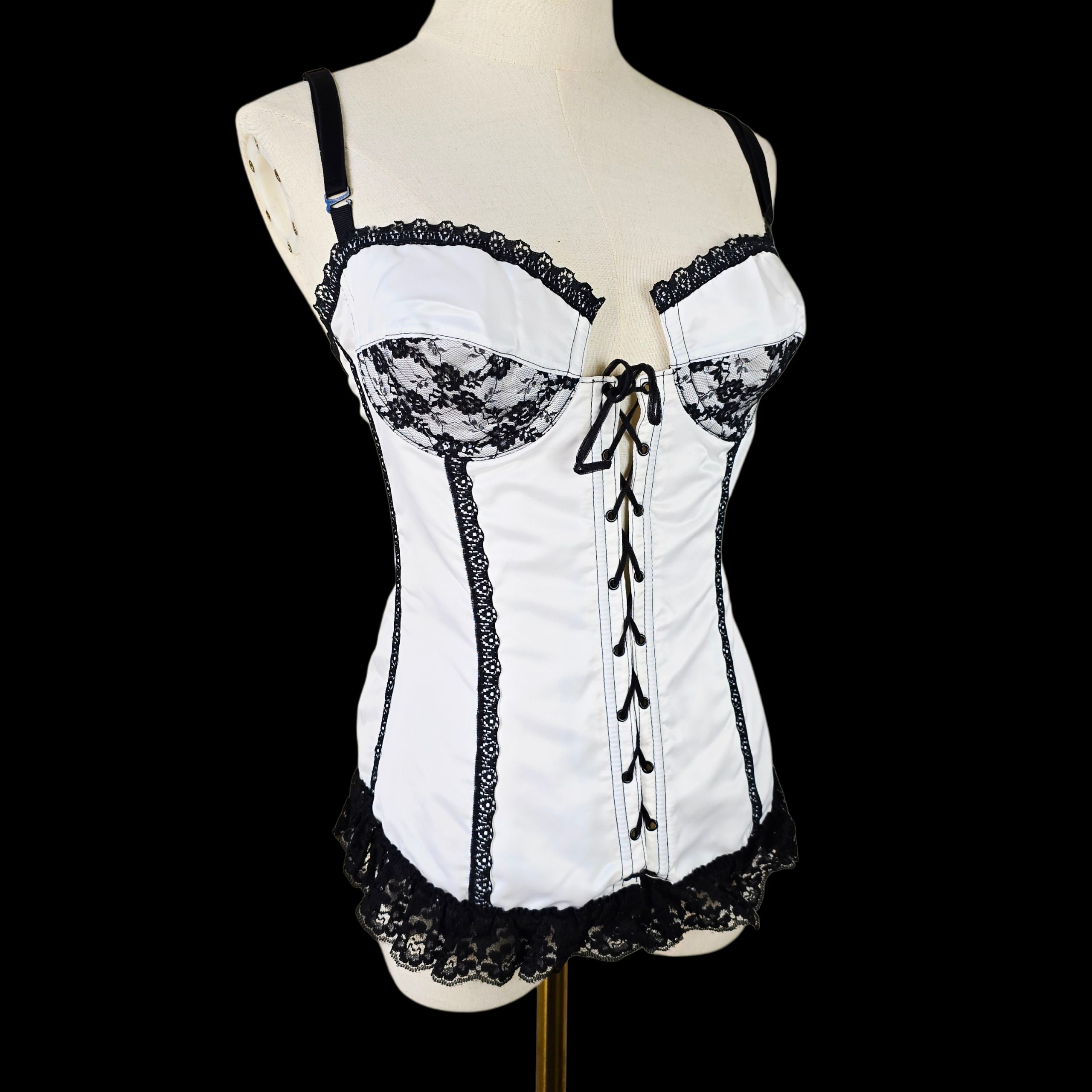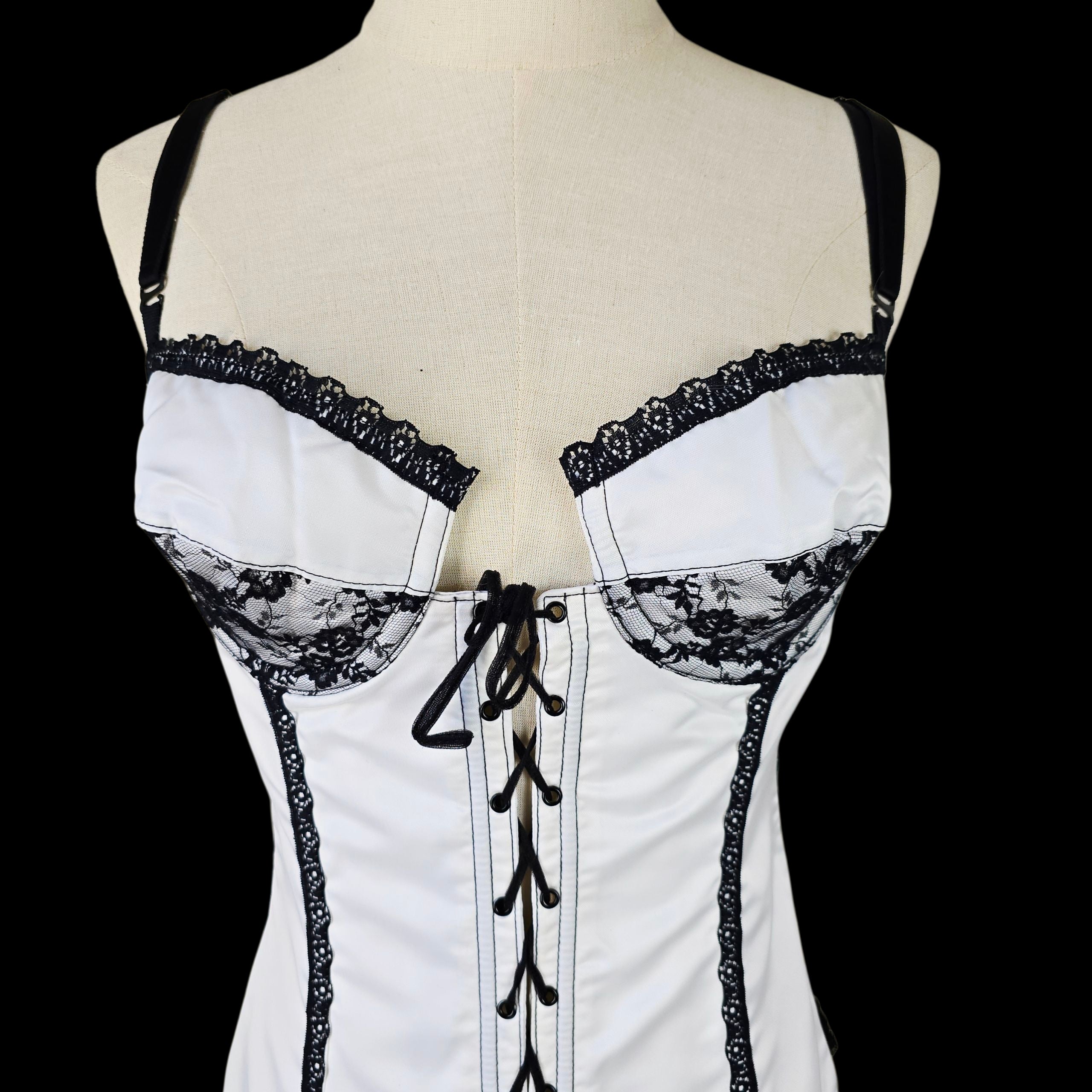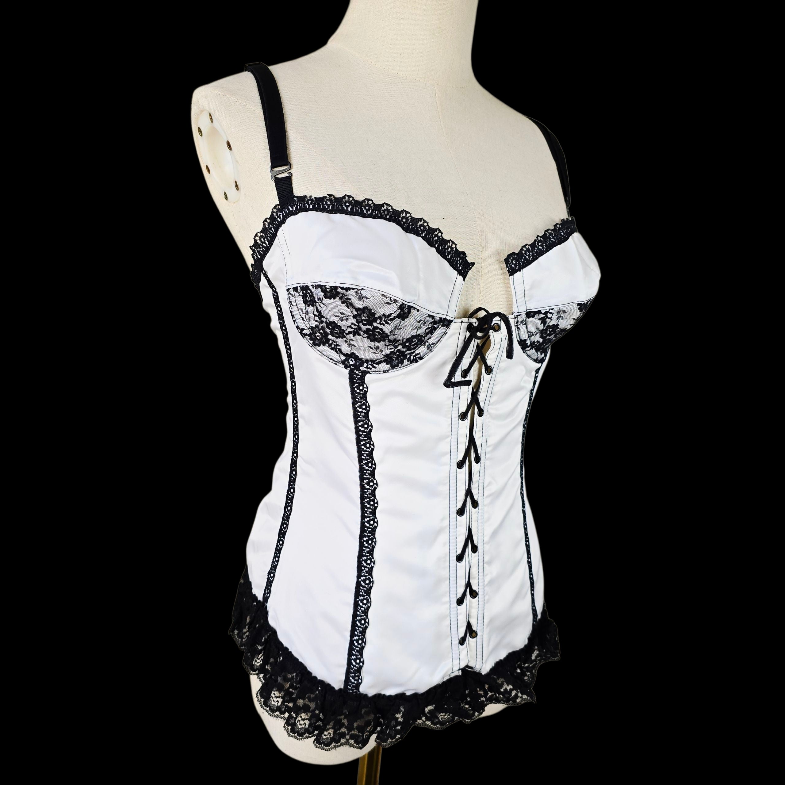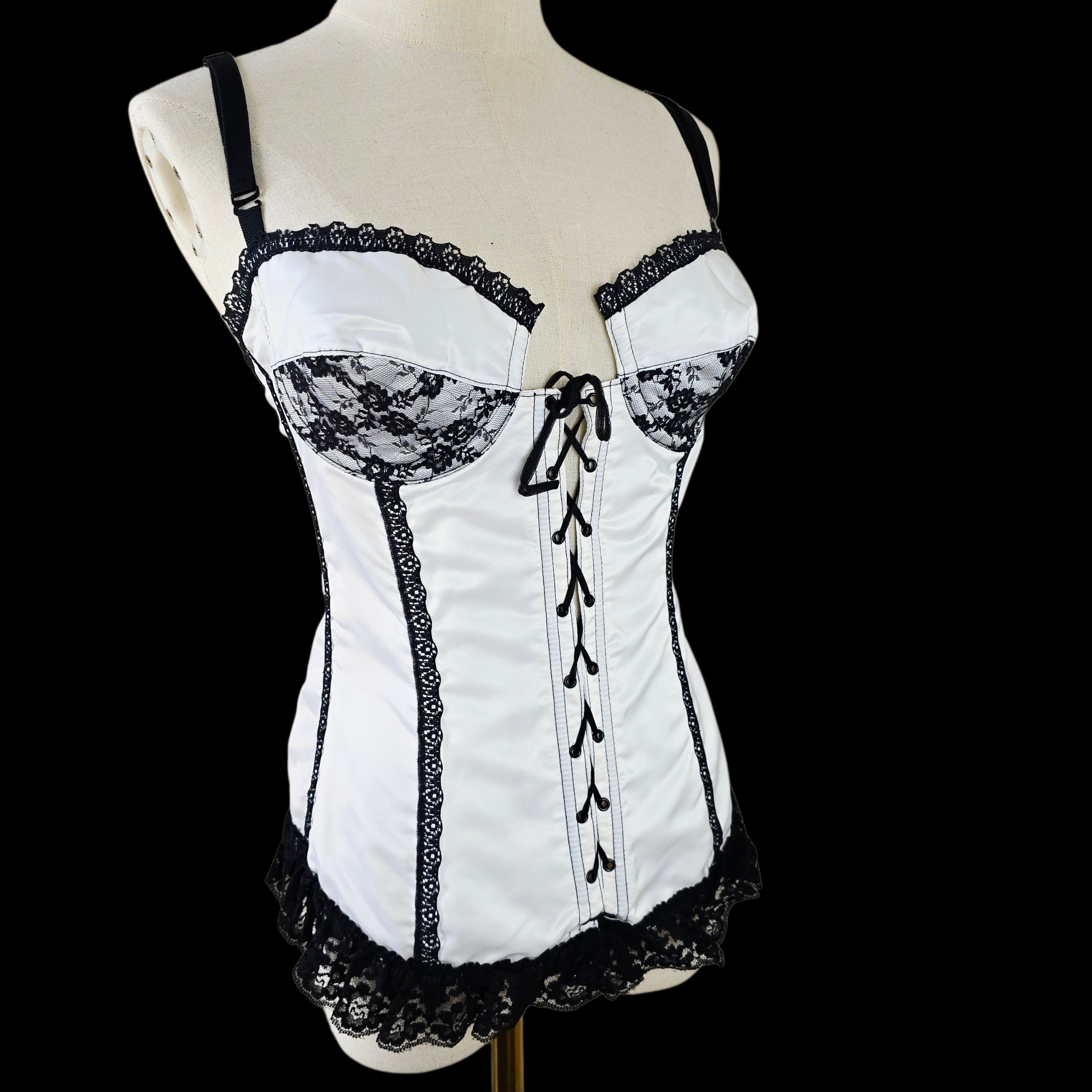 Glamorous and sexy, this White and Black vintage satin Corset is perfect to wear both under and over clothes!
