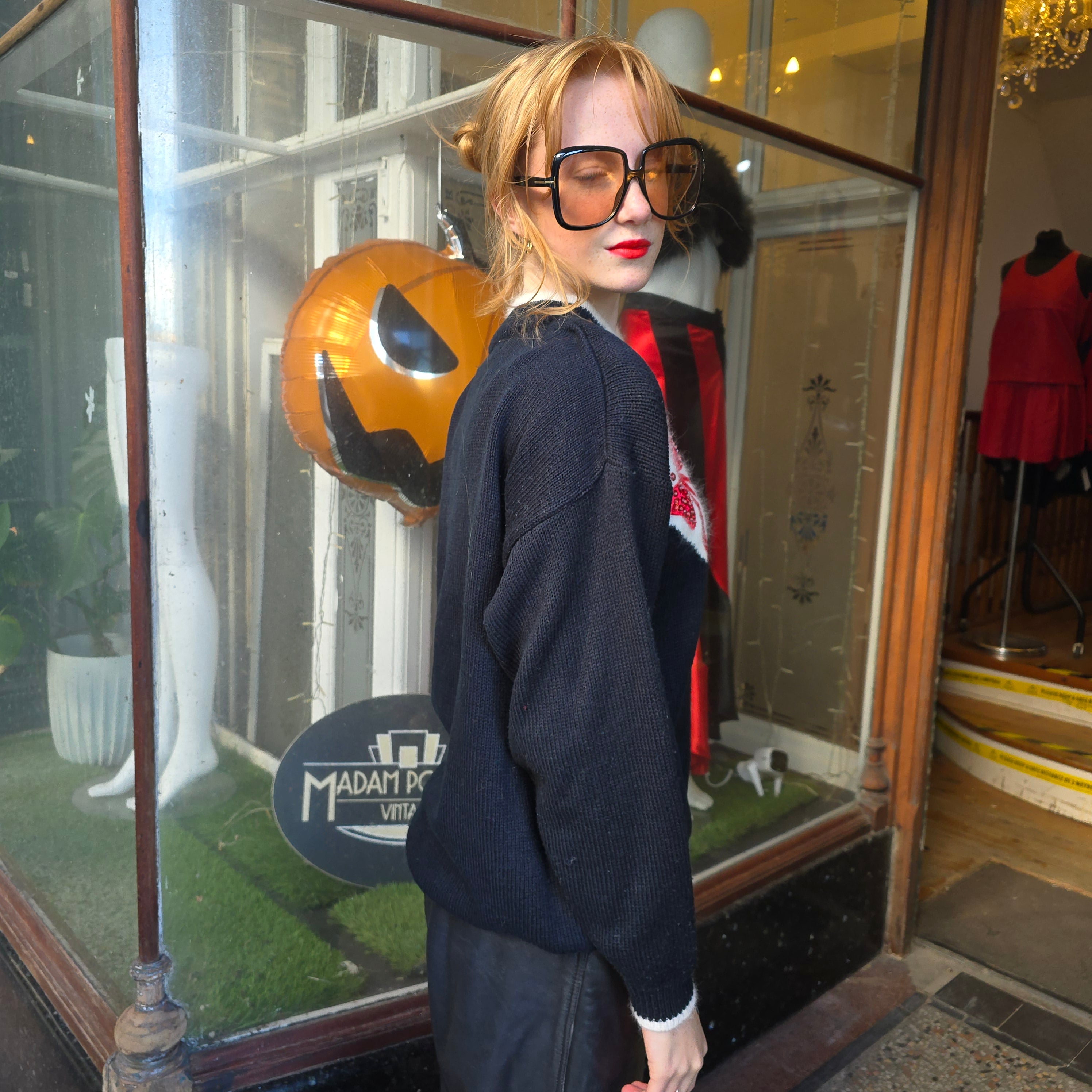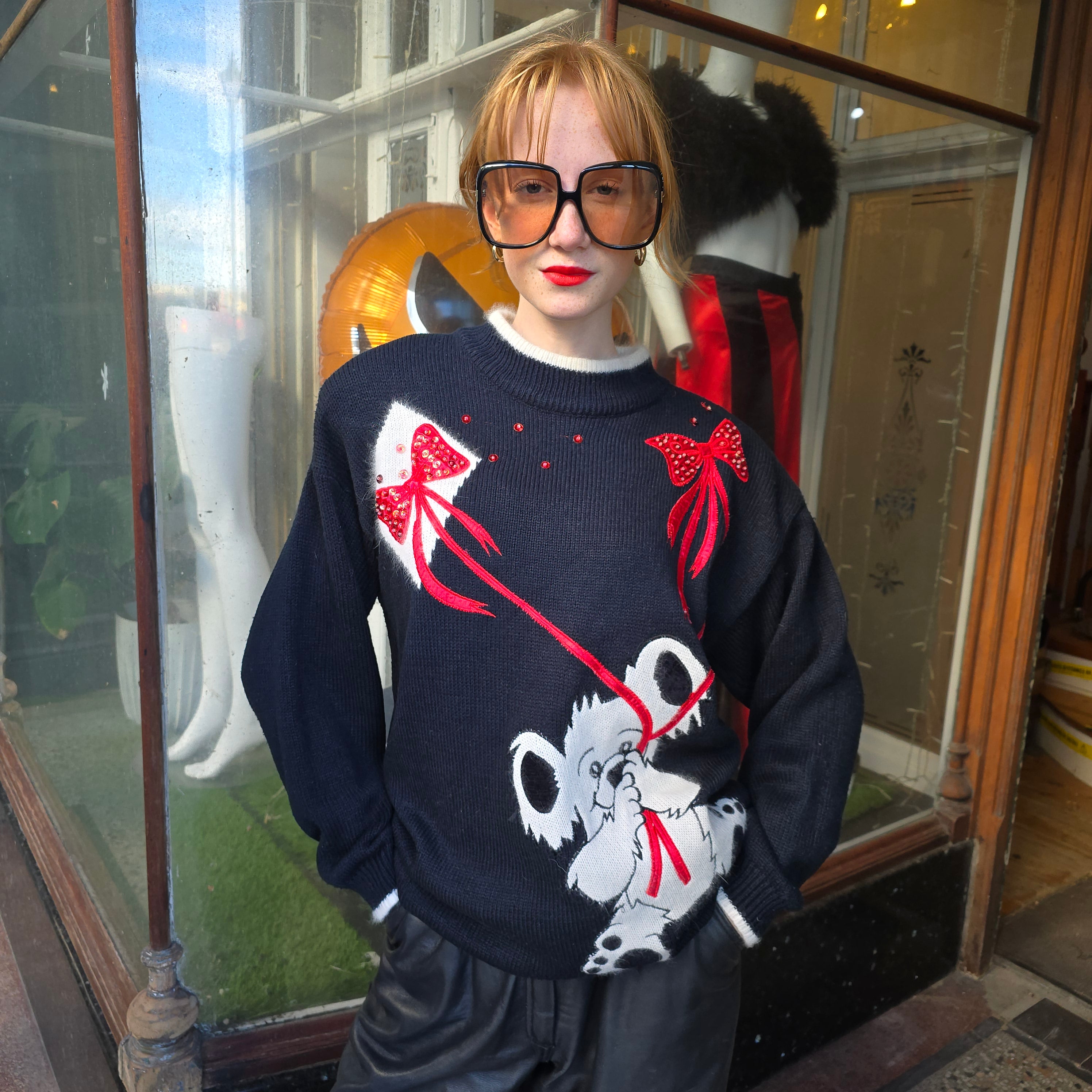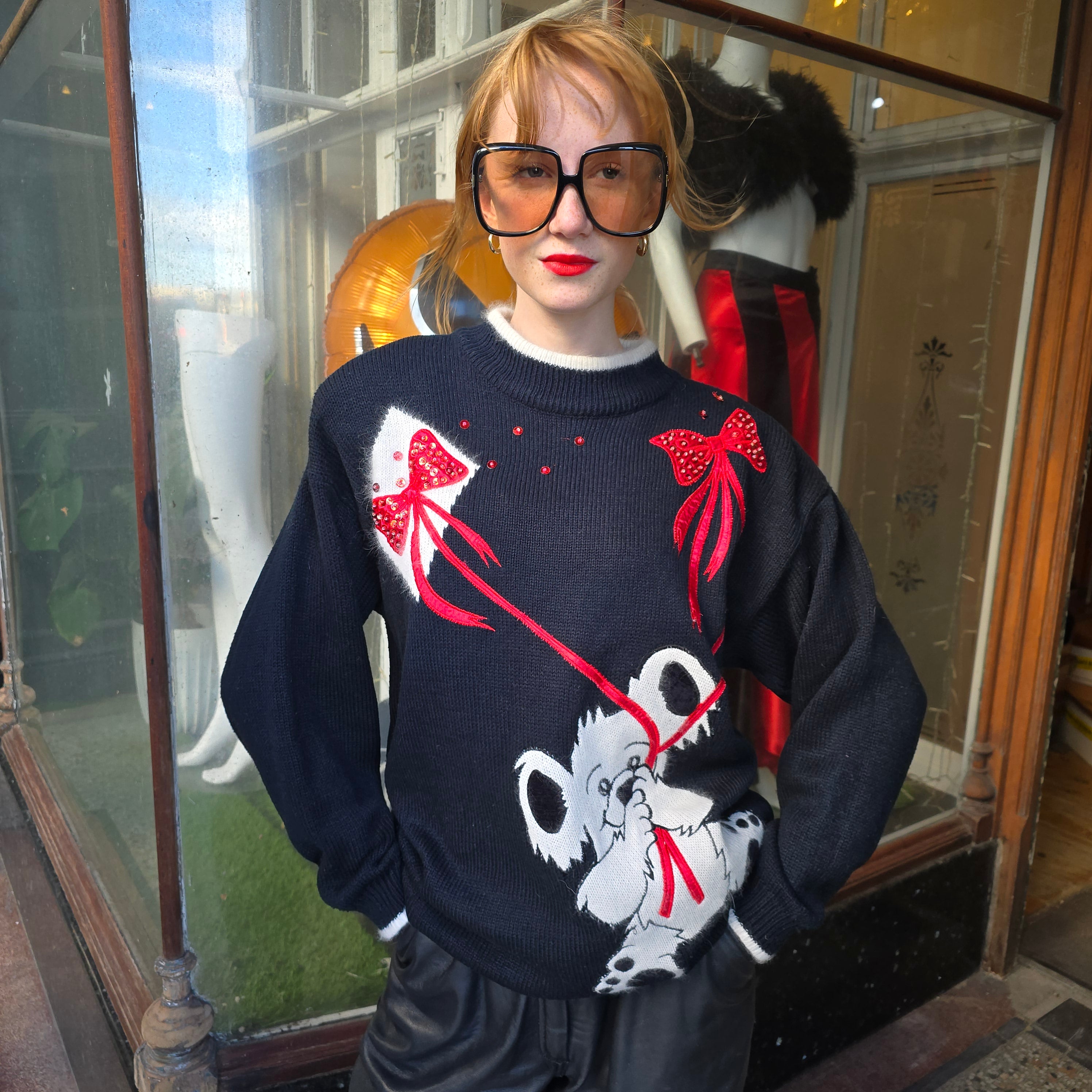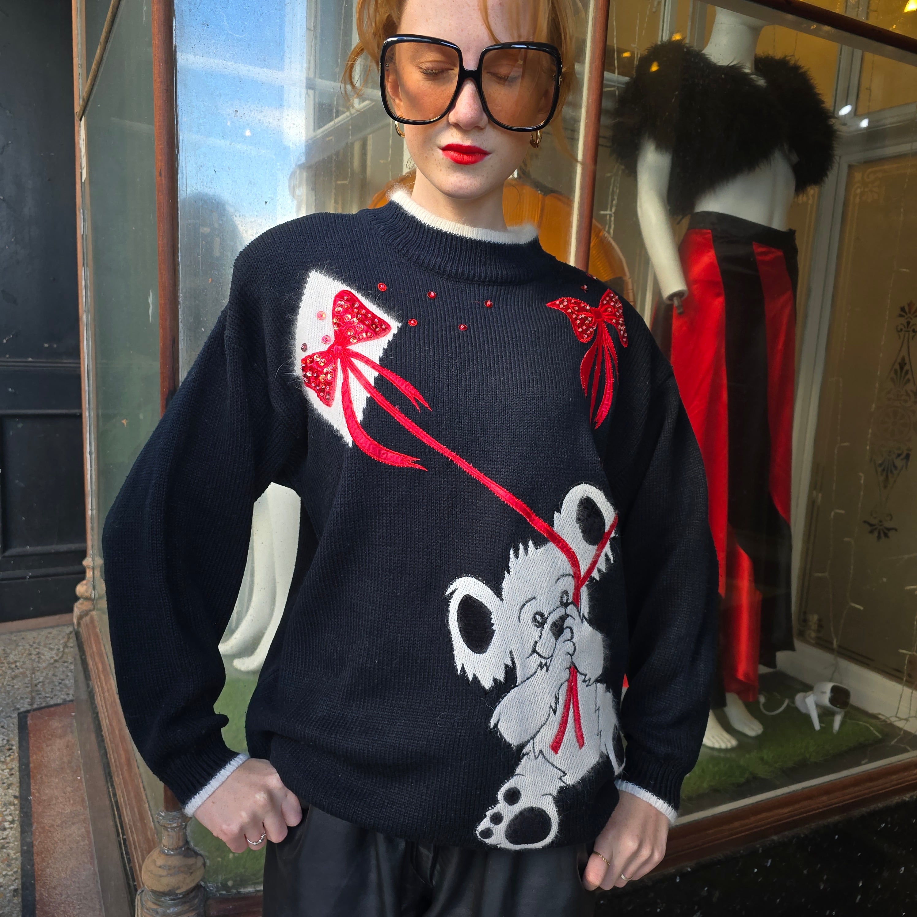 Black Acrylic knit, with the sweetest Teddy Bear on the front who is holding applique bows which have red ribbon strings ,sequins and beads. Theres also a fluffy and soft white Angora square, and the Angora is repeated on the neck, cuffs and hem