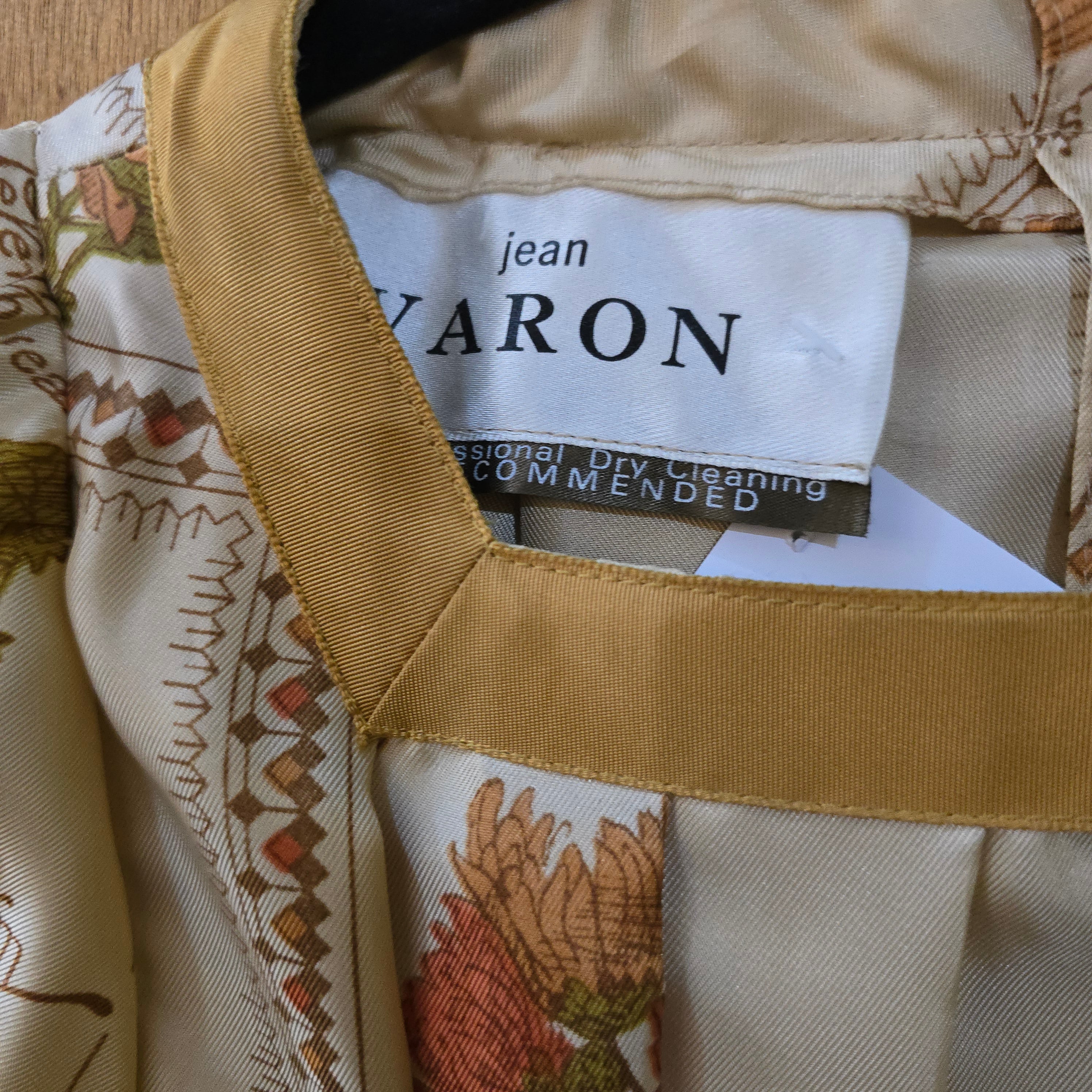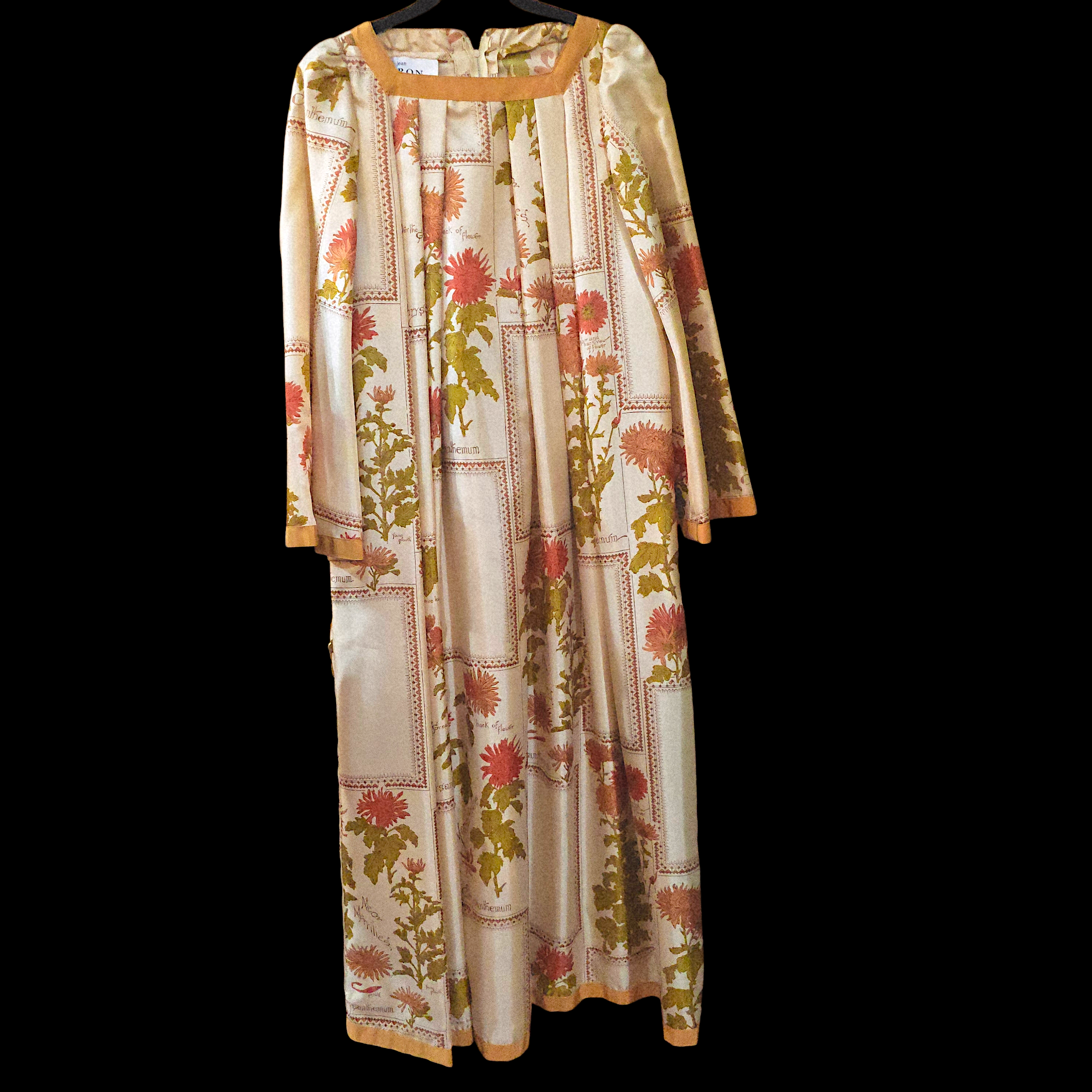I could imagine Elizabeth Taylor wafting about in this beauty back in the day!Gorgeous Botanical print of handrawn chrysanthemums on a light beige/cream Tricel fabric that hangs beautifully to the floor, and has long bell sleeves that complement the voluminous cut of the dress and ...it has pockets!
