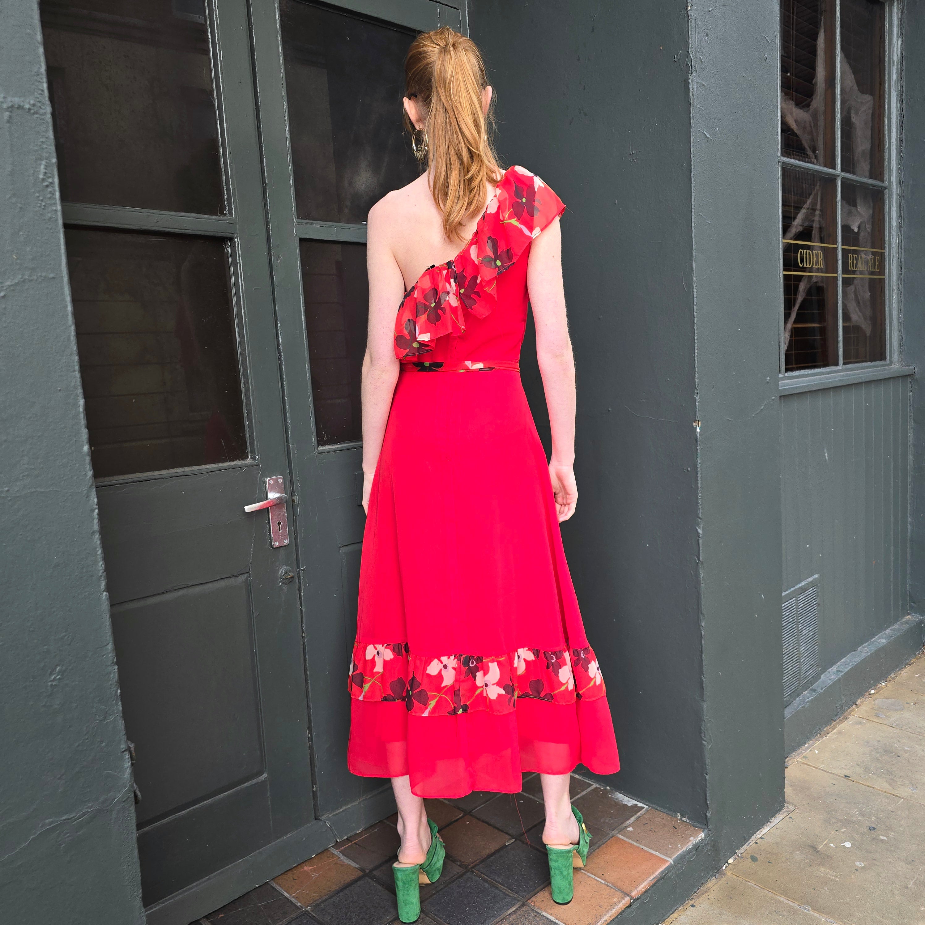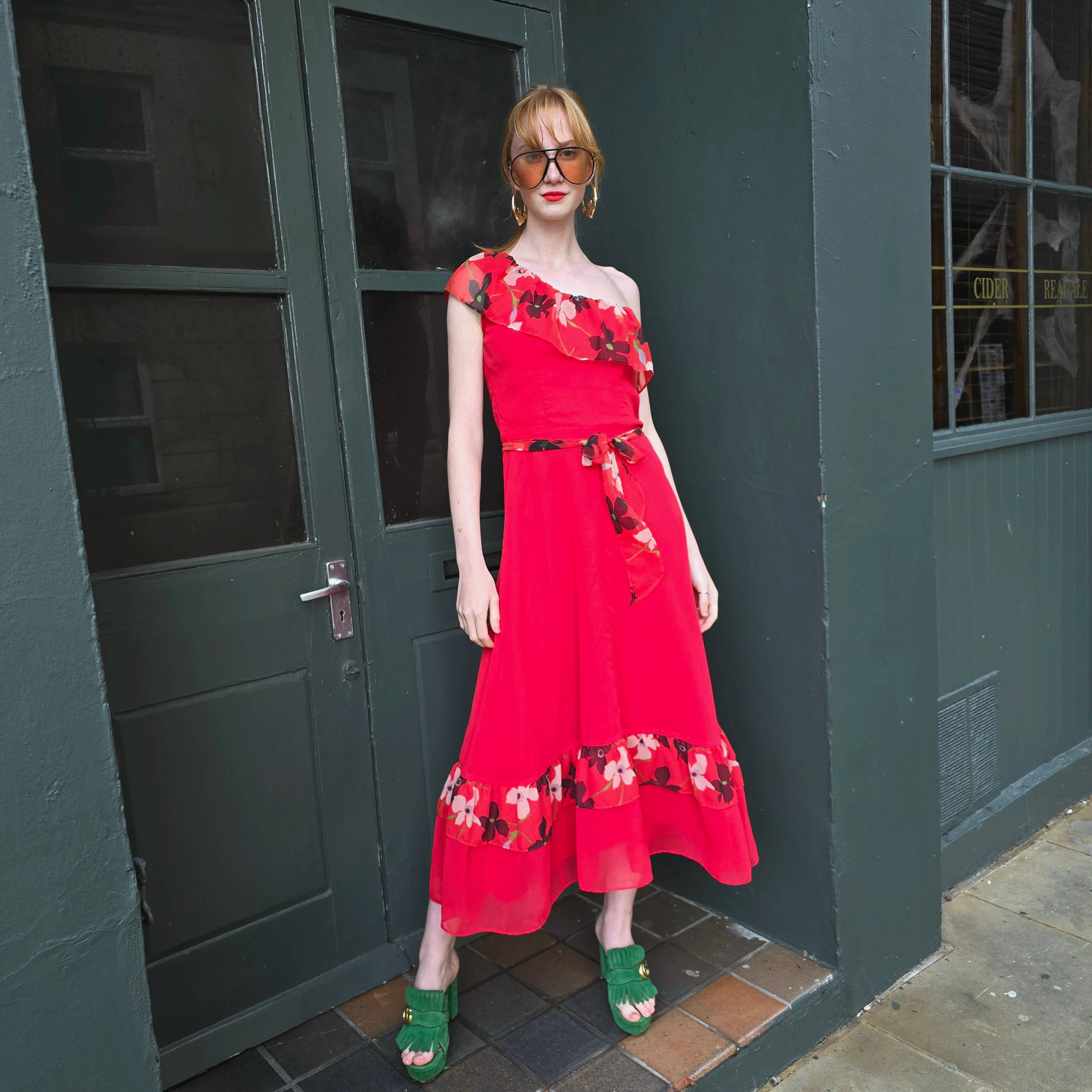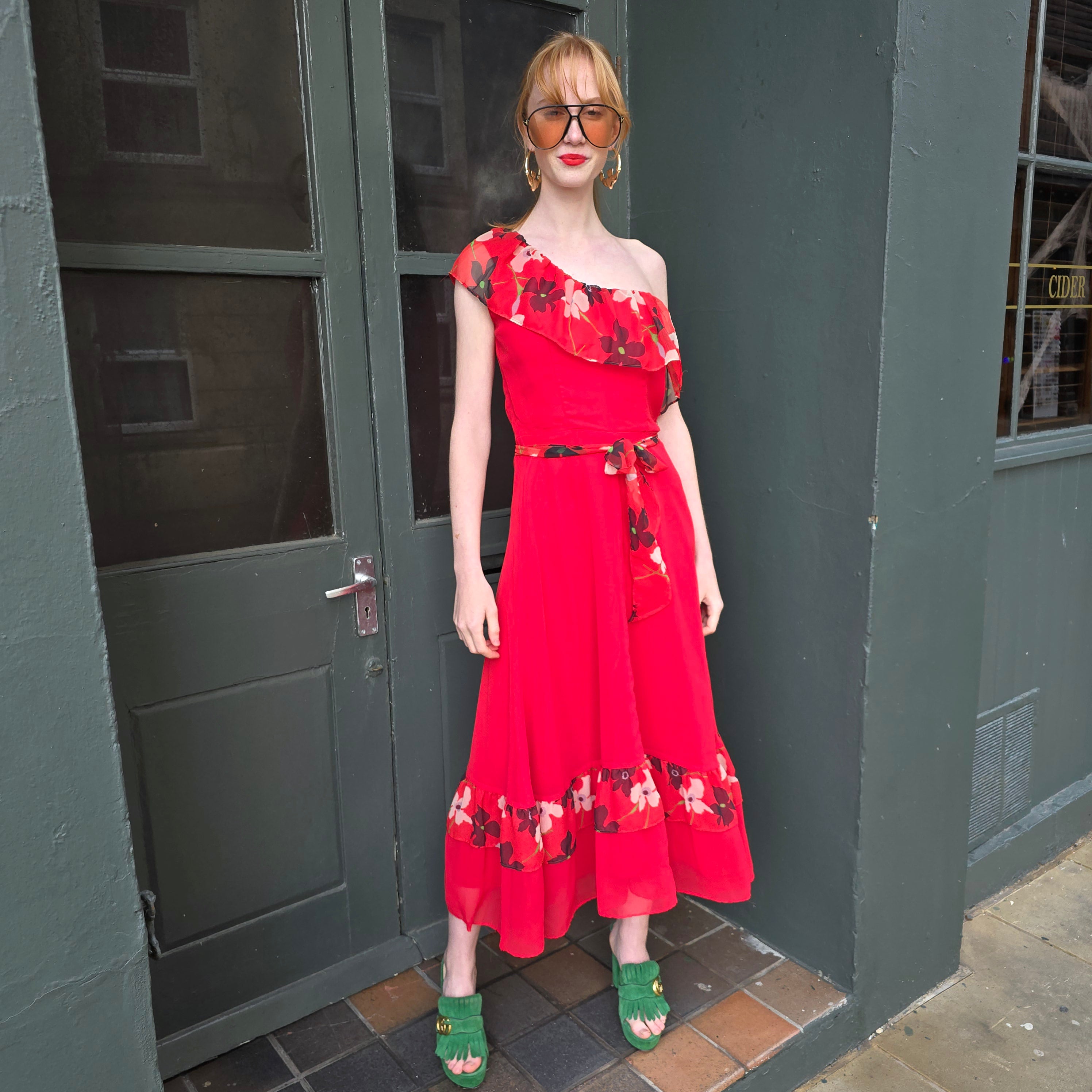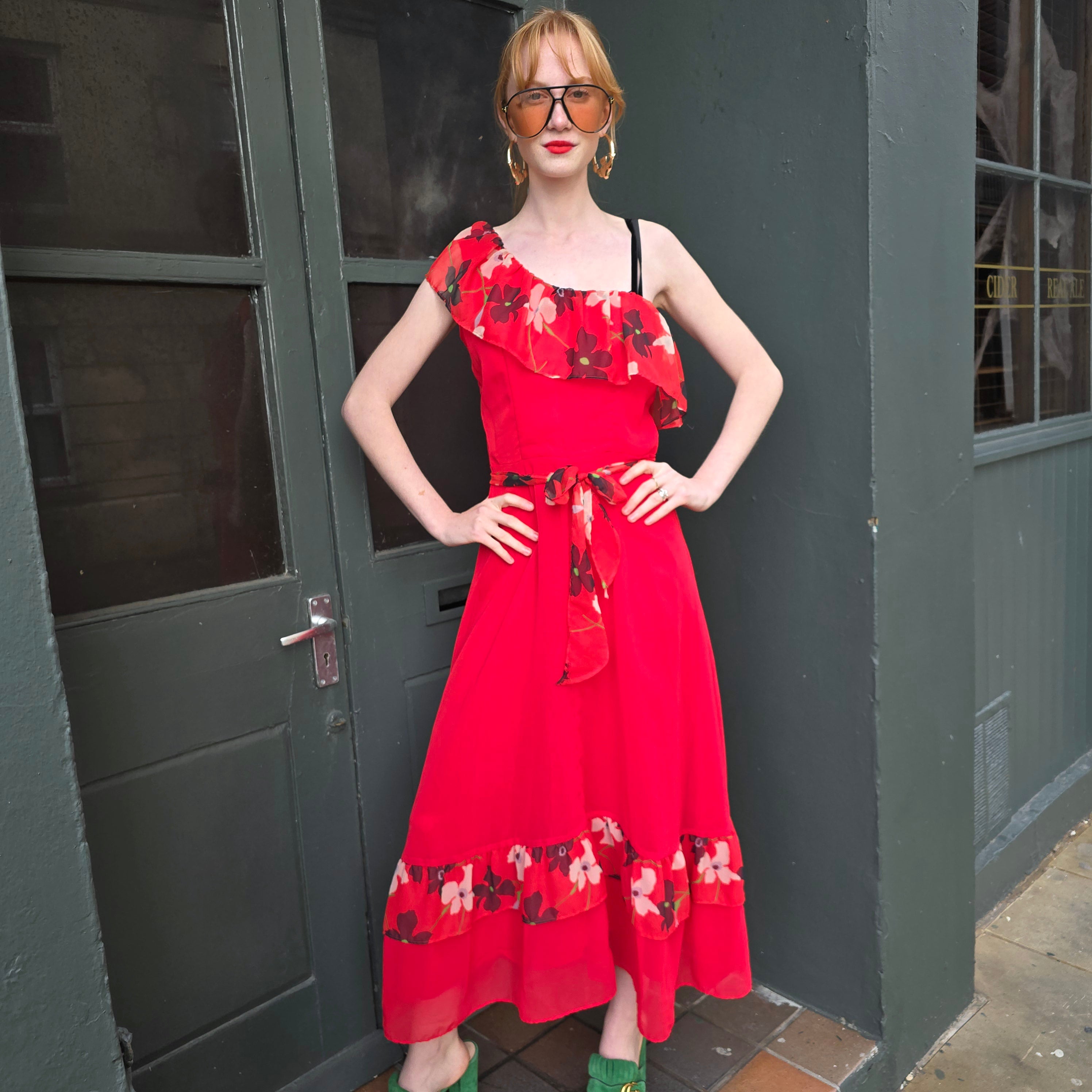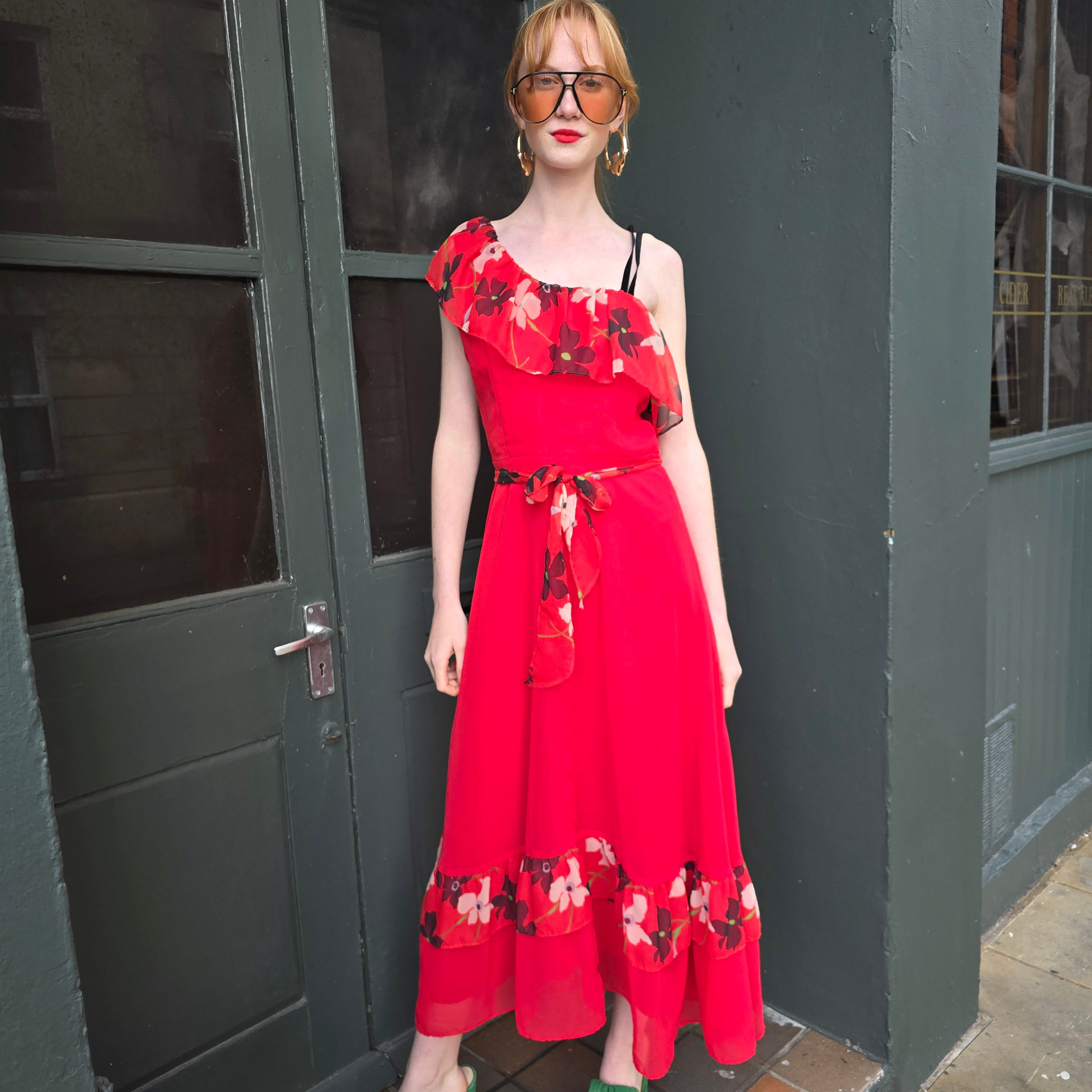 Beautiful red floaty floral disco dress dating from the 1970s by Benny Ong at Mushroom - S