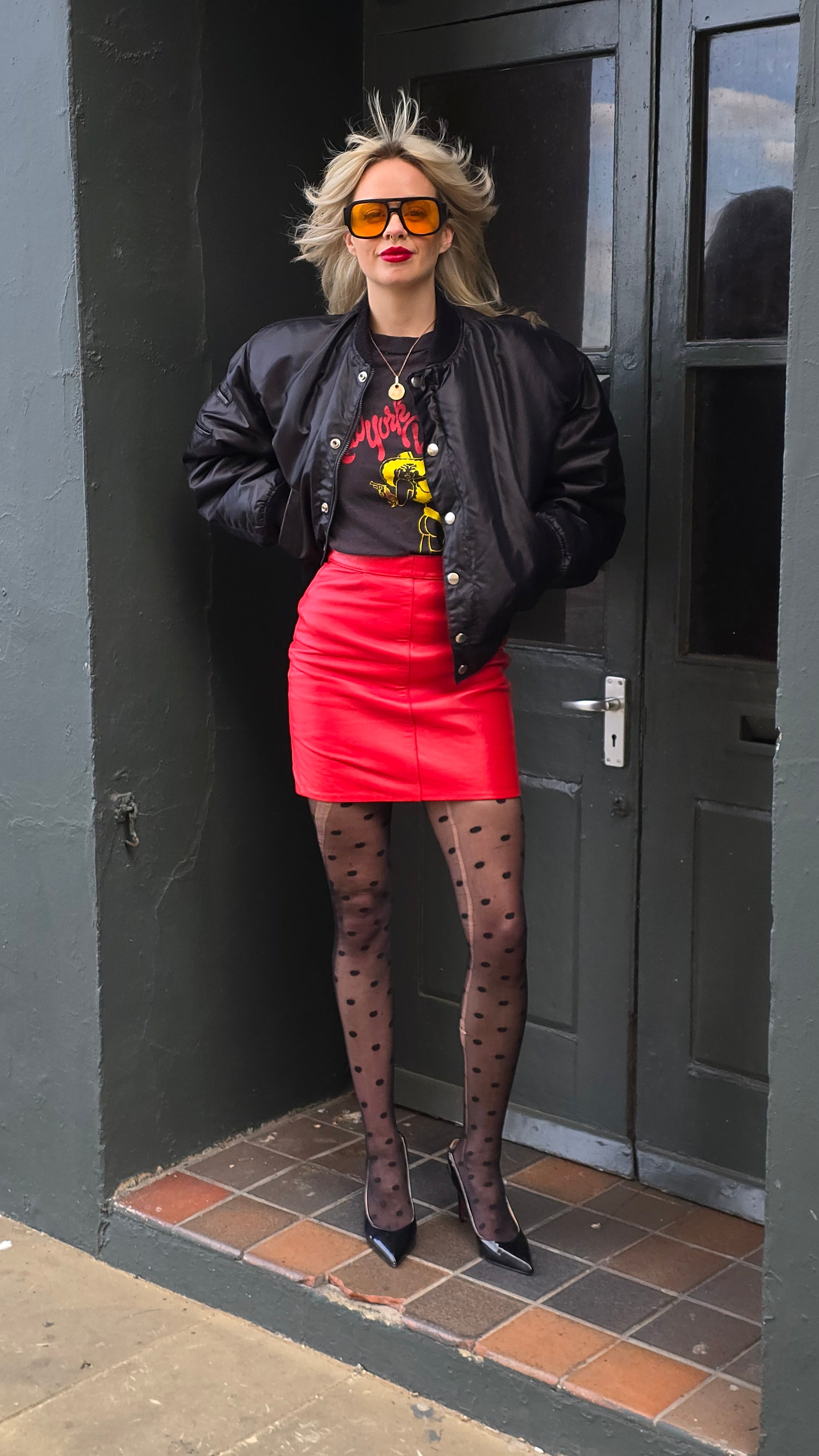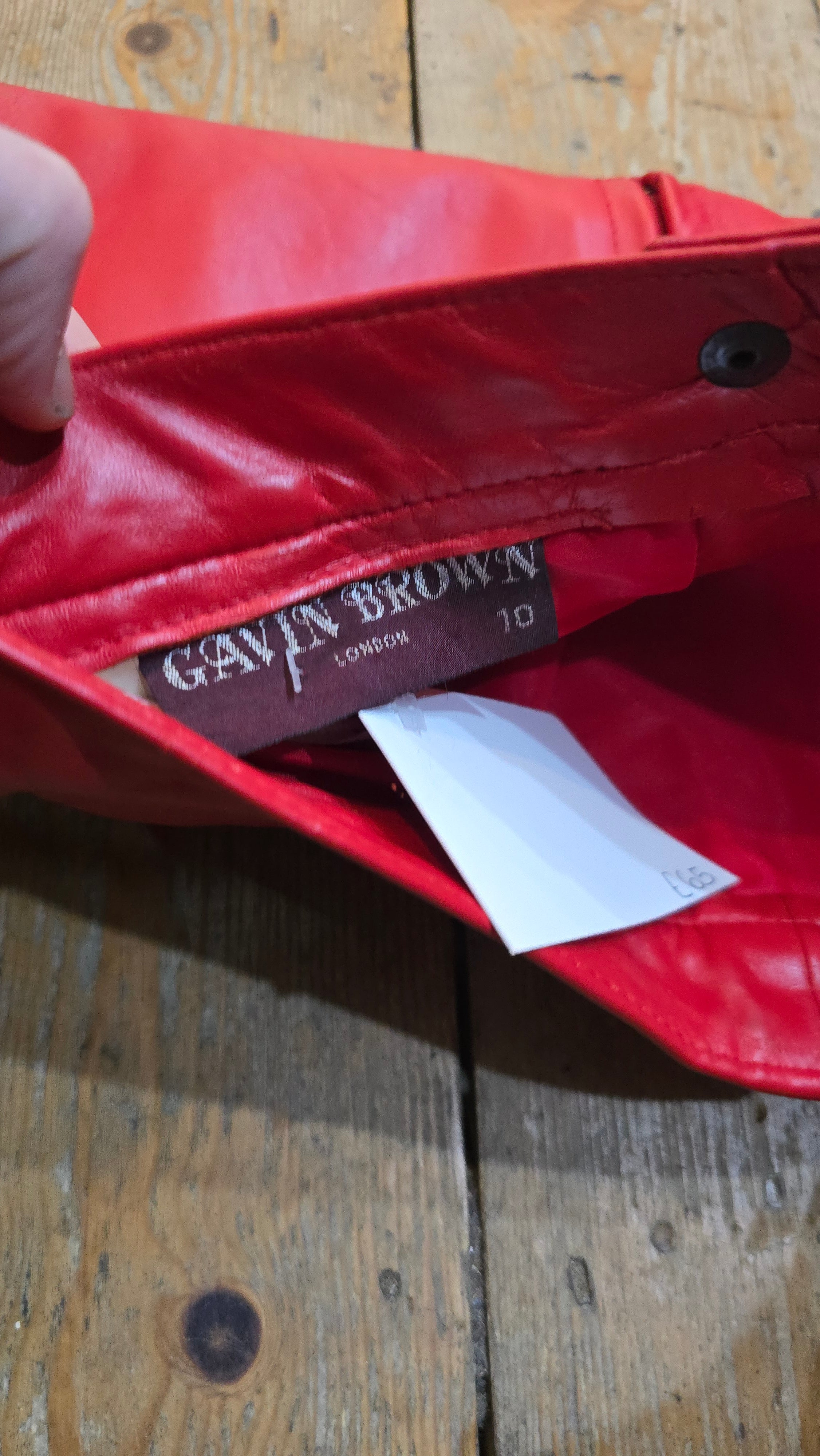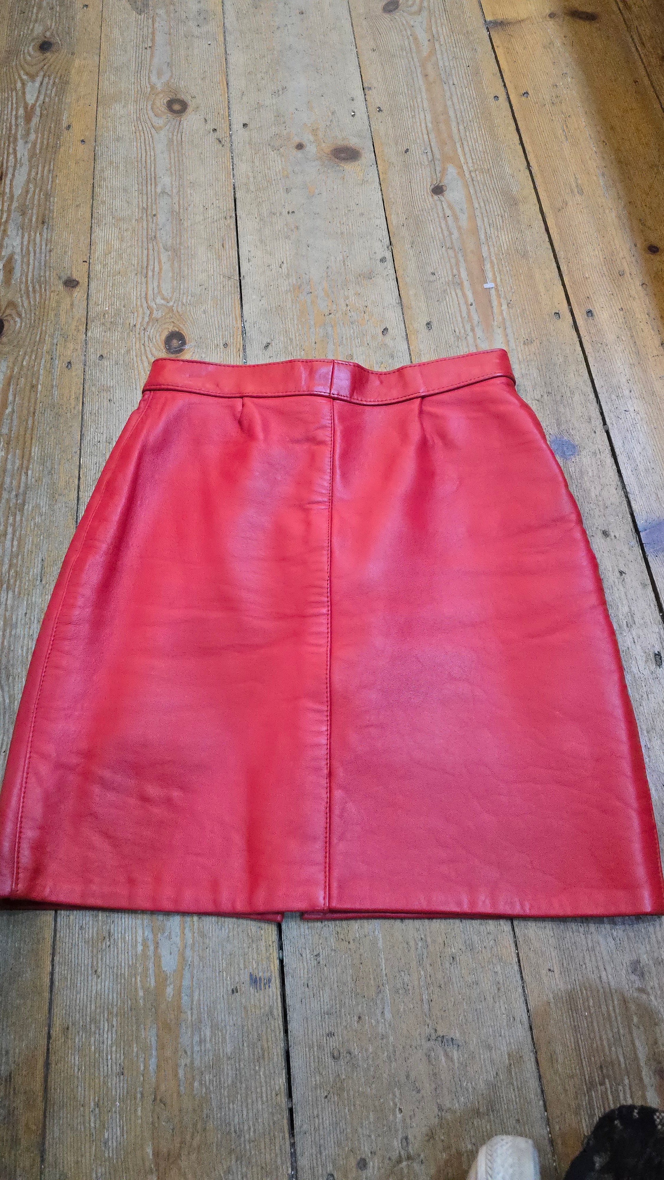 Dating from the 1980s, this  sexy body con red leather mini skirt will add a touch of sass to any outfit!