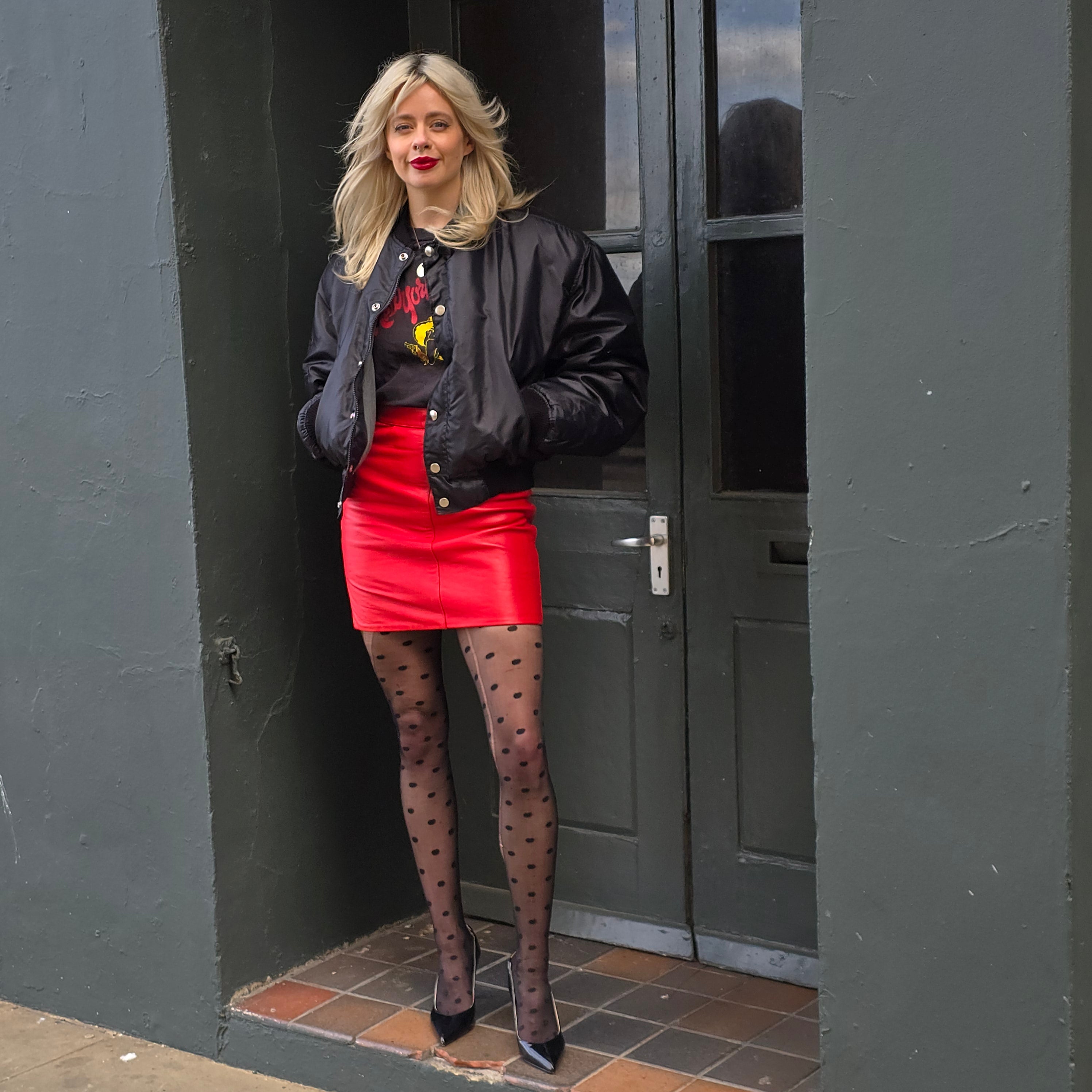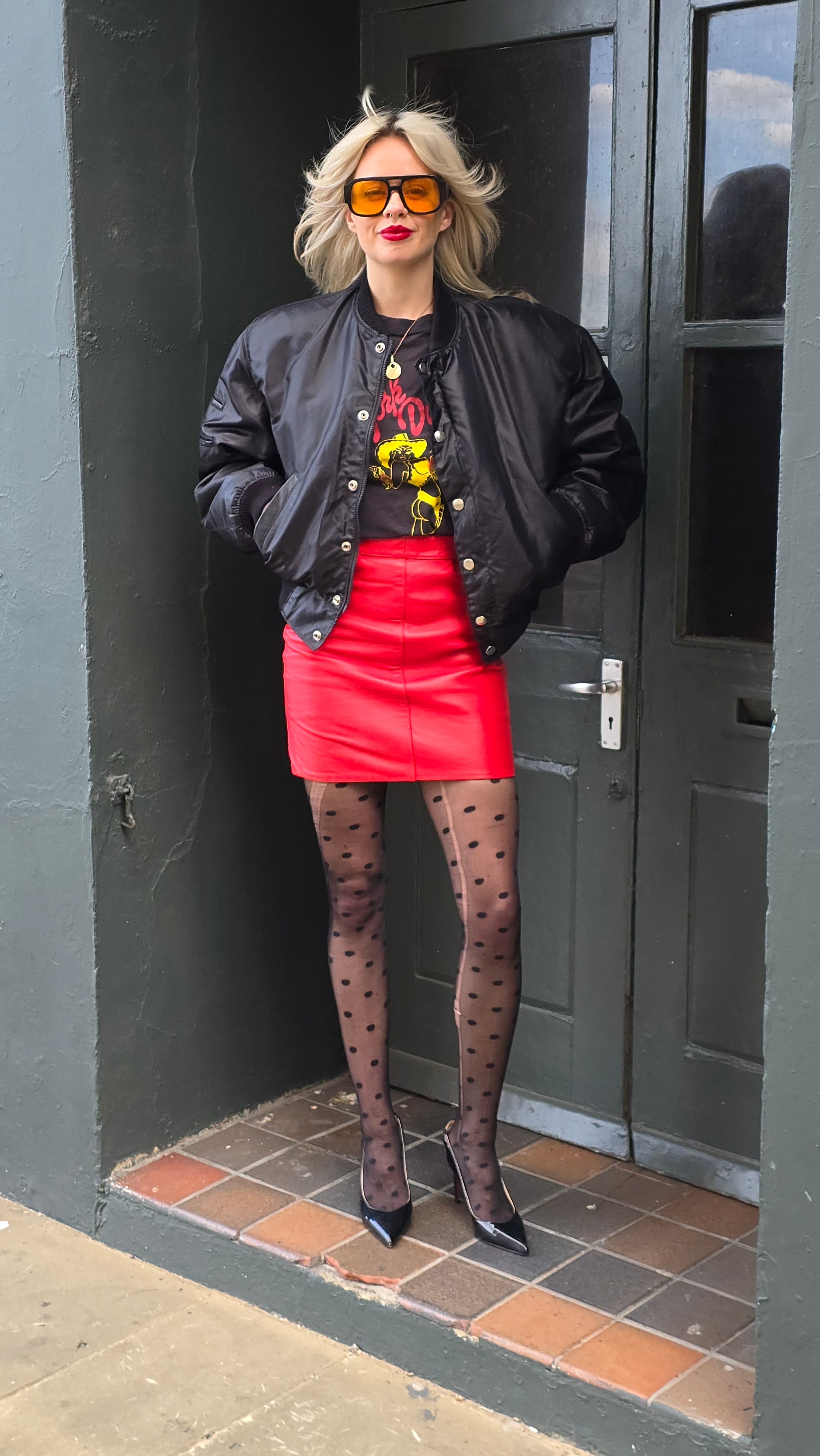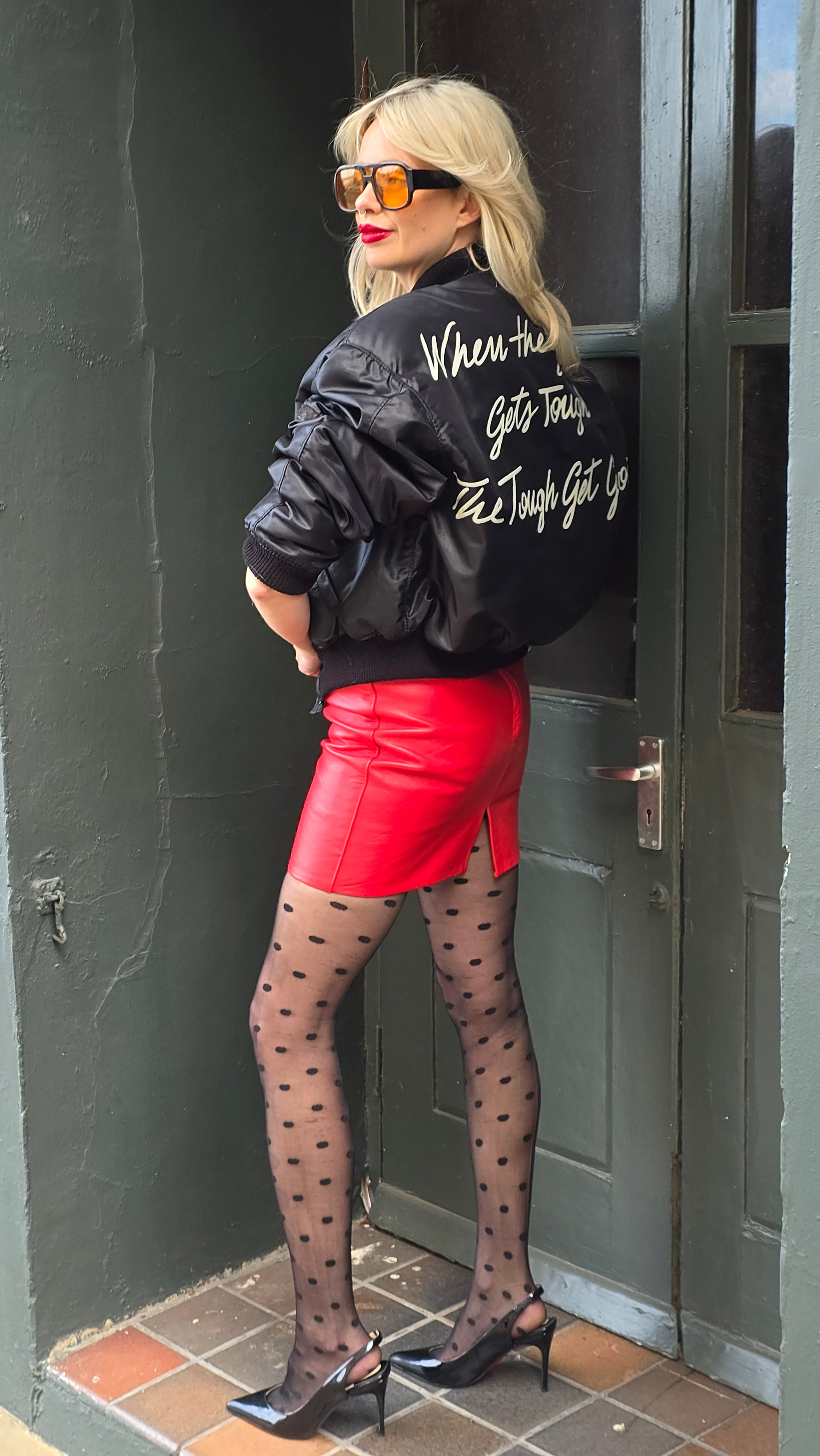 Dating from the 1980s, this  sexy body con red leather mini skirt will add a touch of sass to any outfit!