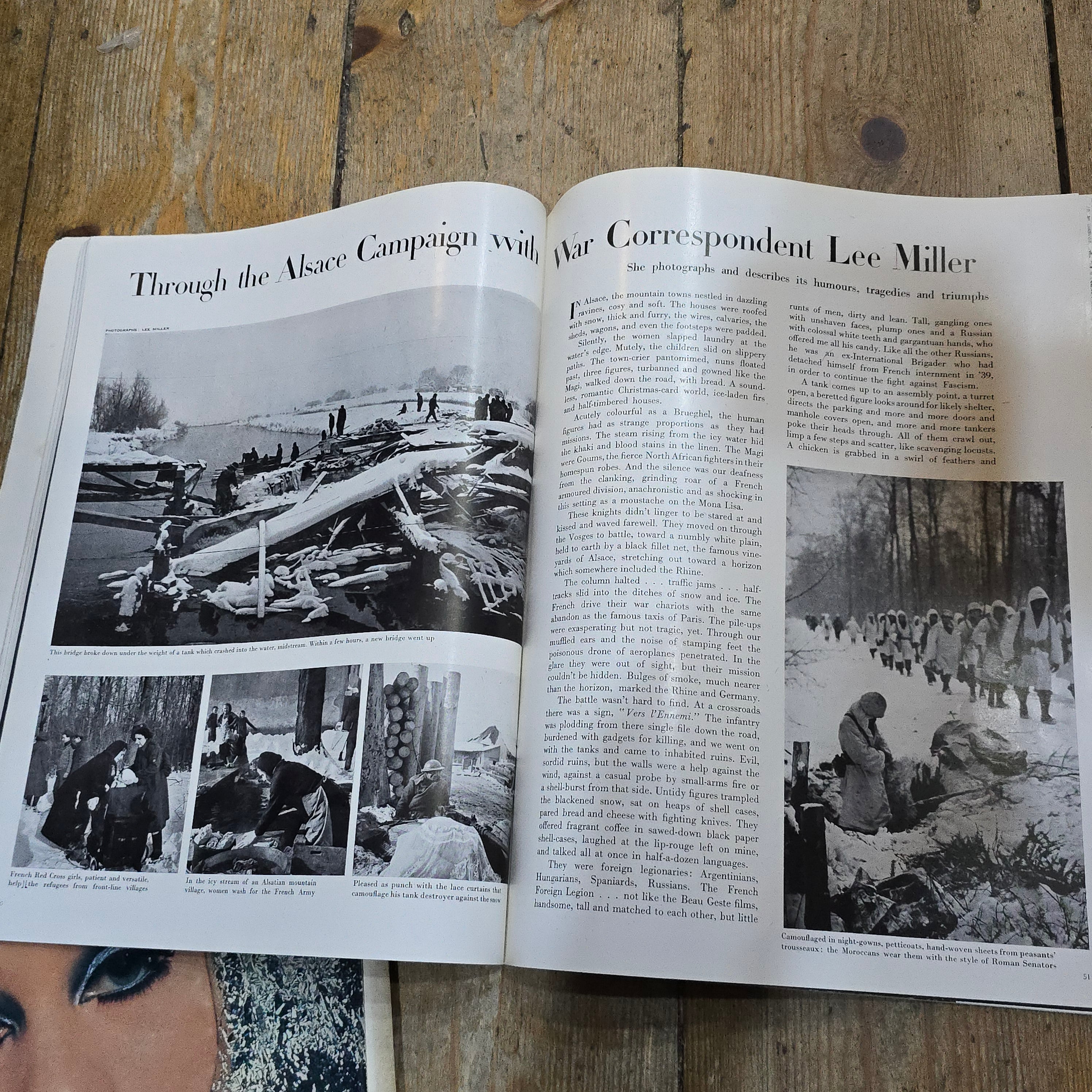 Notable Content: The issue features photography and articles by the renowned war correspondent Lee Miller, including images from the Alsace Campaign war front and a piece on G.I. lingo in Europe. It also includes fashion features and an illustrated section on China by Cecil Beaton.