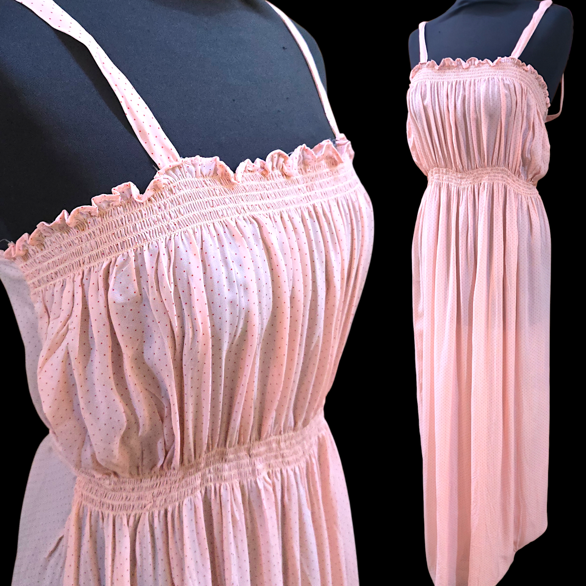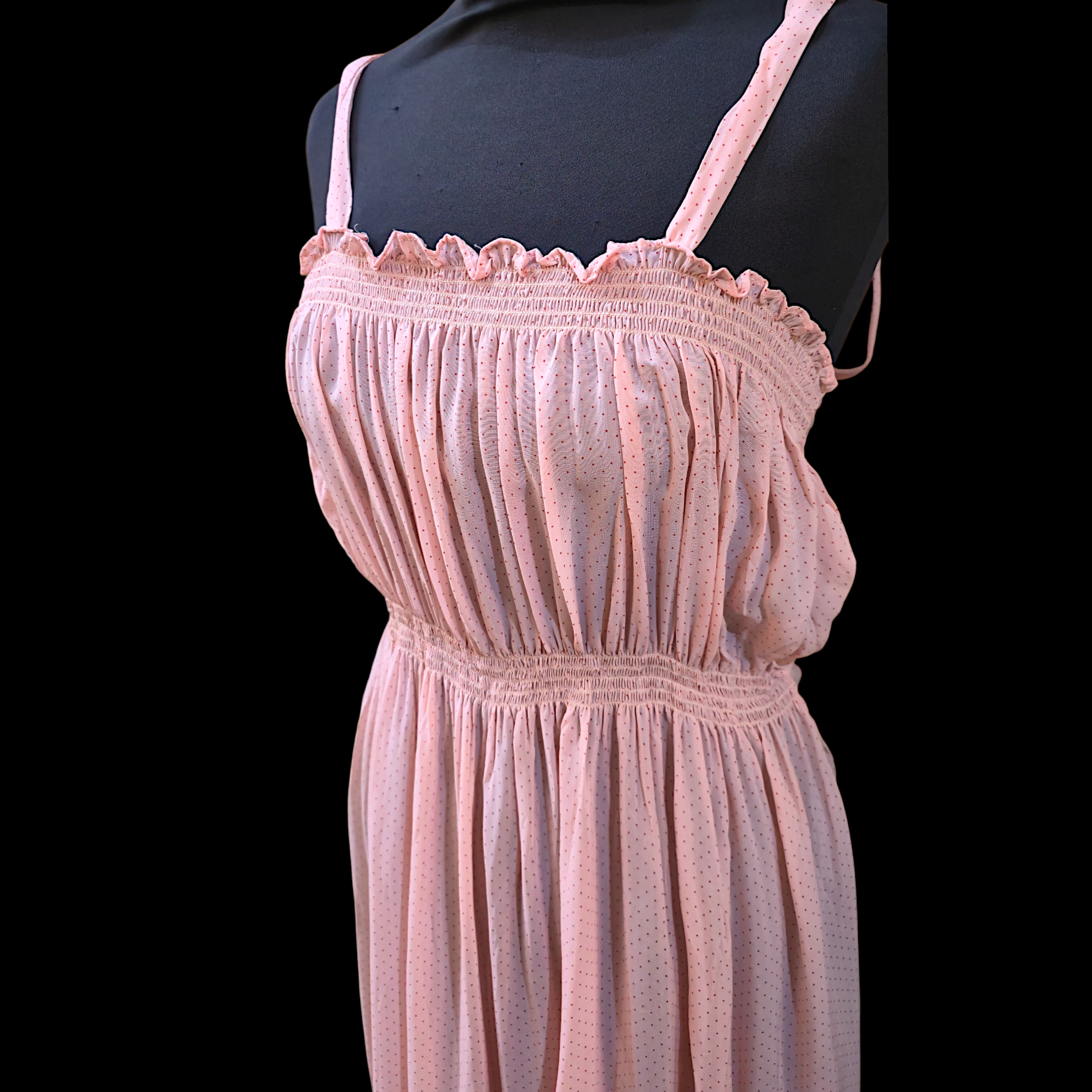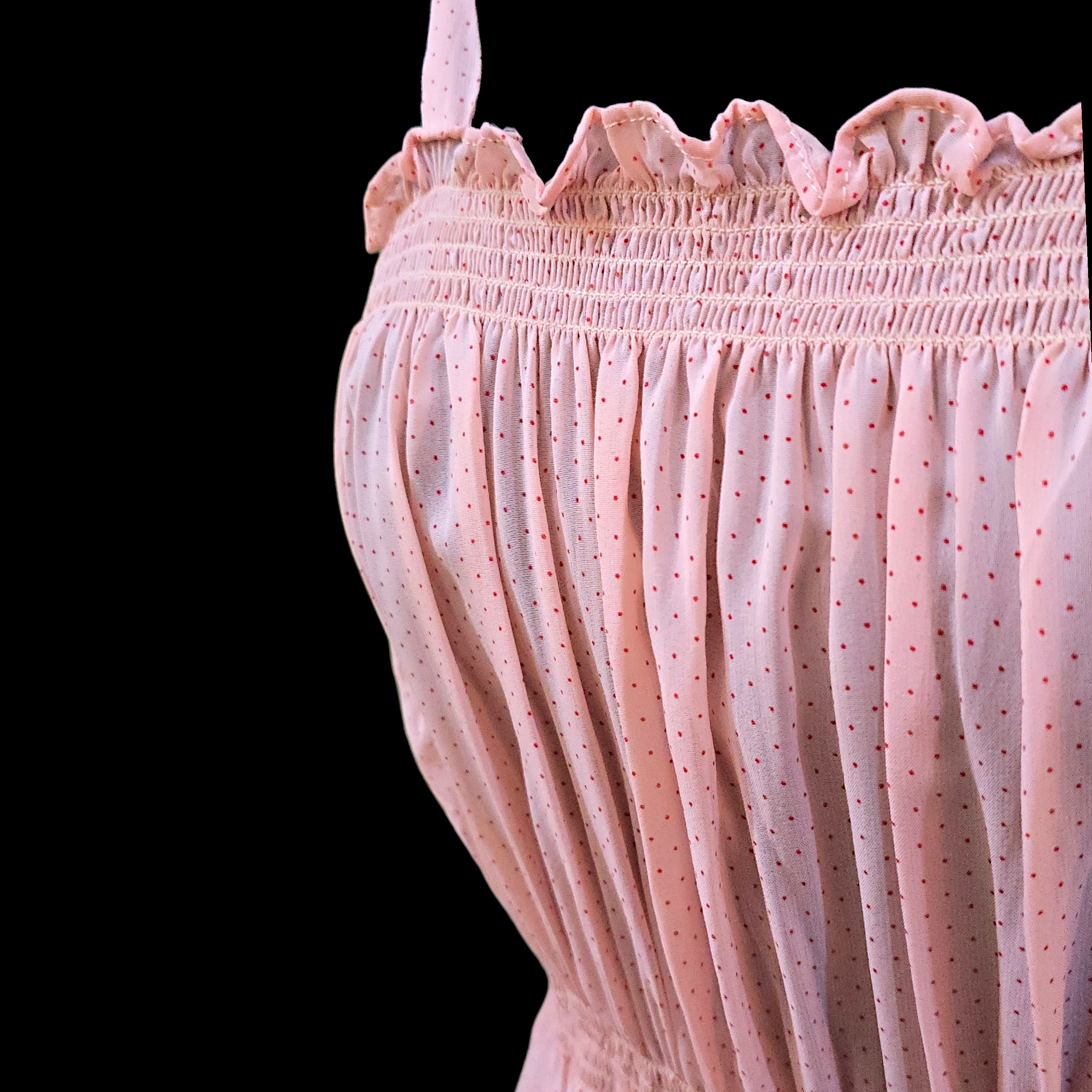 In a pretty salmon pink Rayon with a tiny red micro dot print.
