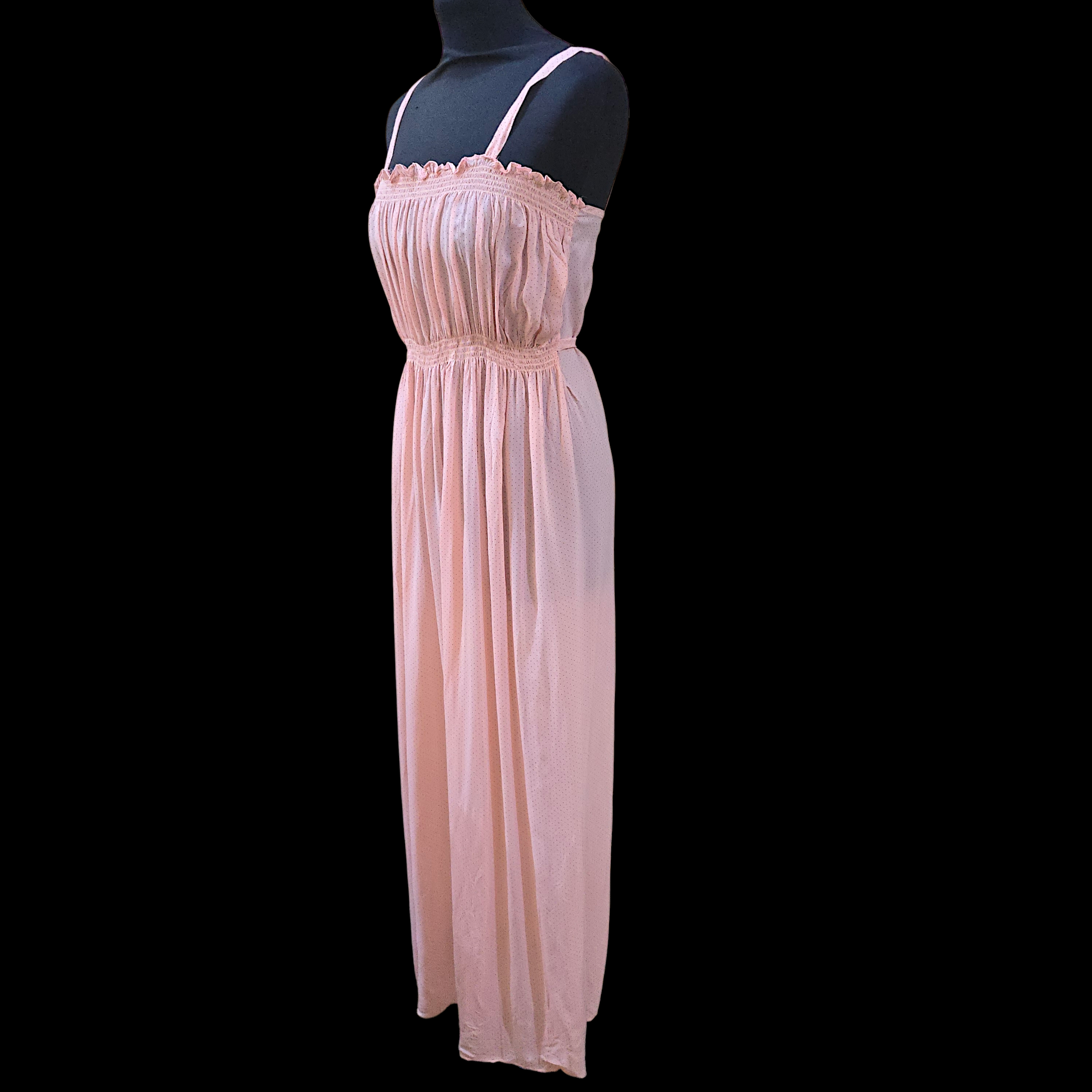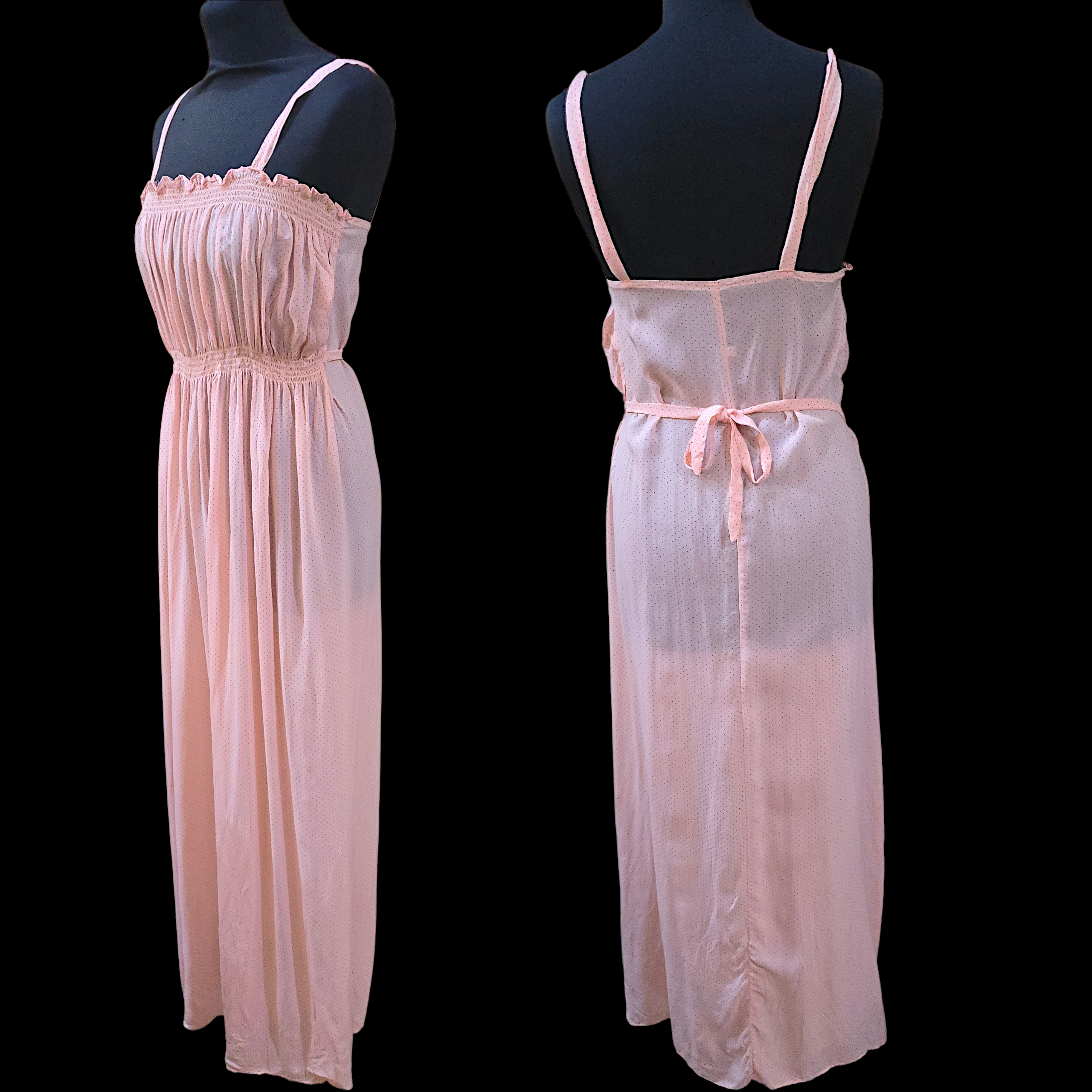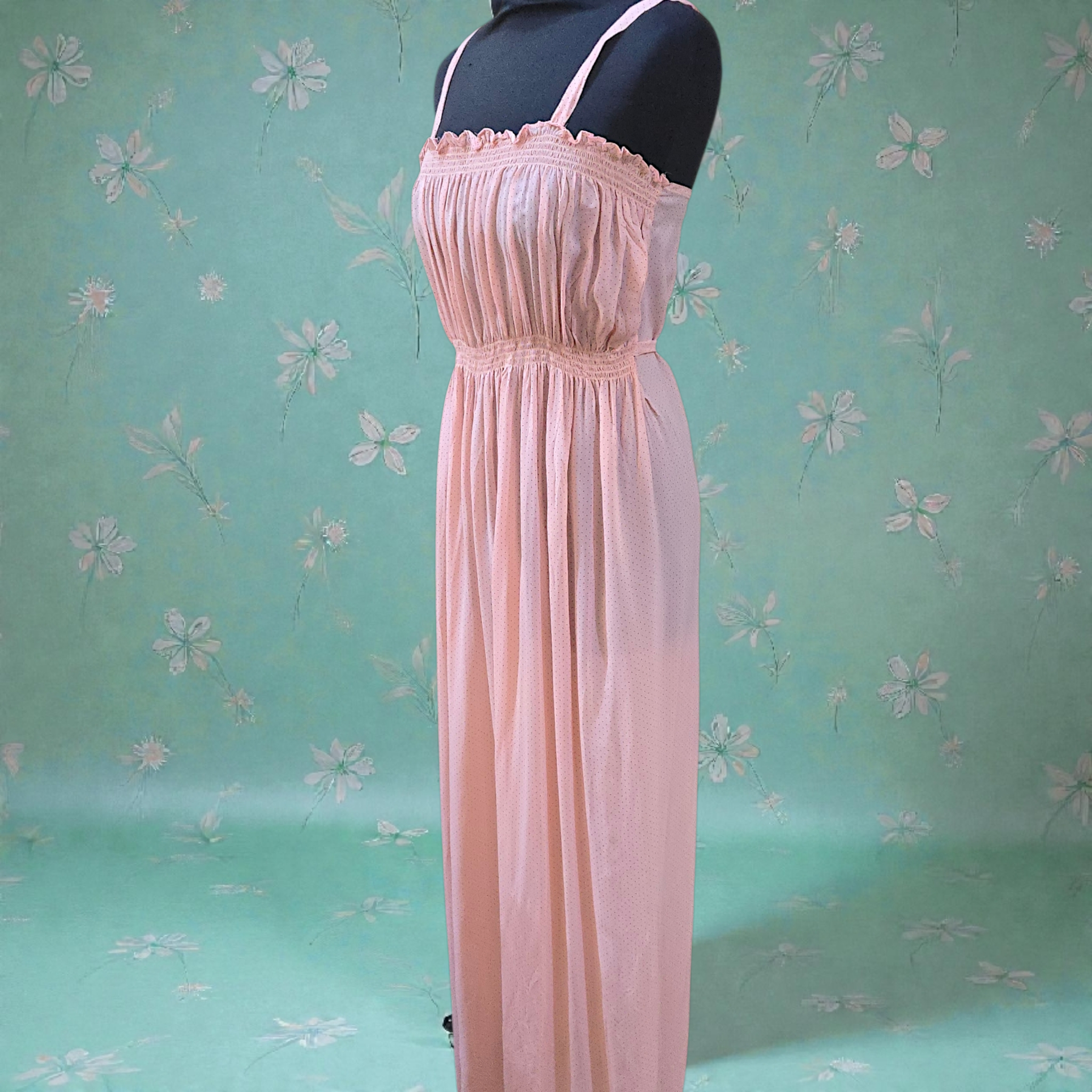In a pretty salmon pink Rayon with a tiny red micro dot print.