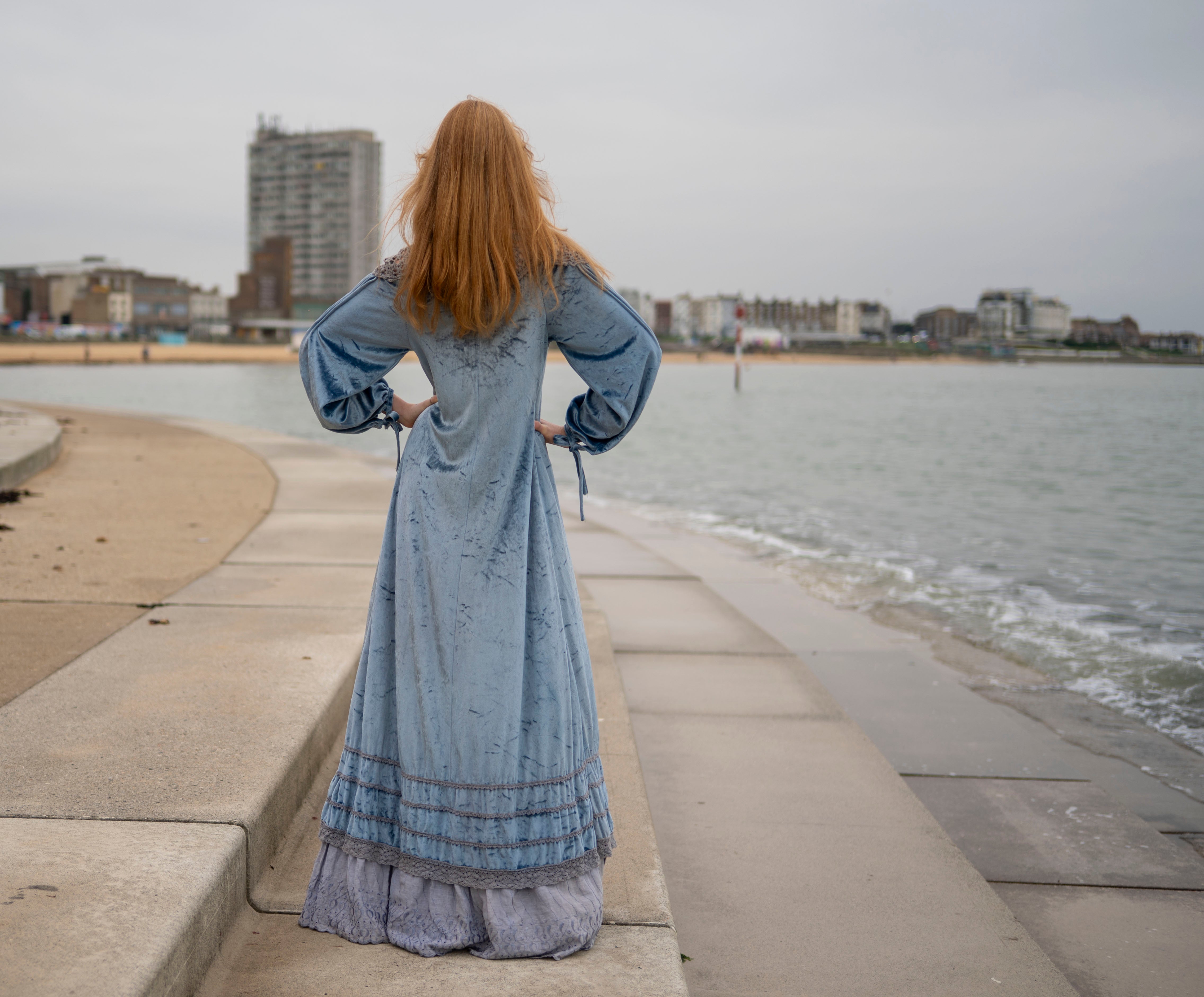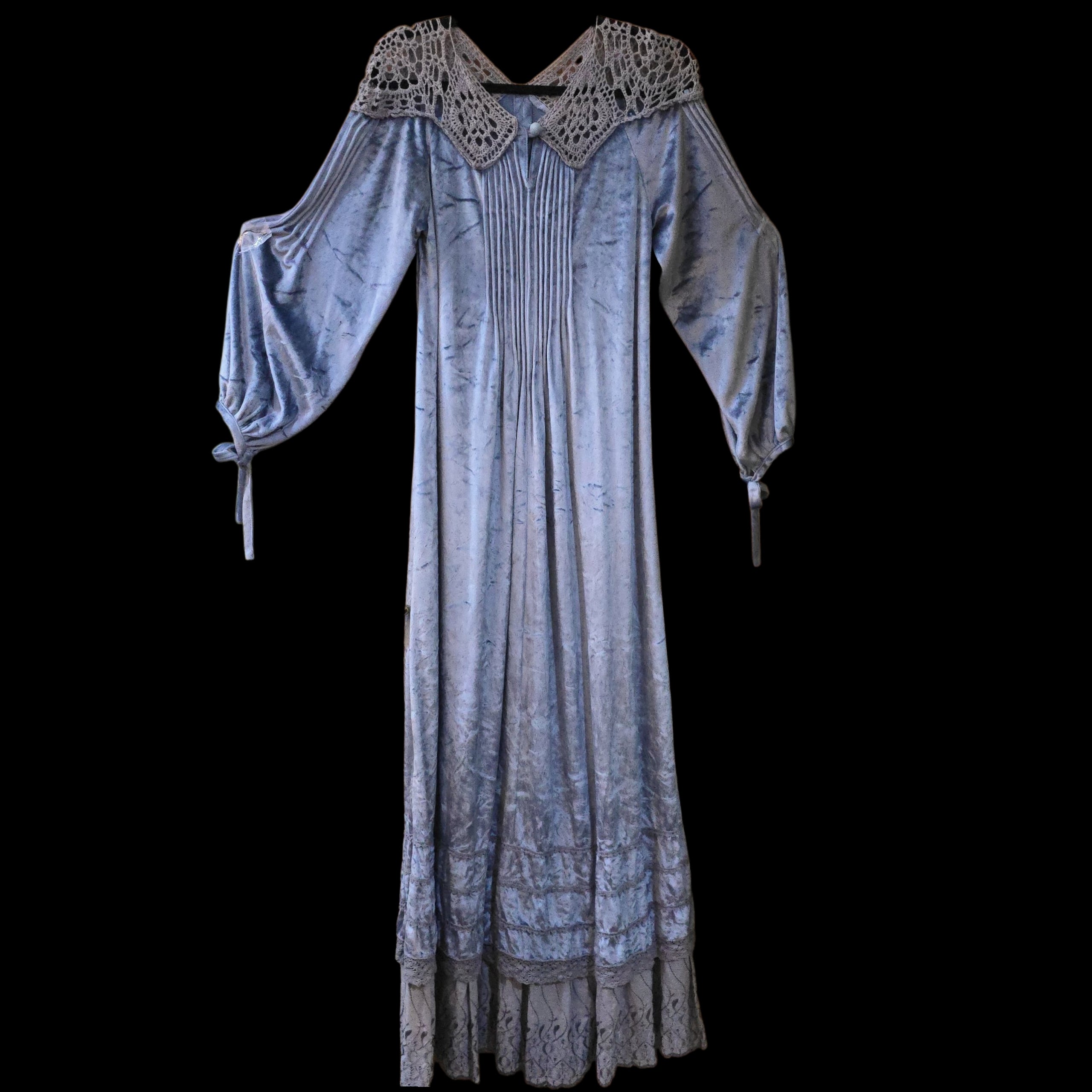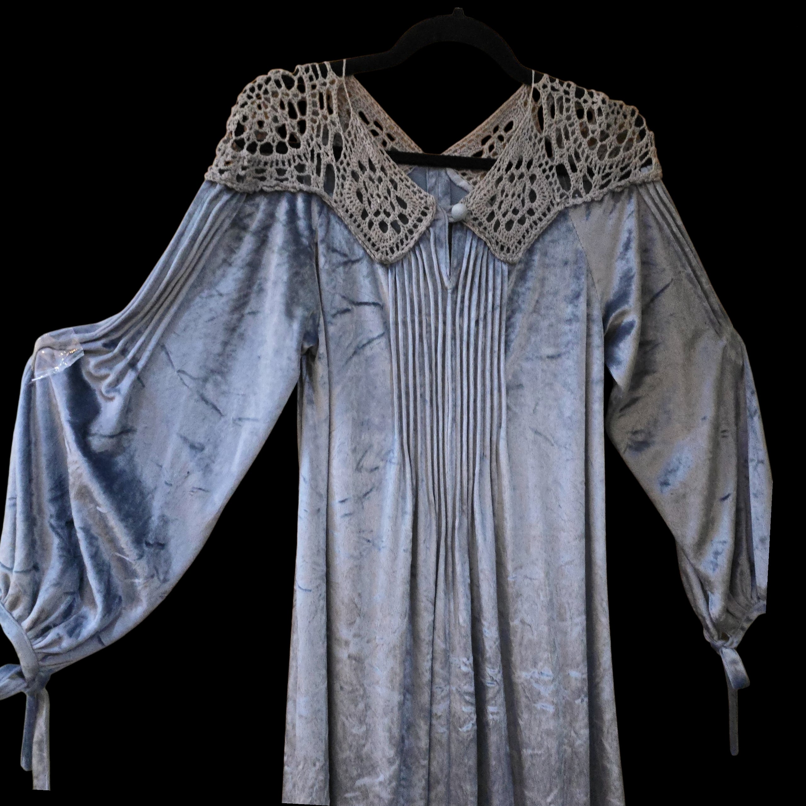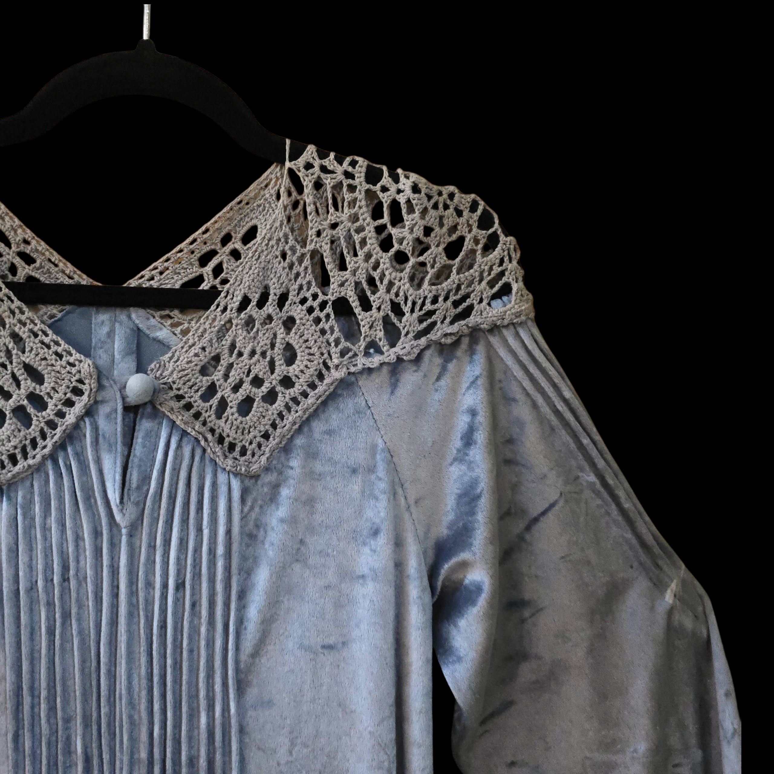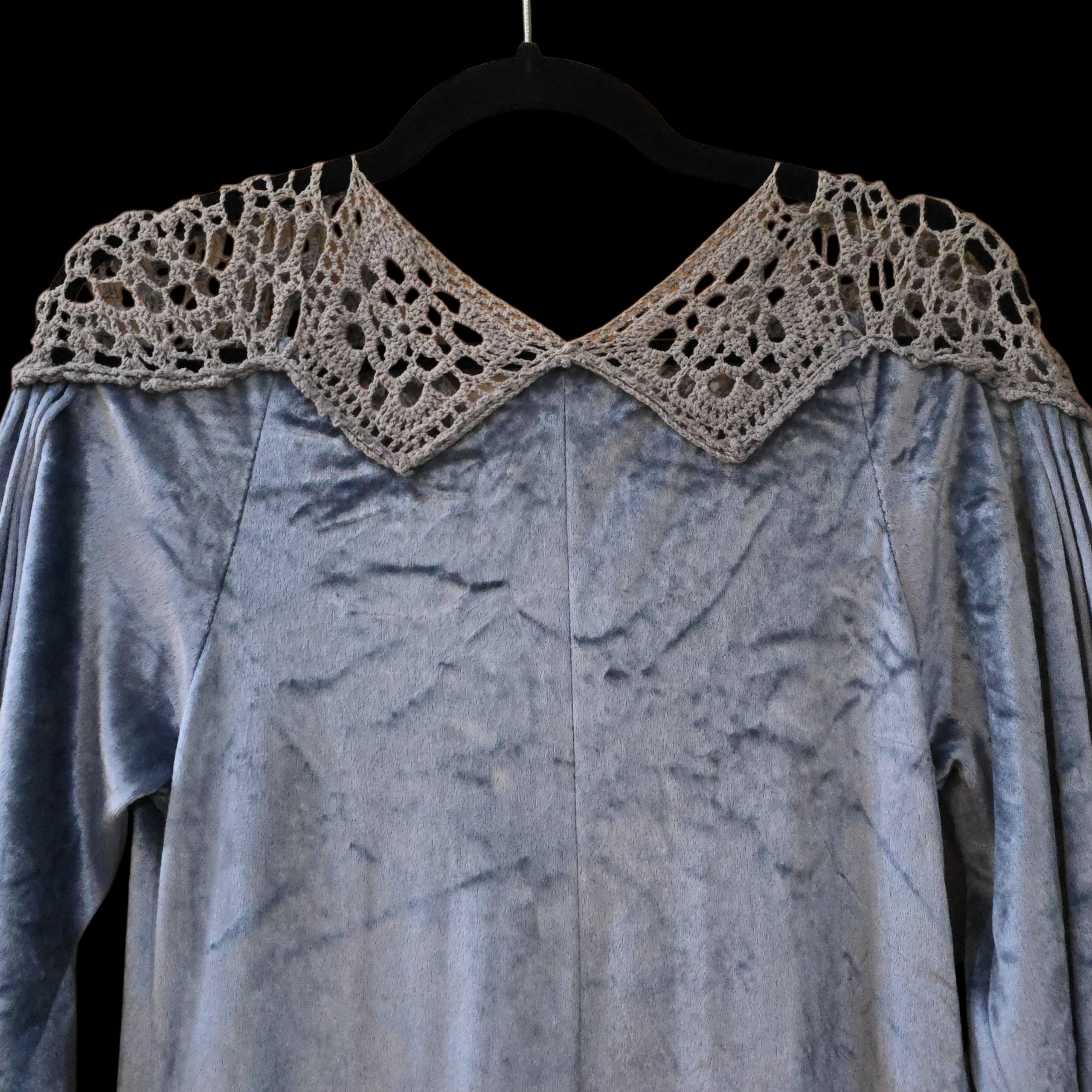 Cut from a soft, dusky ice blue crushed velour with grey -peekaboo- crochet detail on the neck and shoulders