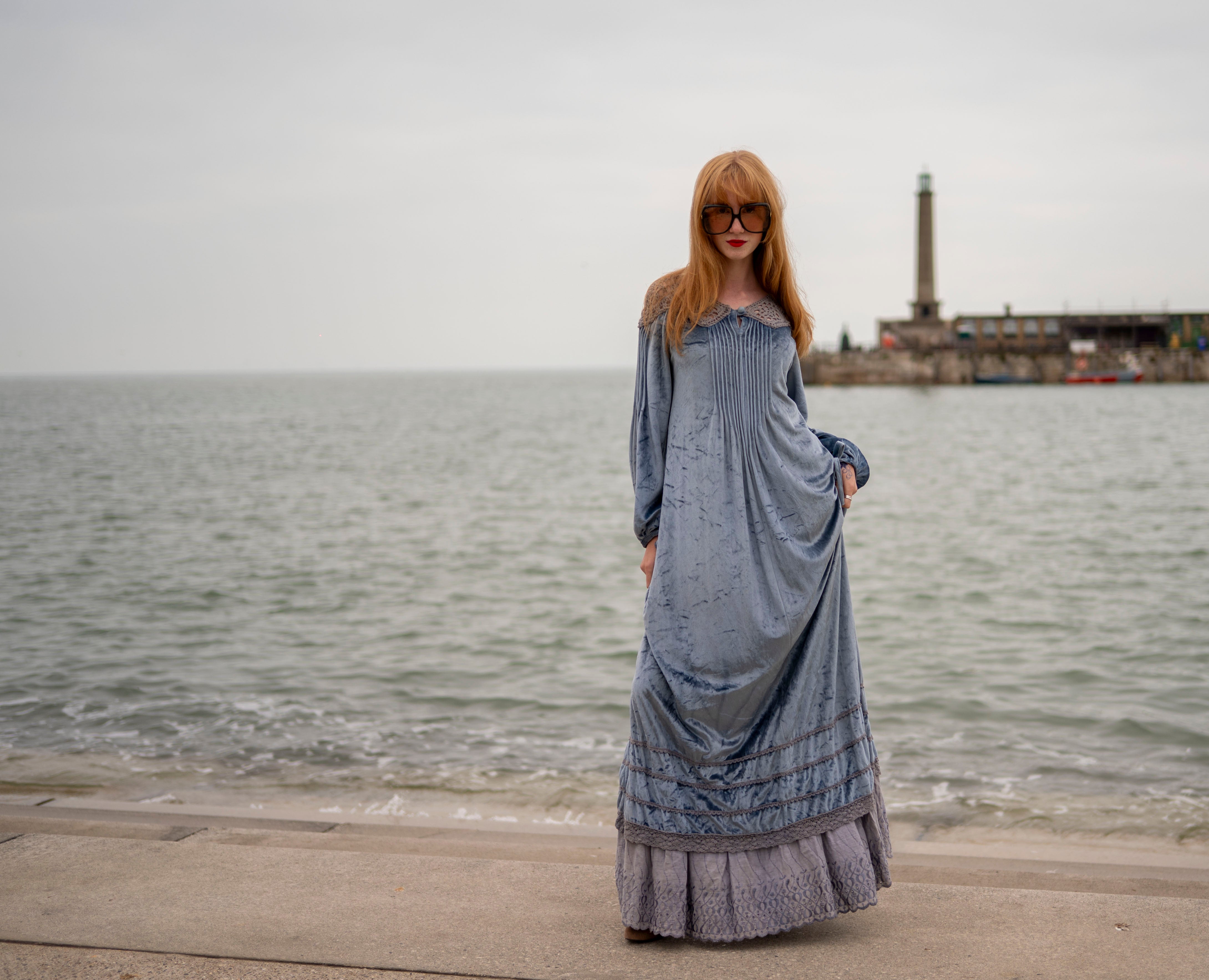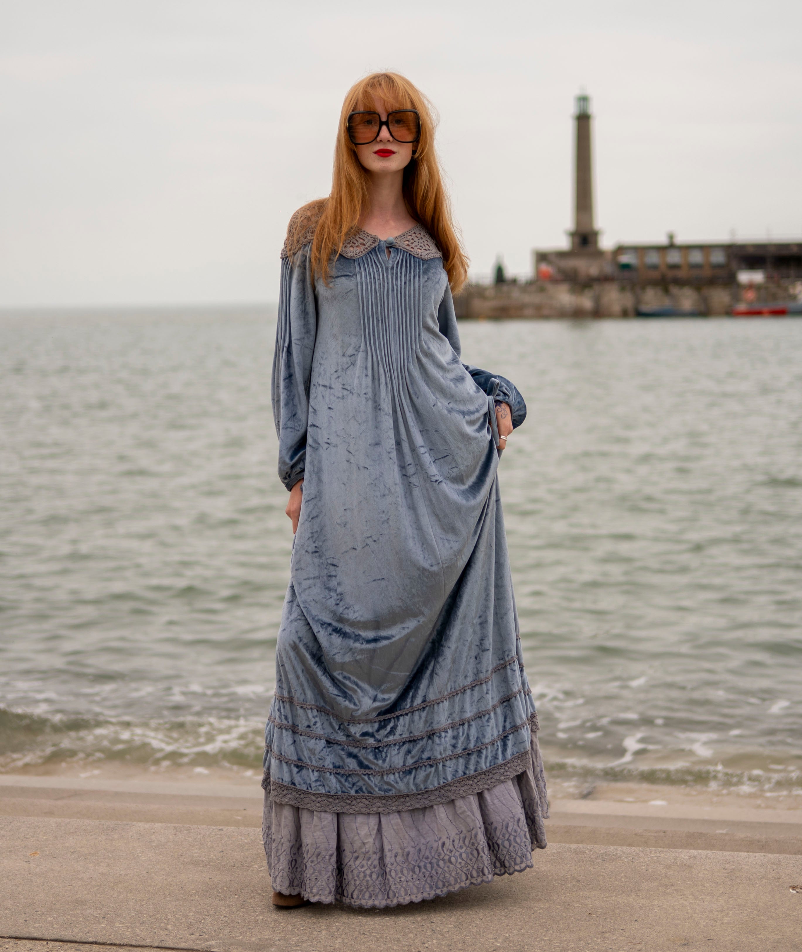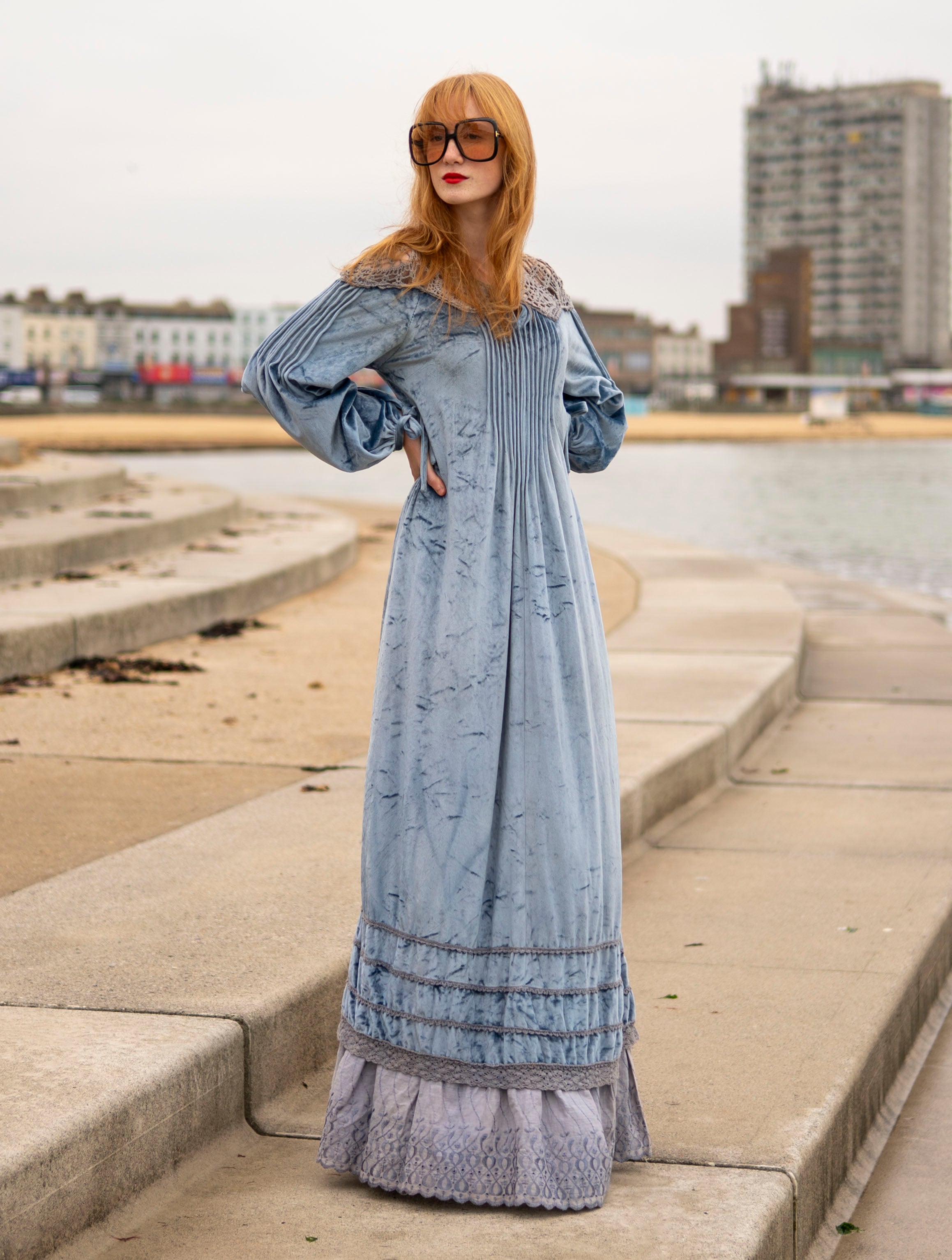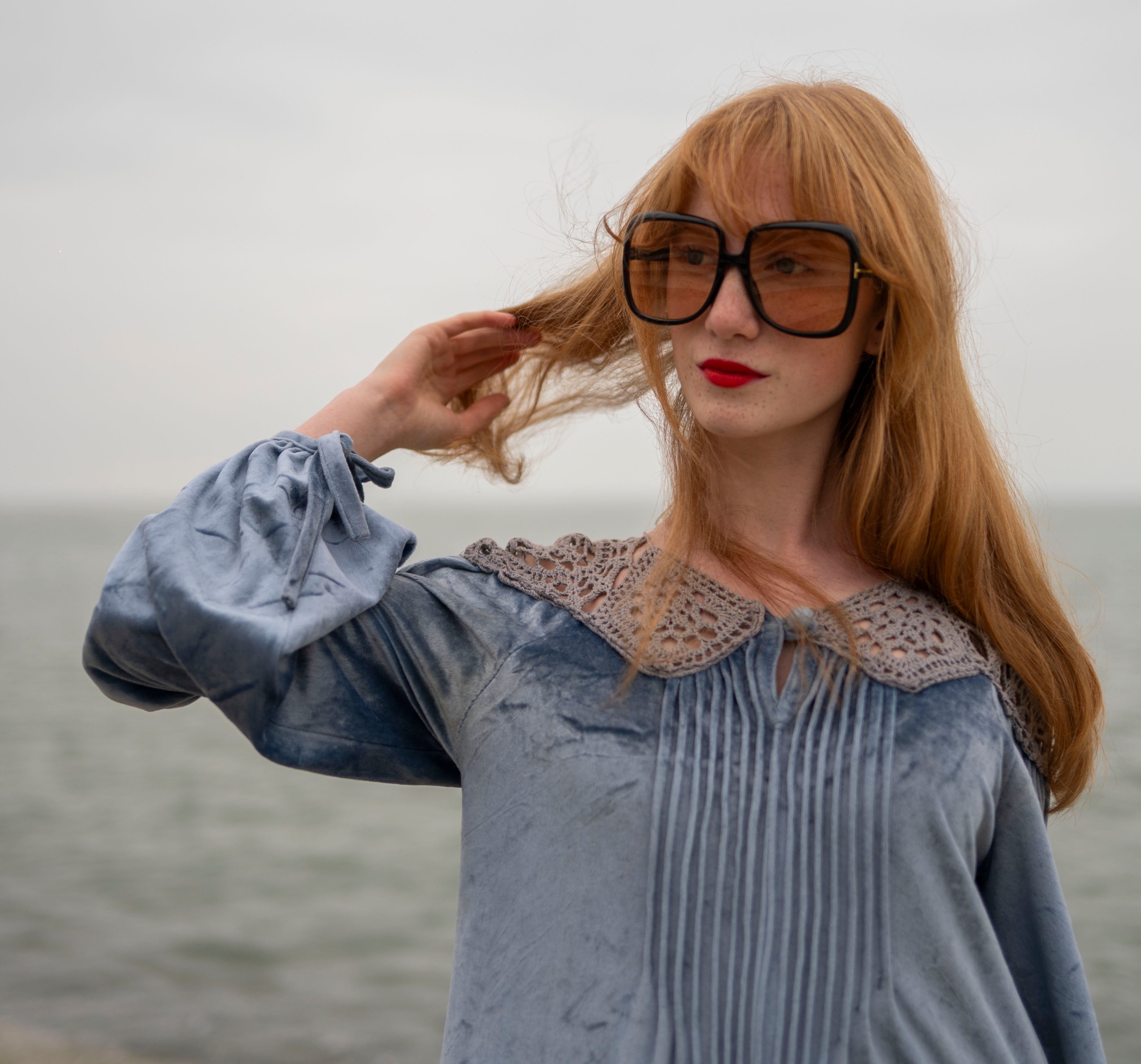 Cut from a soft, dusky ice blue crushed velour with grey -peekaboo- crochet detail on the neck and shoulders
