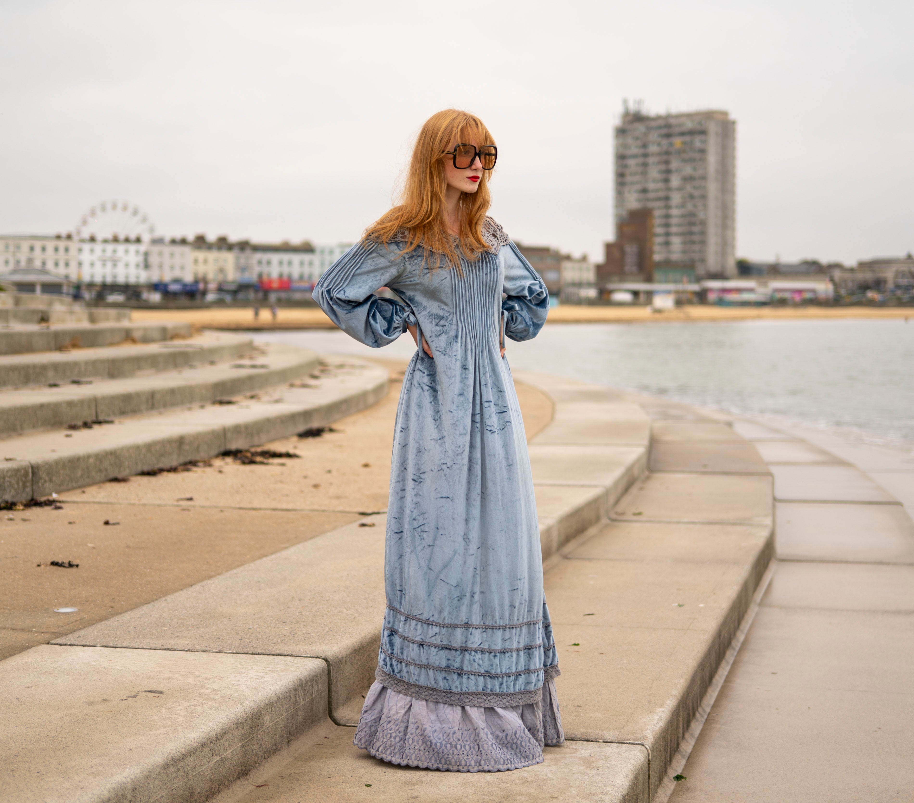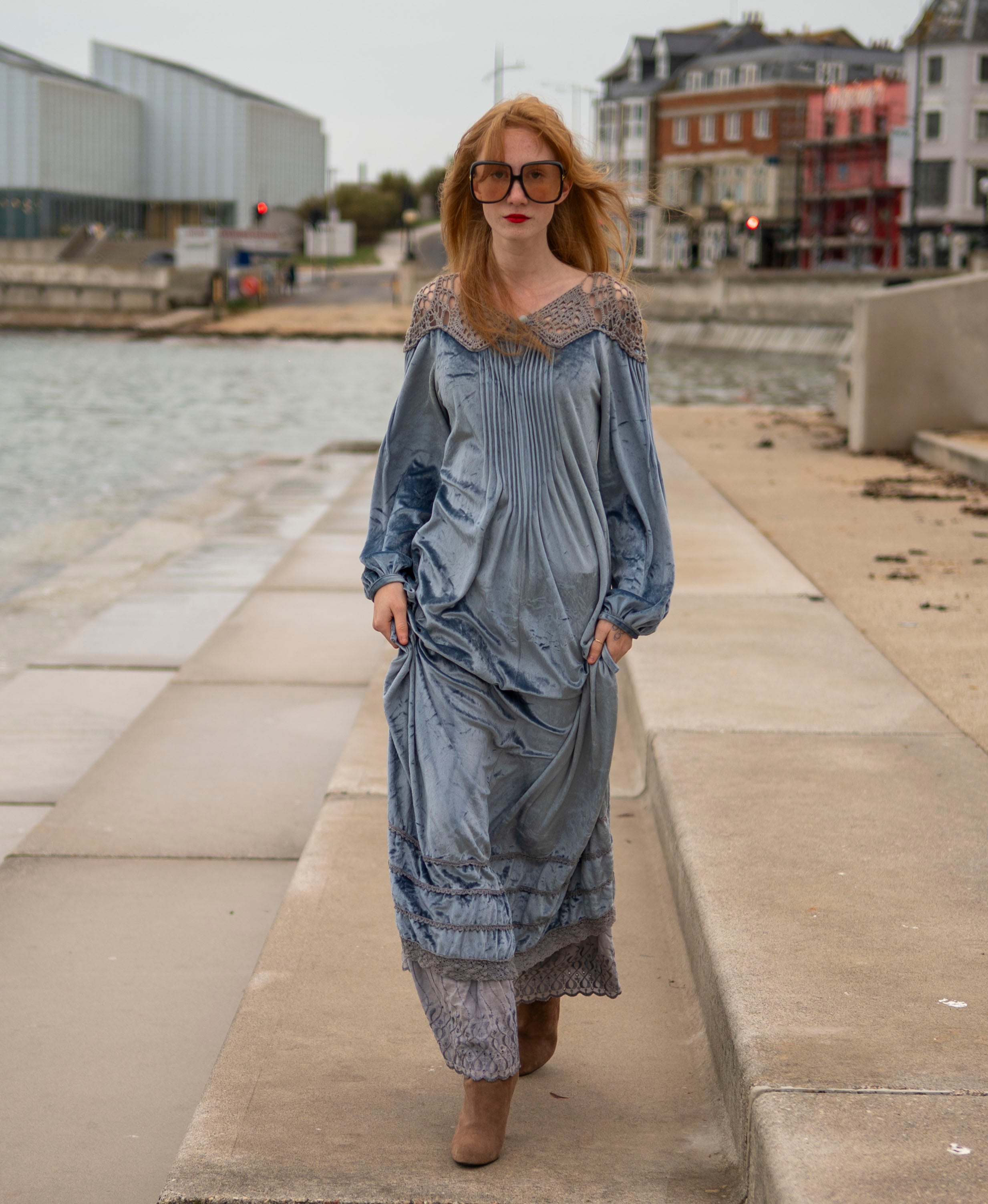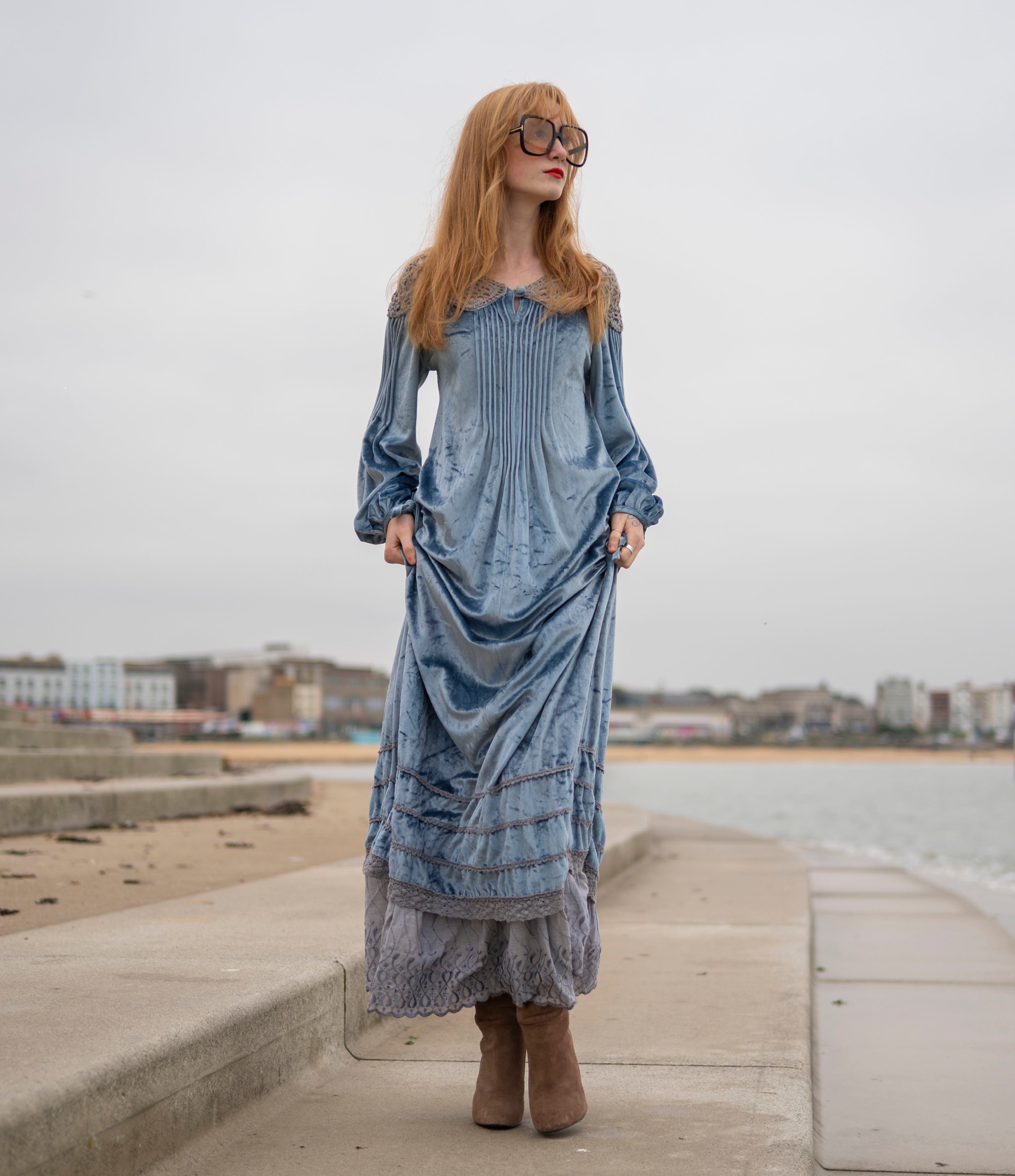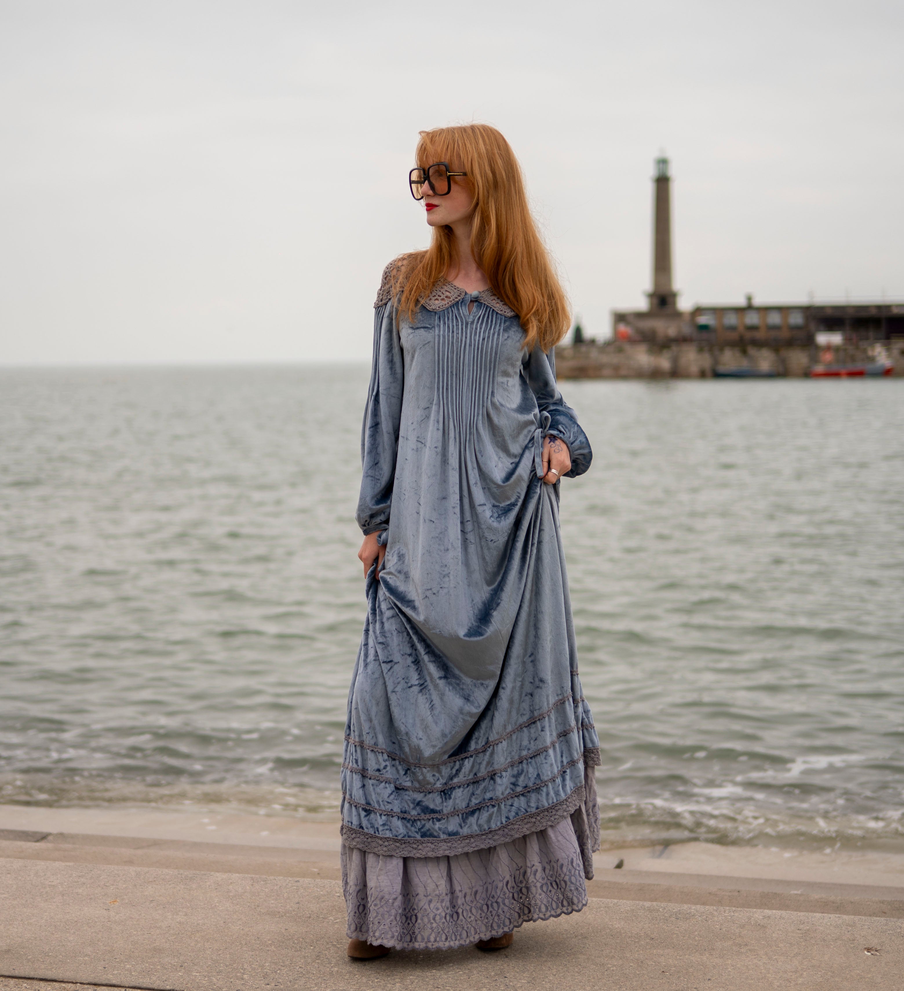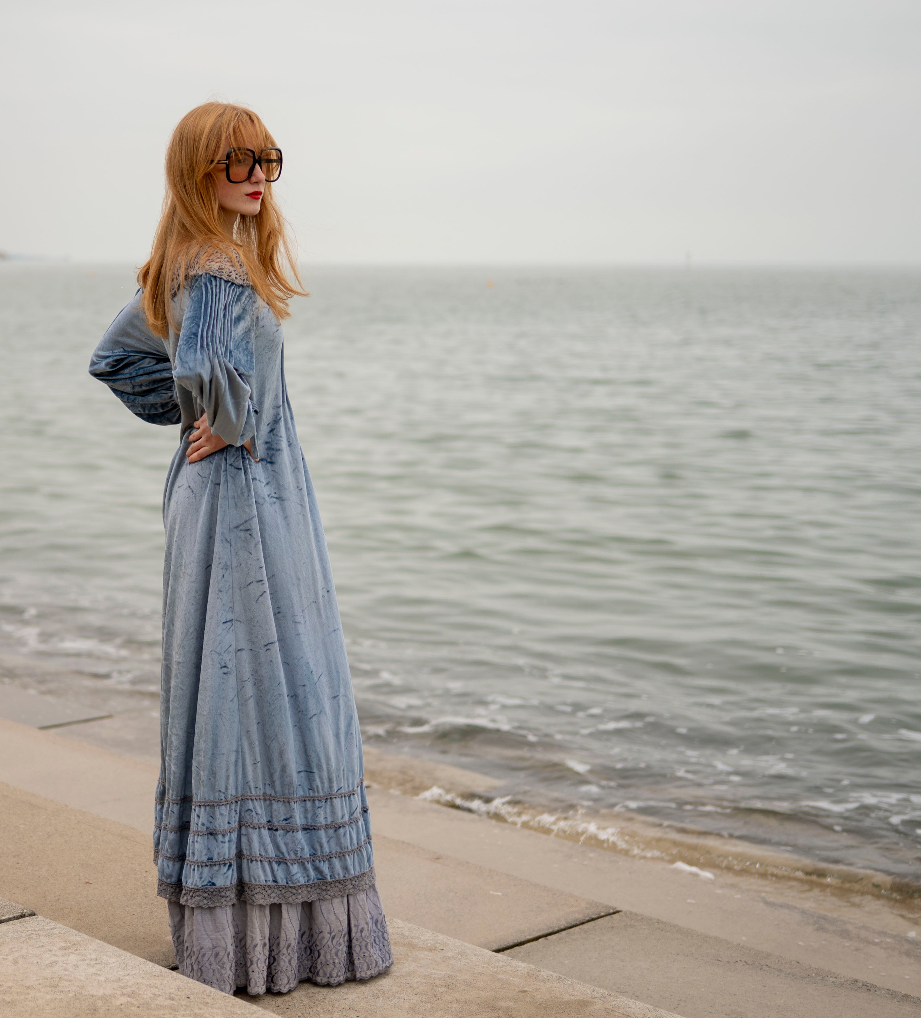 Cut from a soft, dusky ice blue crushed velour with grey -peekaboo- crochet detail on the neck and shoulders