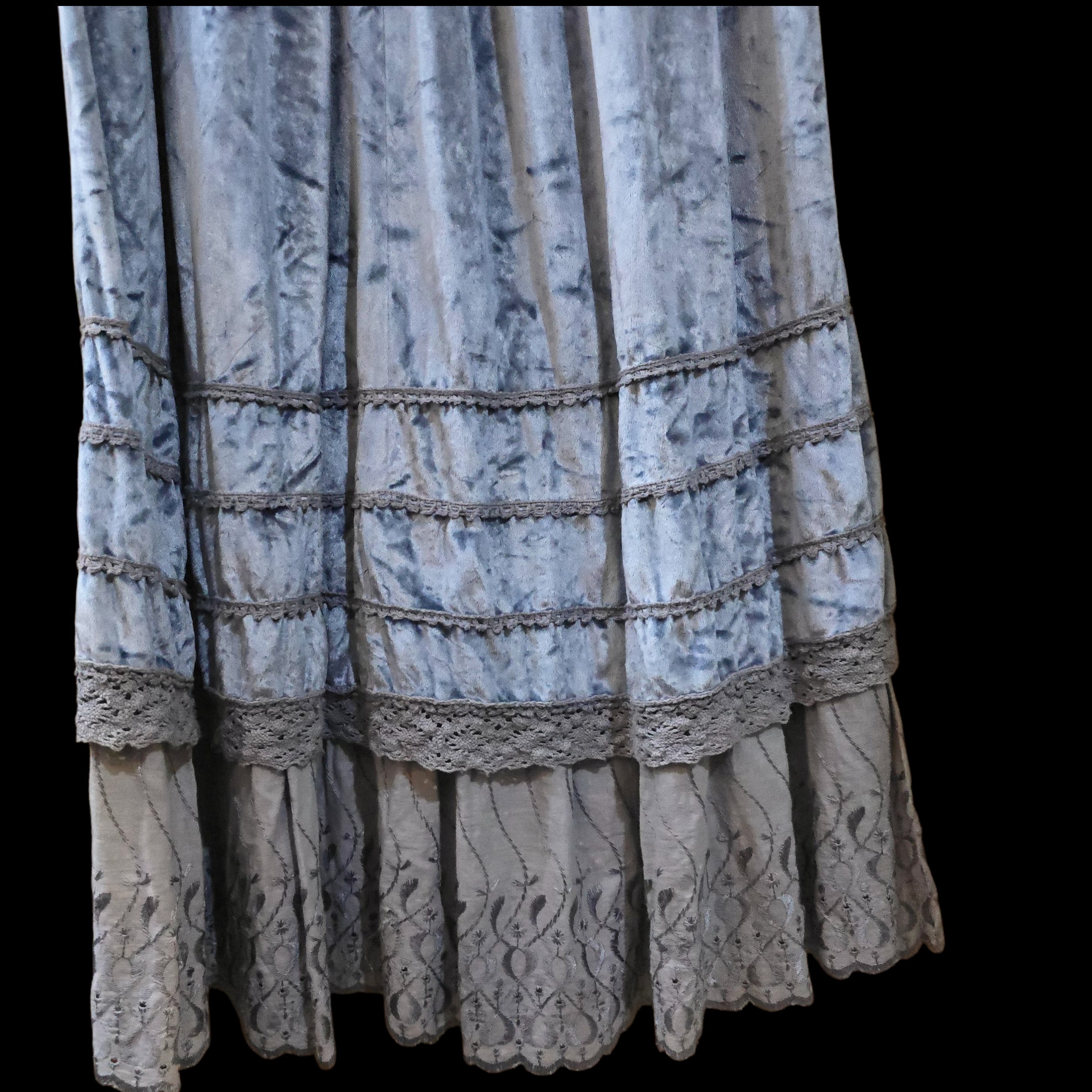 Crochet trim on the skirt, and theres a layer of embroidered viscose on the hem.