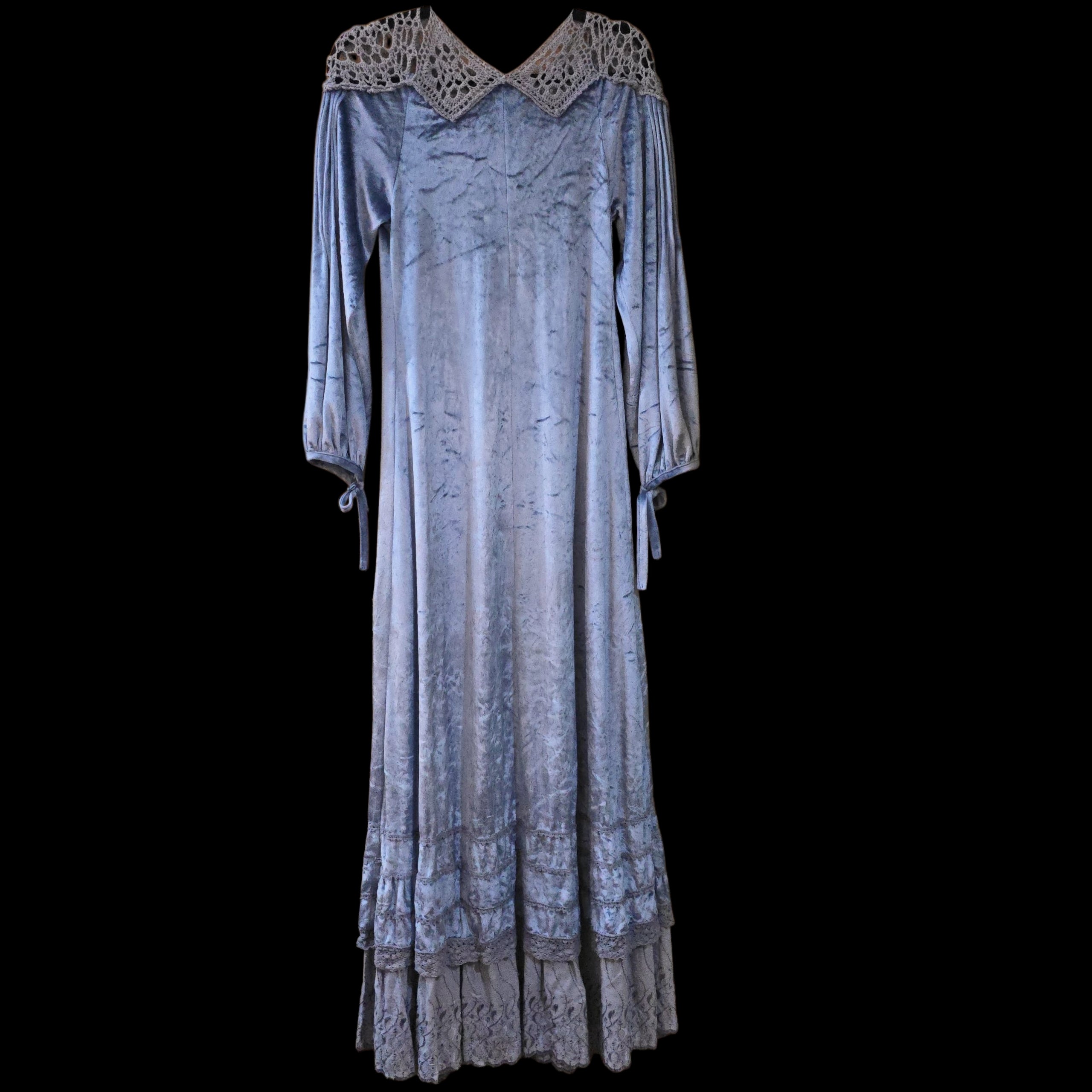 A really beautiful crushed velvet, crochet and indian viscose maxi dress dating from the 1970s - M 10