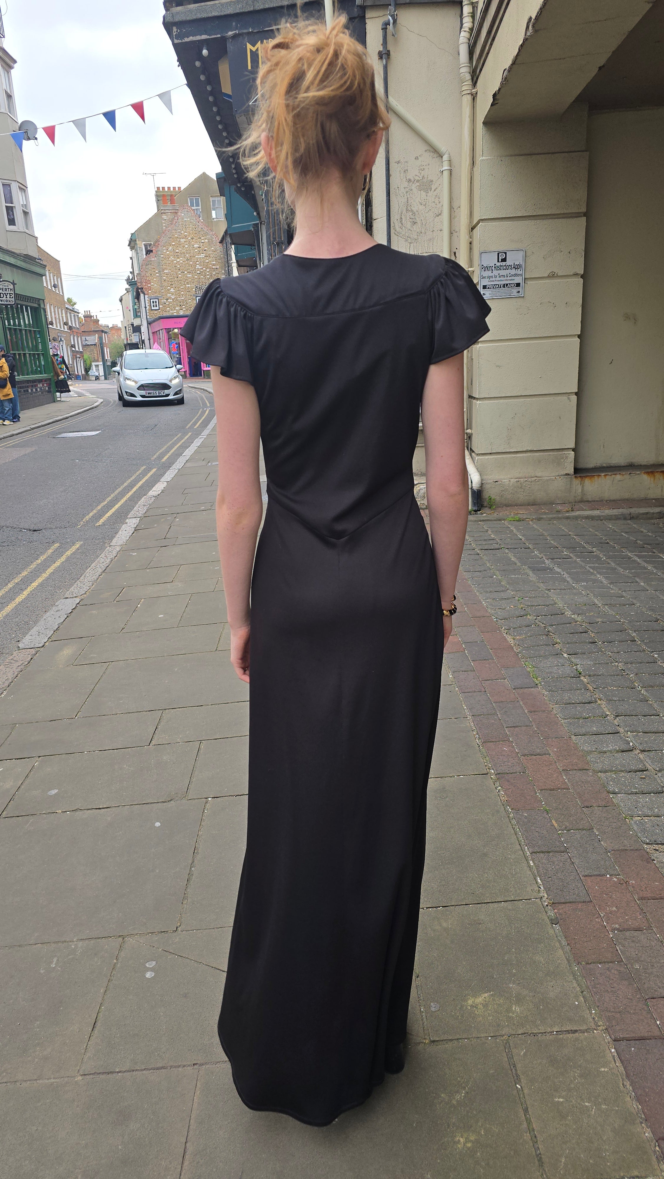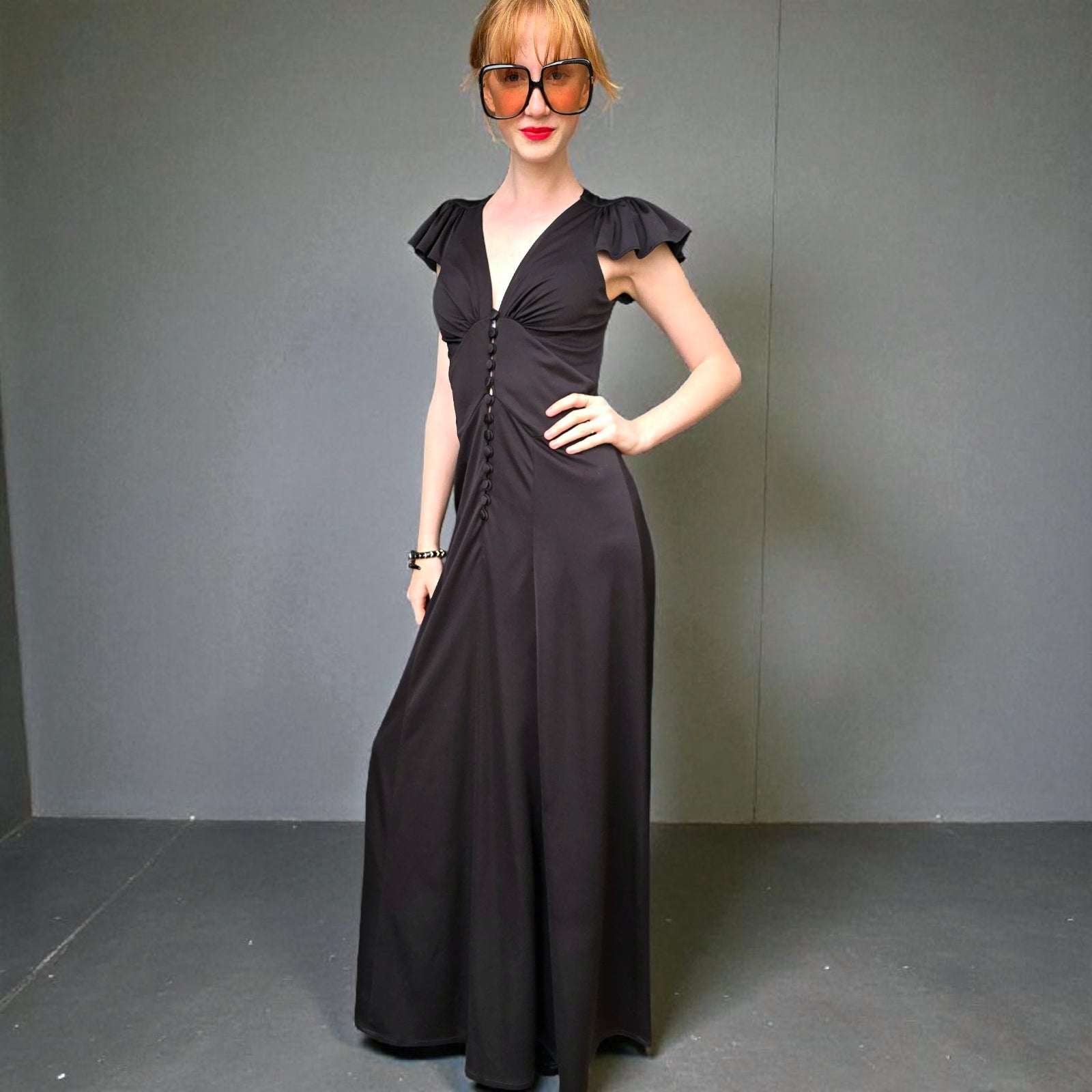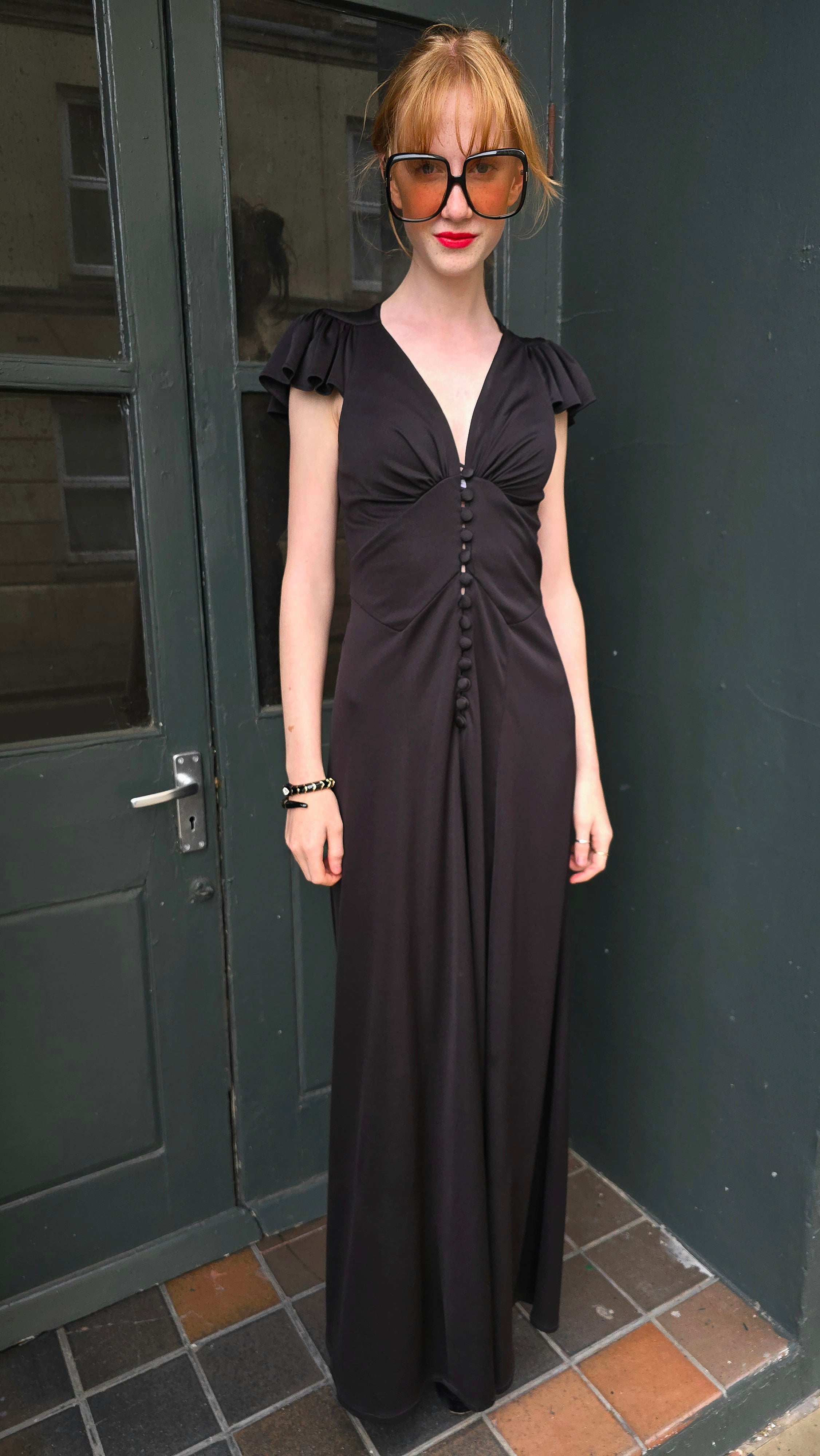 In a slinky Inky Black poly jersey and has a v neck with button down front and short, flutter sleeves