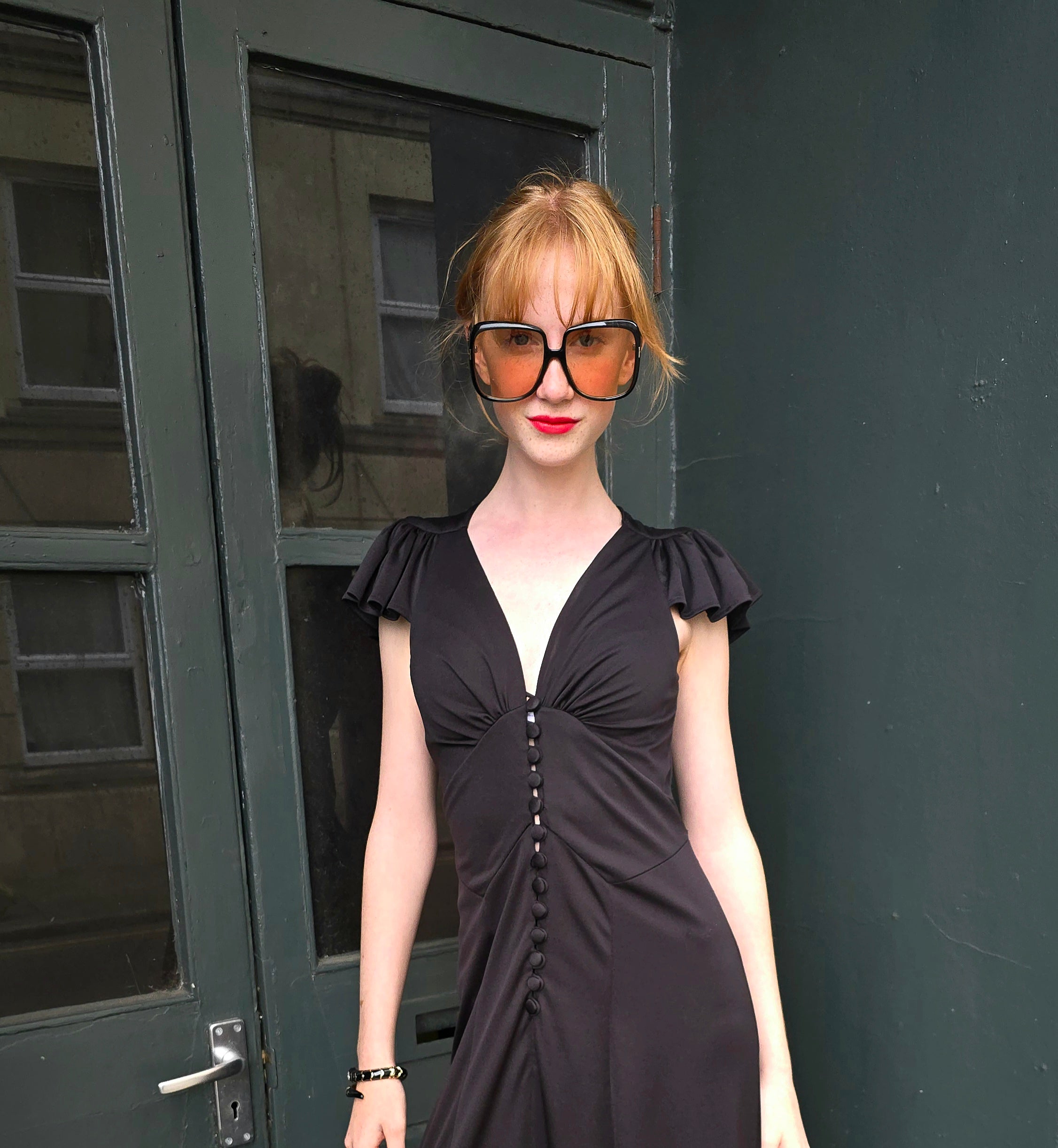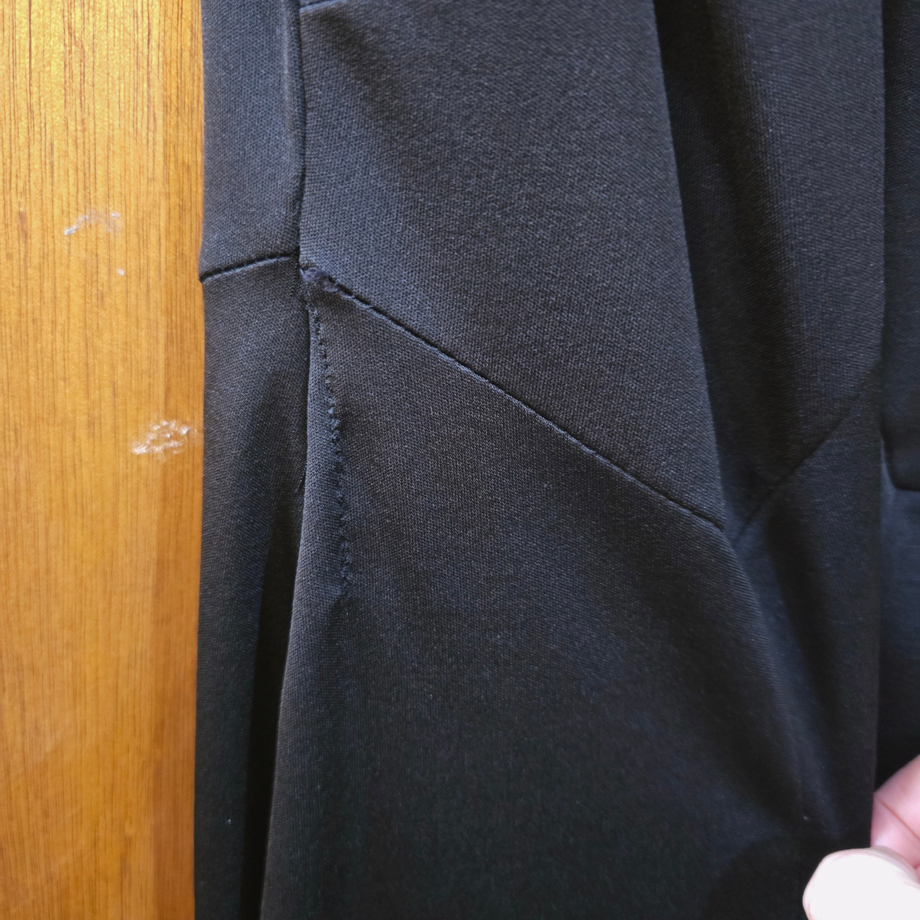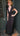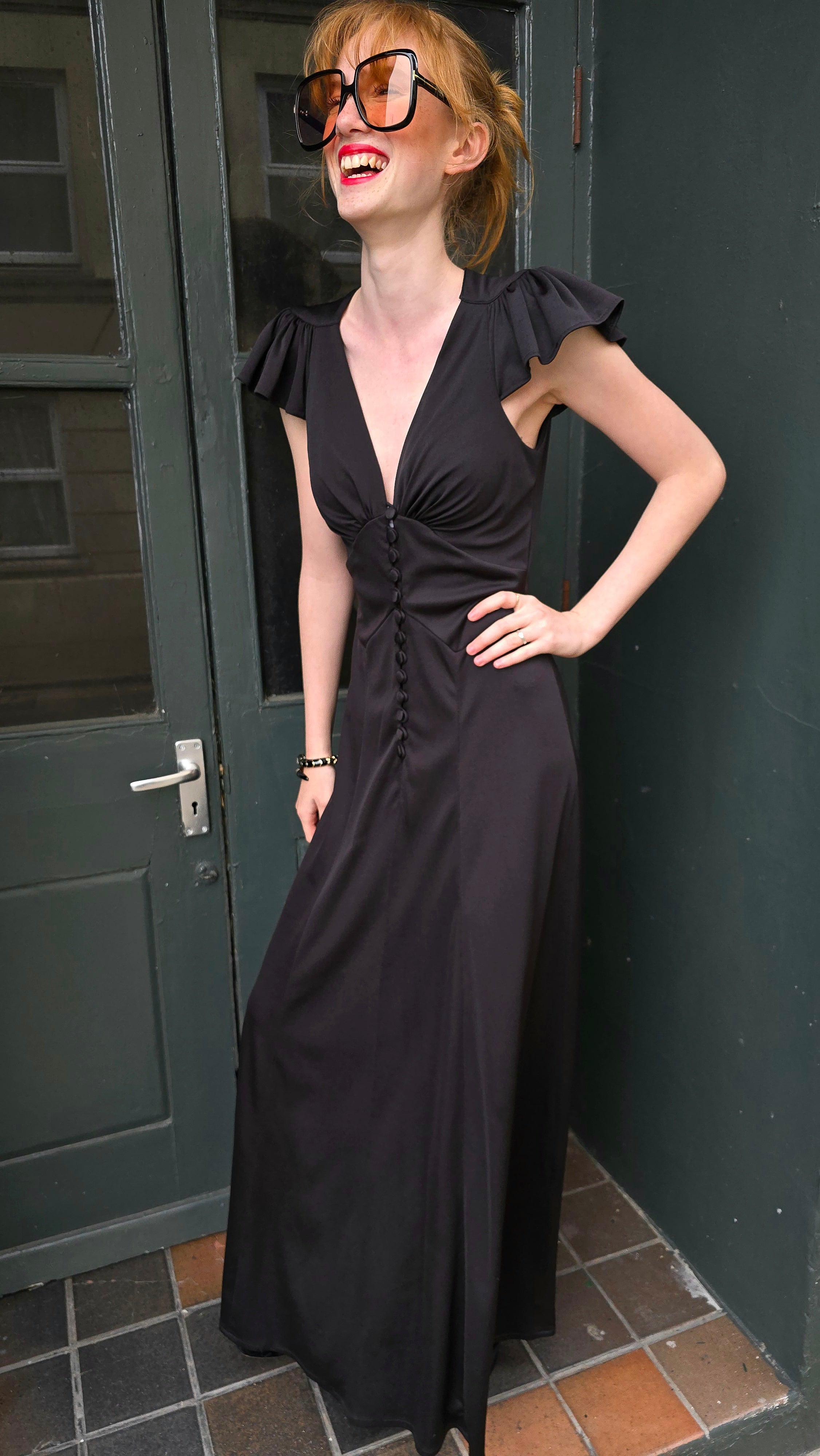In a slinky Inky Black poly jersey and has a v neck with button down front and short, flutter sleeves