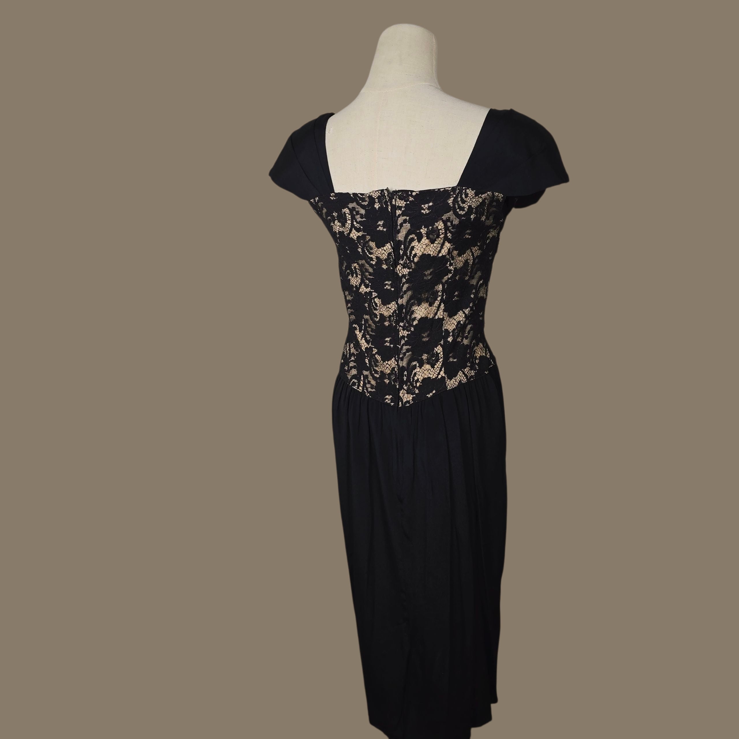 Knee length with a black skirt and black lace bodice over a nude acetate which gives the illusion of being naked underneath!