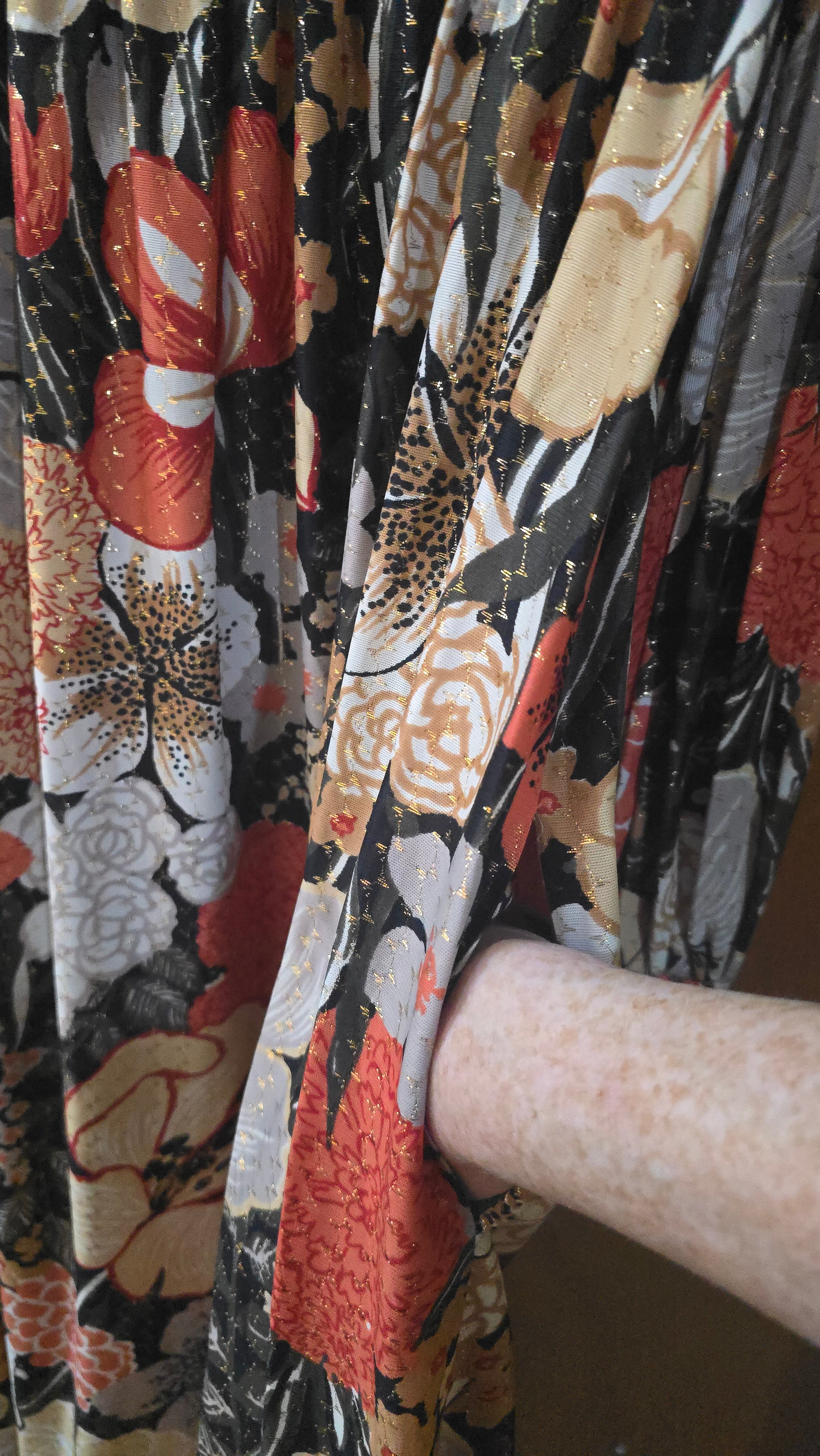 In a beautiful floral with gold metallic threads running through which catches the light and sparkles like a dream!