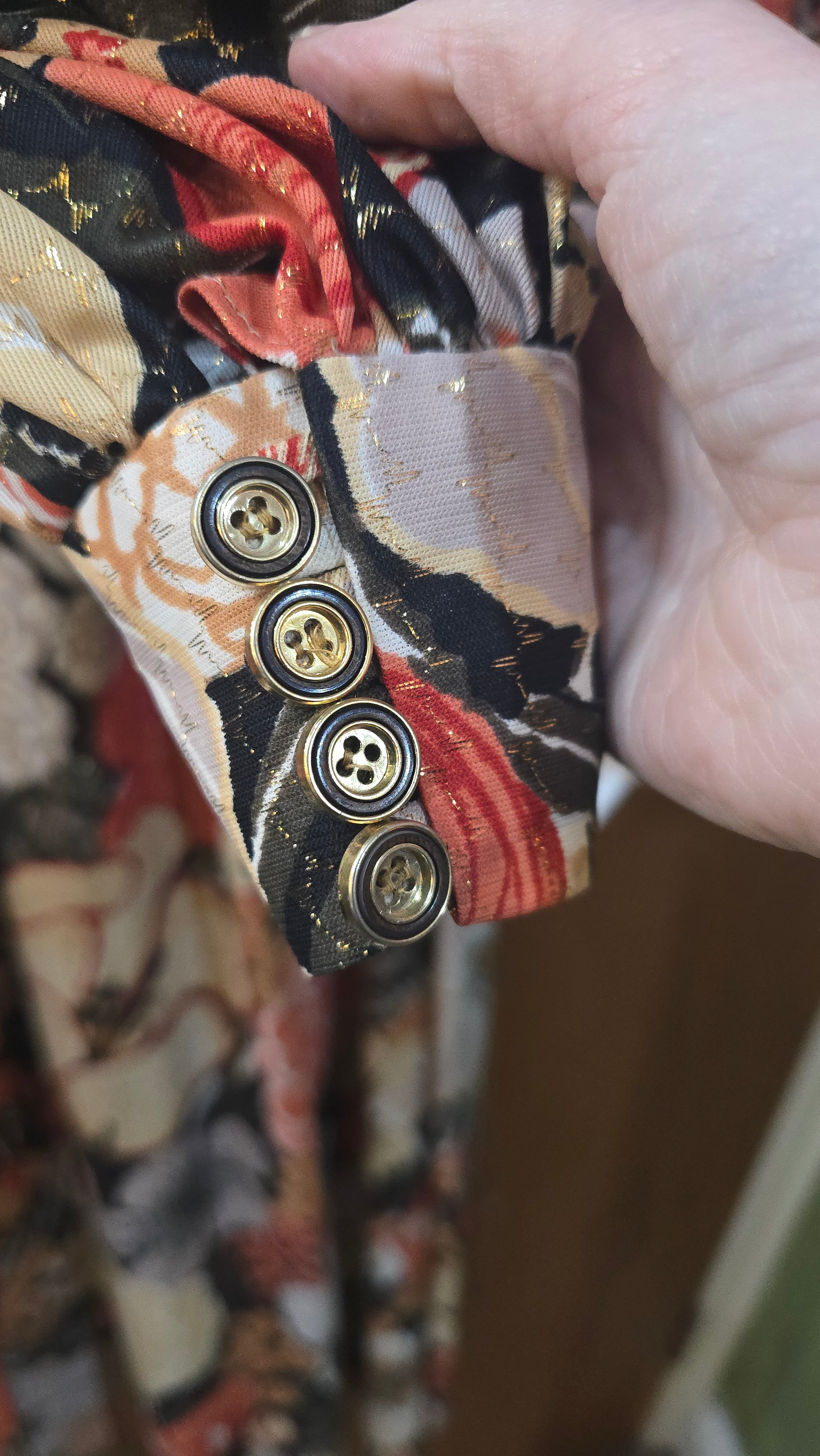 Metallic floral maxi dress cut empire style with statement bishop sleeves which have wide cuffs with 4 buttons
