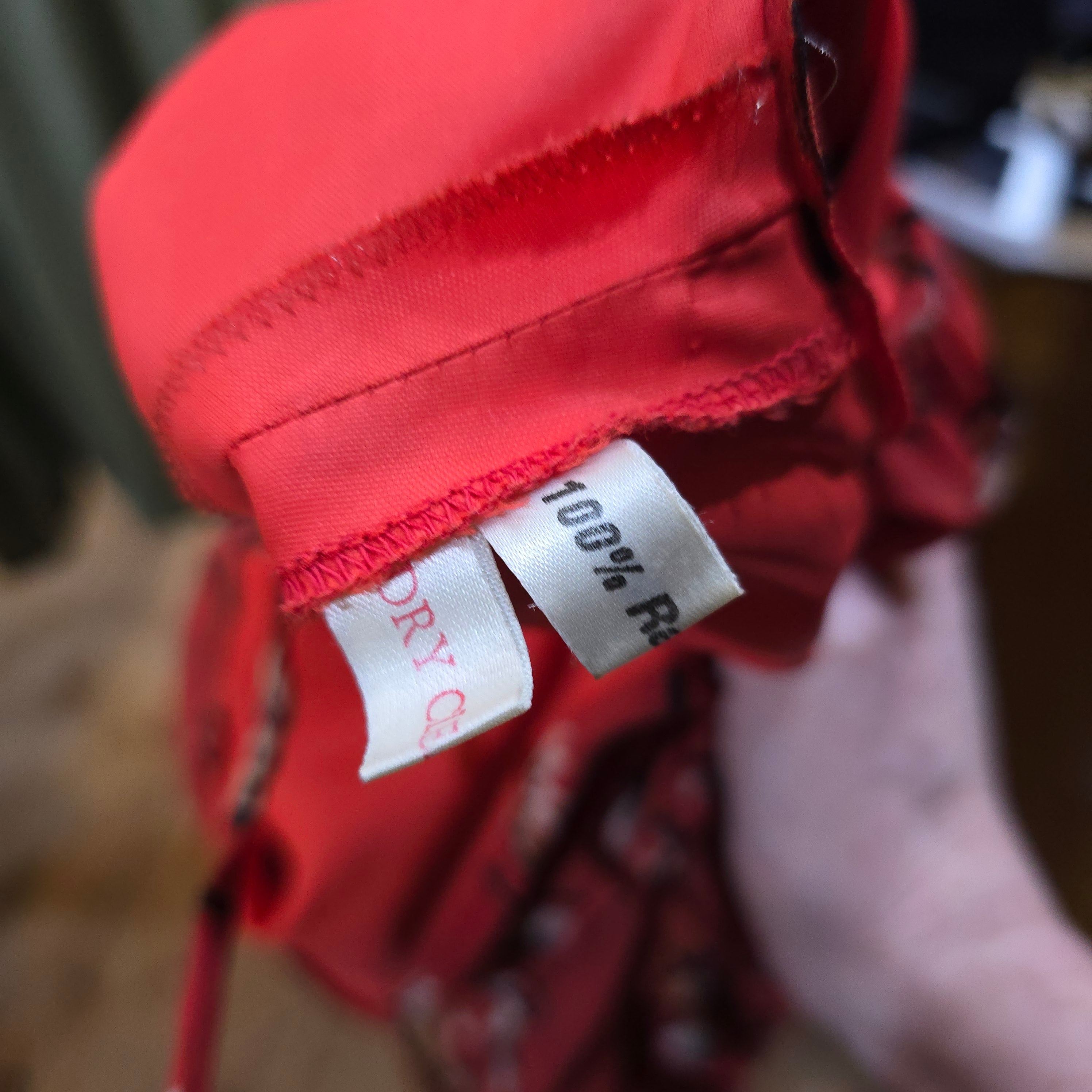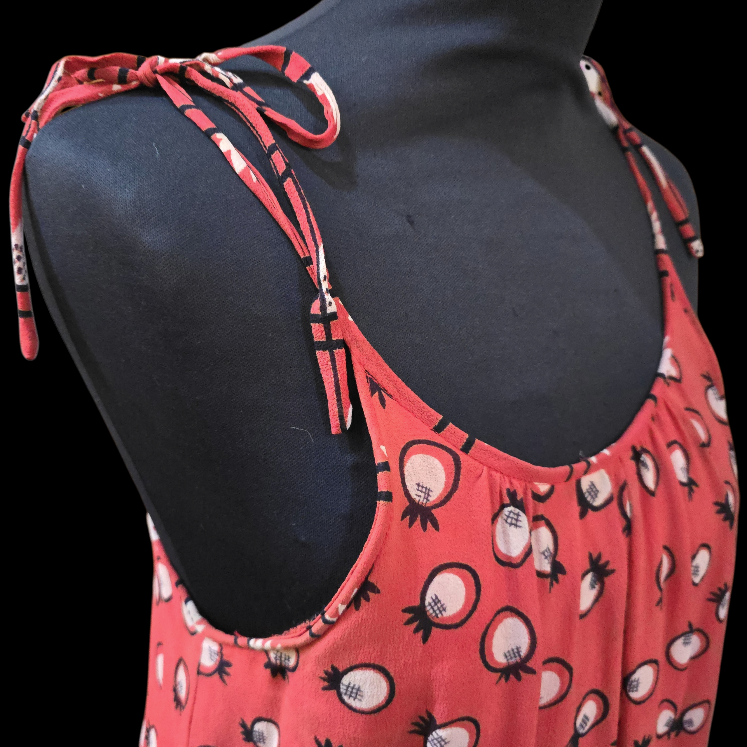 Has shoestring ties on the shoulders, and is approx a size 10. Isn't as vibrant as shown in the main images but more like the product shots..so more like a muted Tomato Red