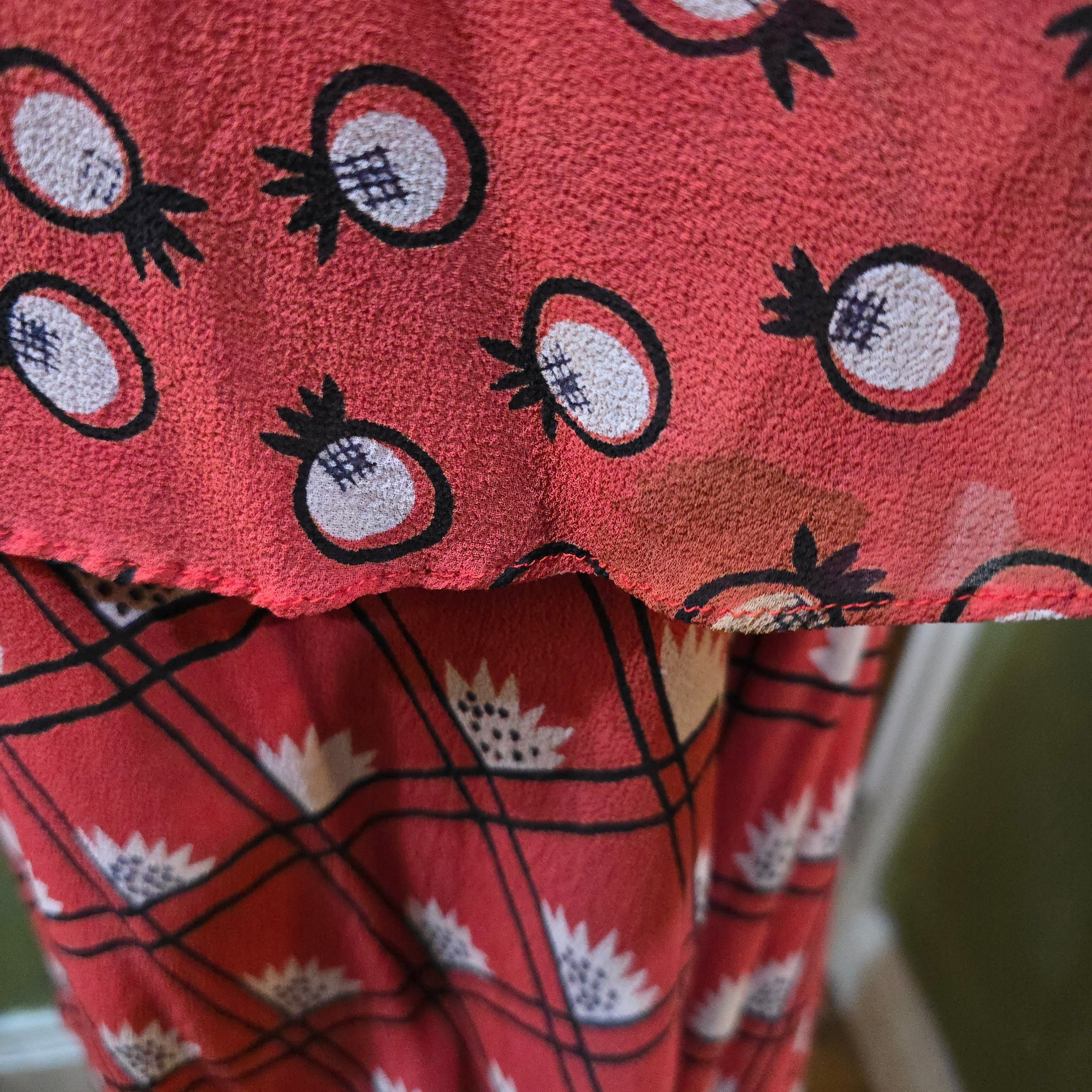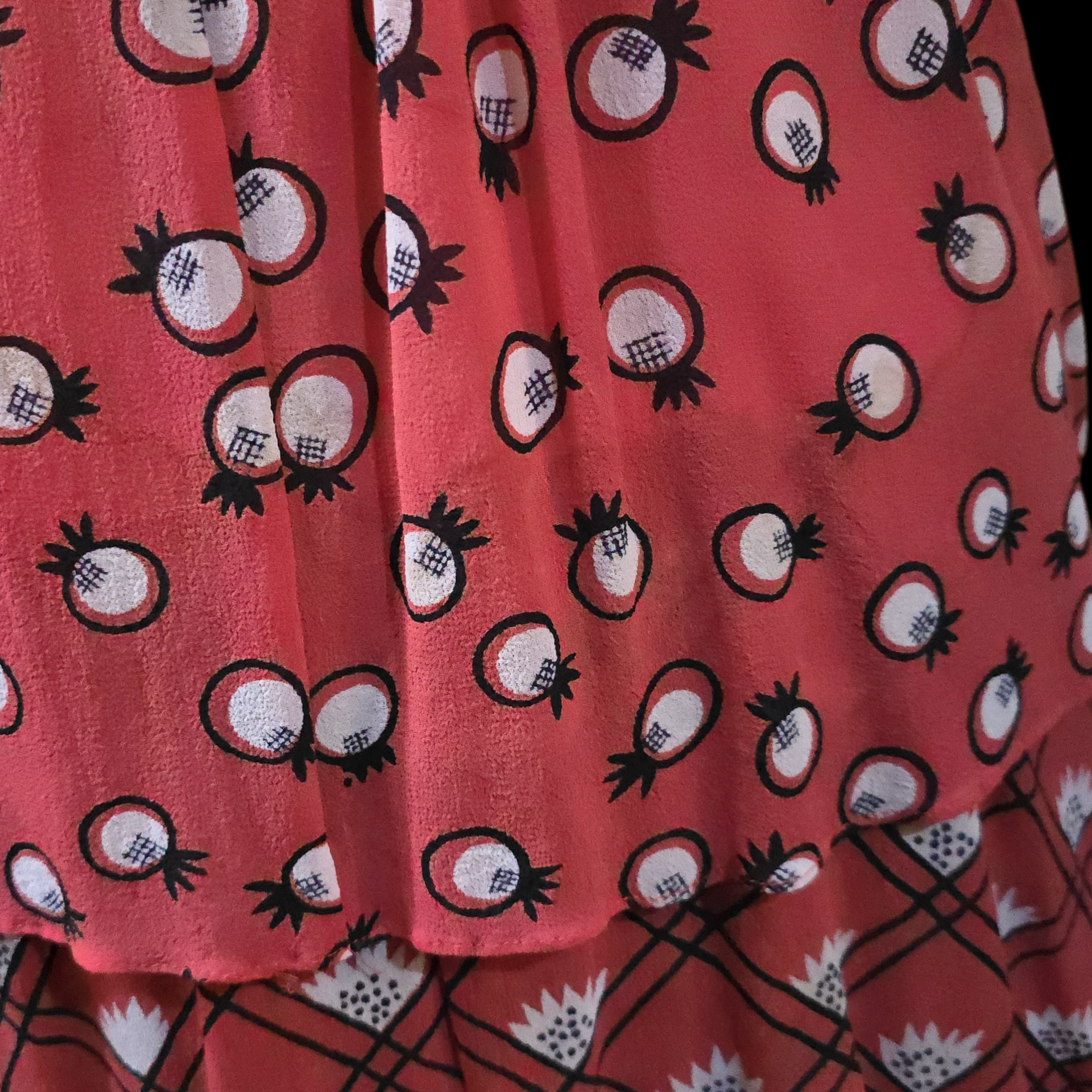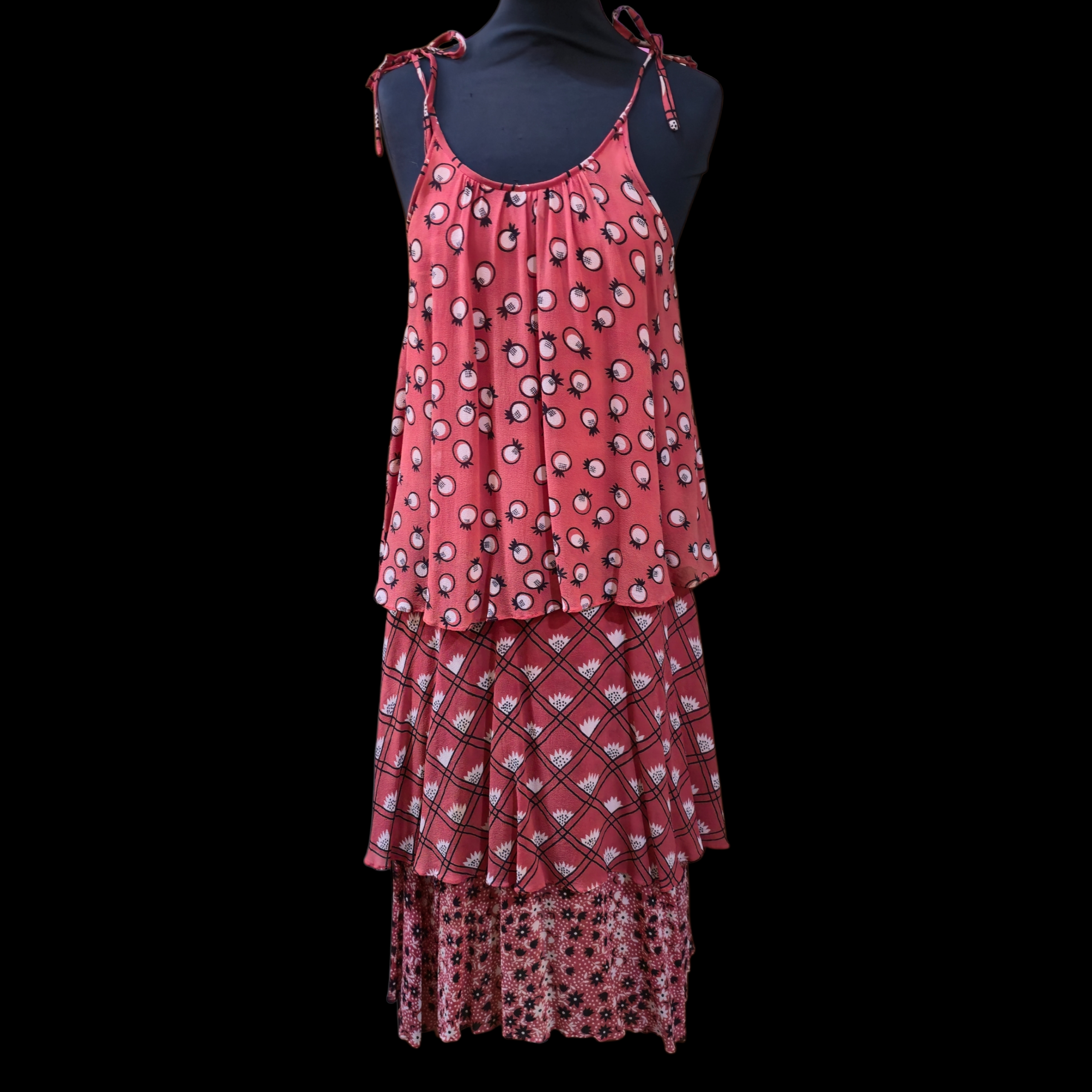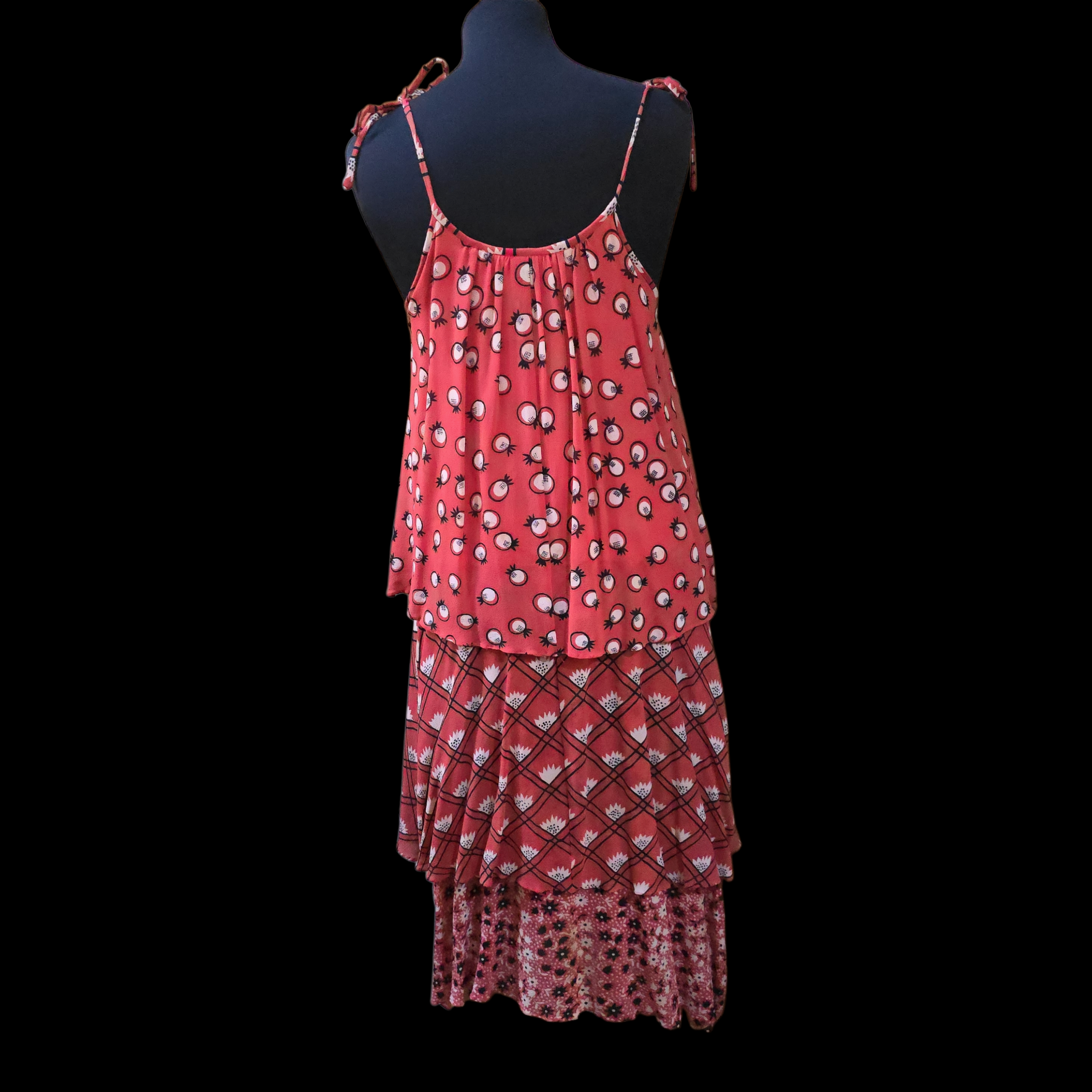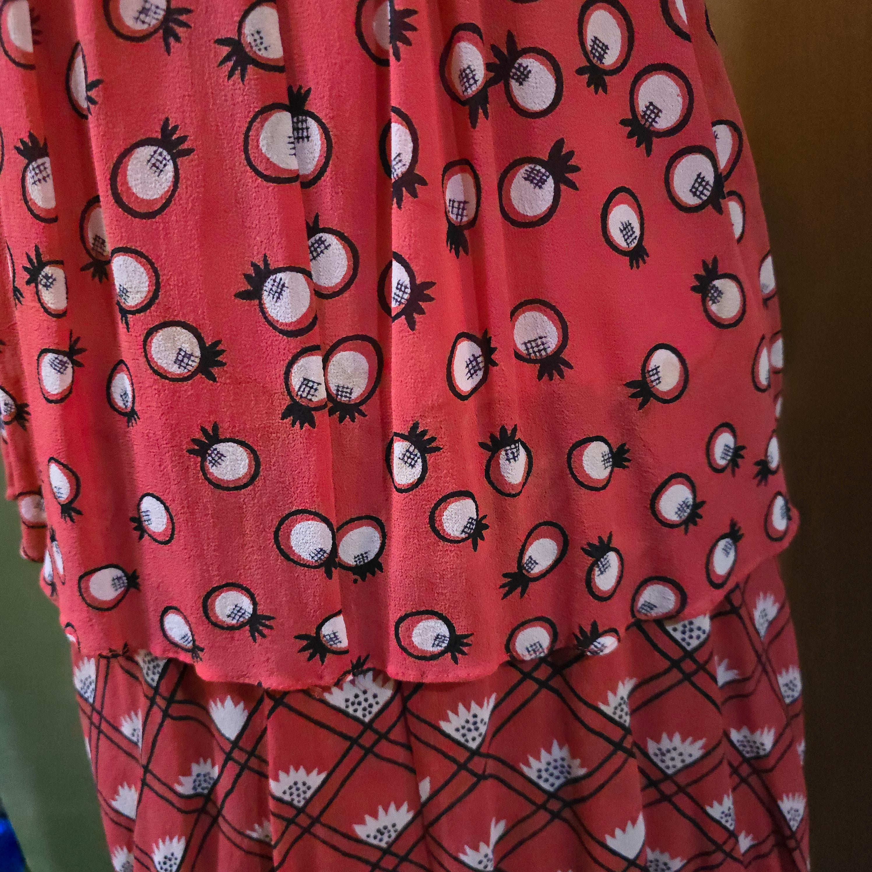 In a Tomato Red (slightly more muted than shown in some of the pictures - more like the product shots rather than on the model) Moss Crepe, and has 3 tiers of ruffles cascading down to just below the knee, and each tier has a different Birtwell design on it in Black and Cream and is on a Rayon lining.